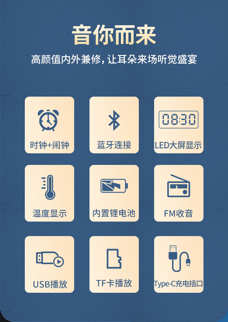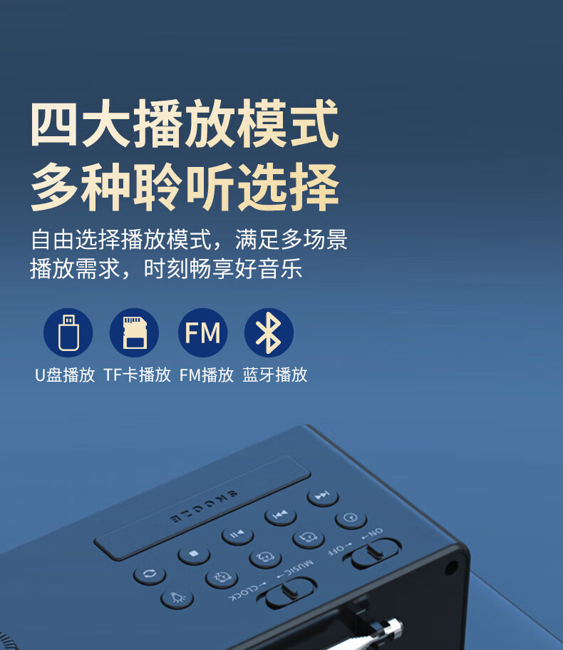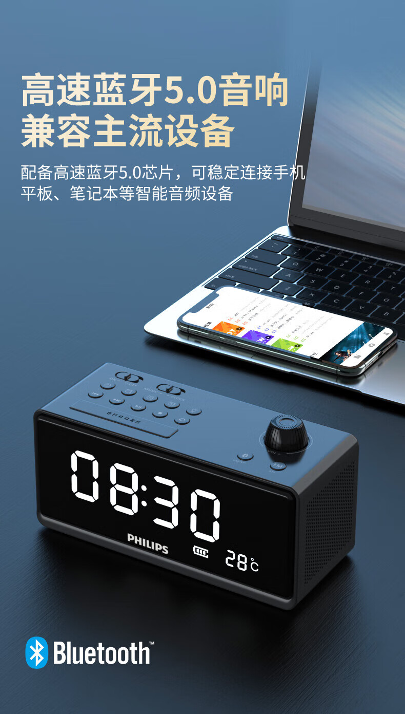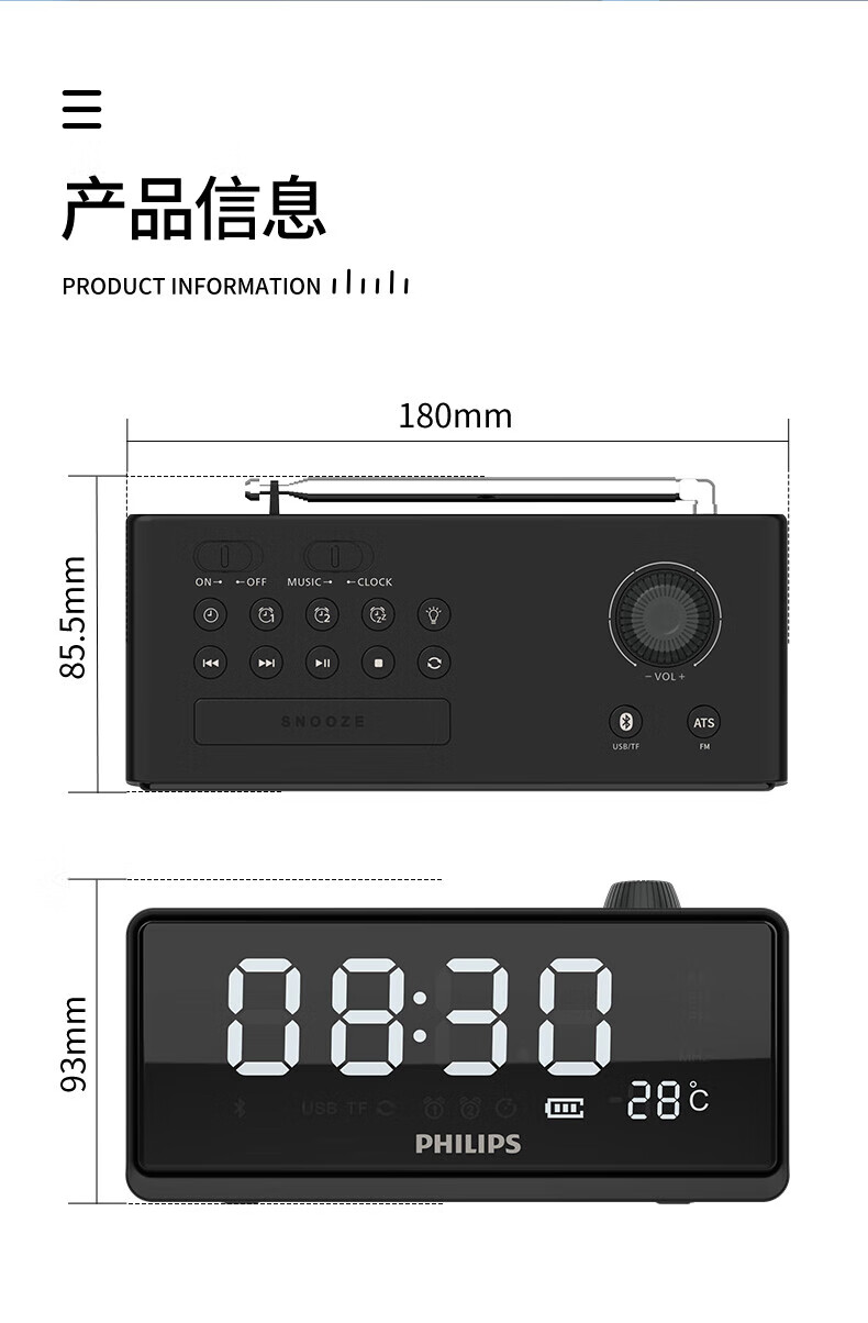 时钟+双闹钟+睡眠;;支持蓝牙播放;;LED大屏显示
