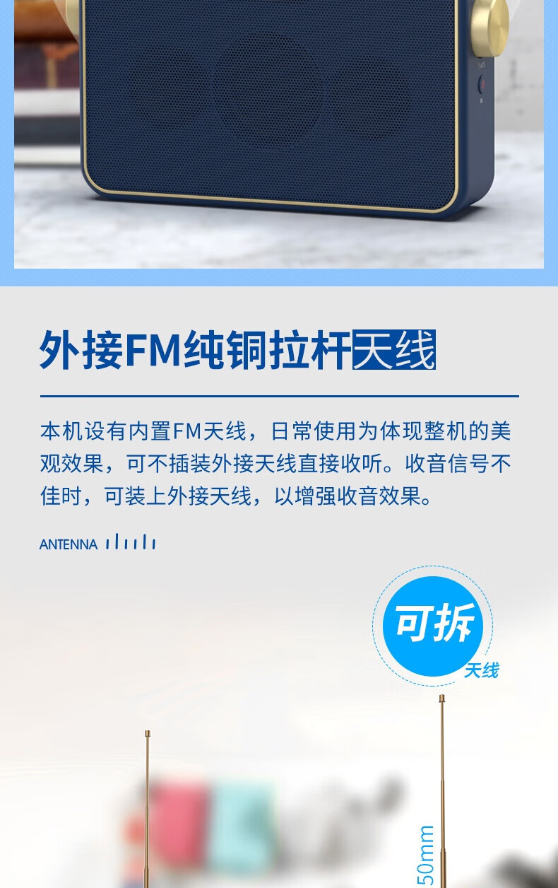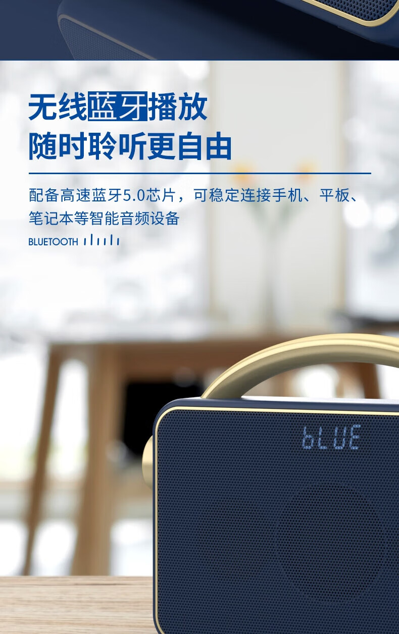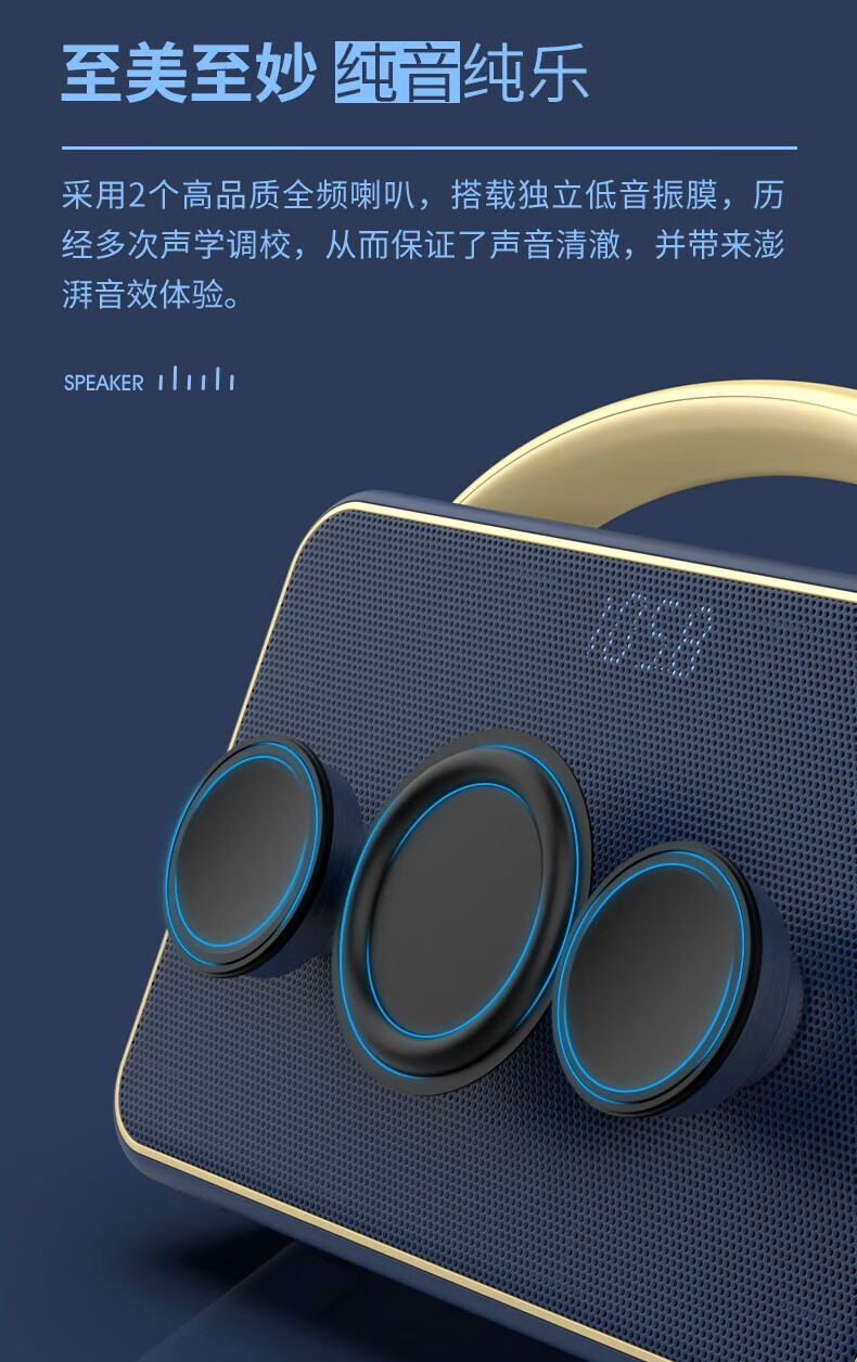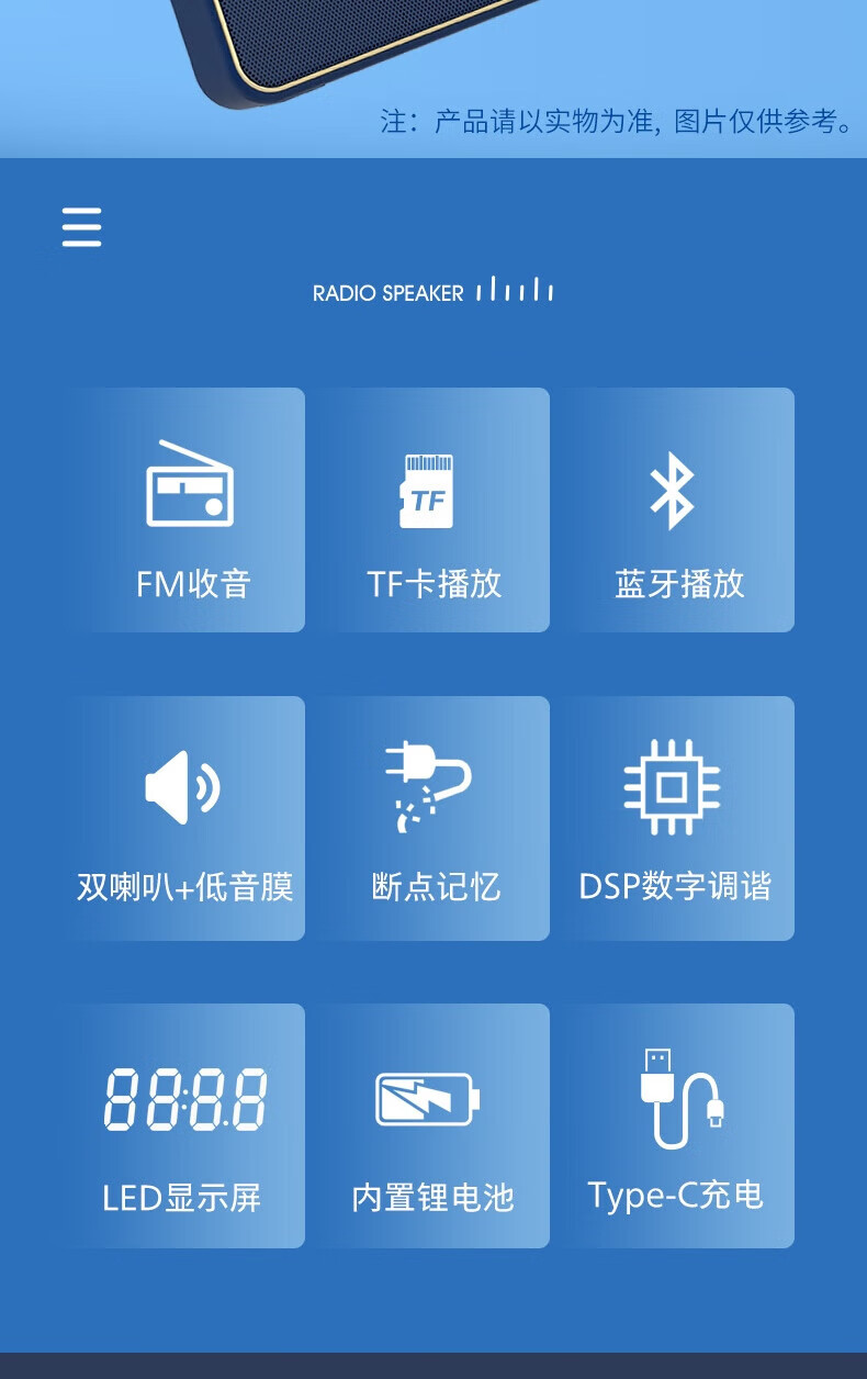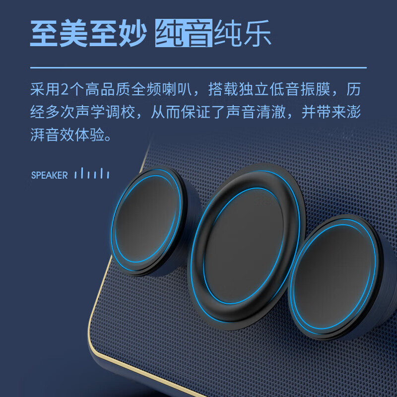 支持FM调频;内置2.0喇叭+低音振膜;锂电,便携,简约好音质