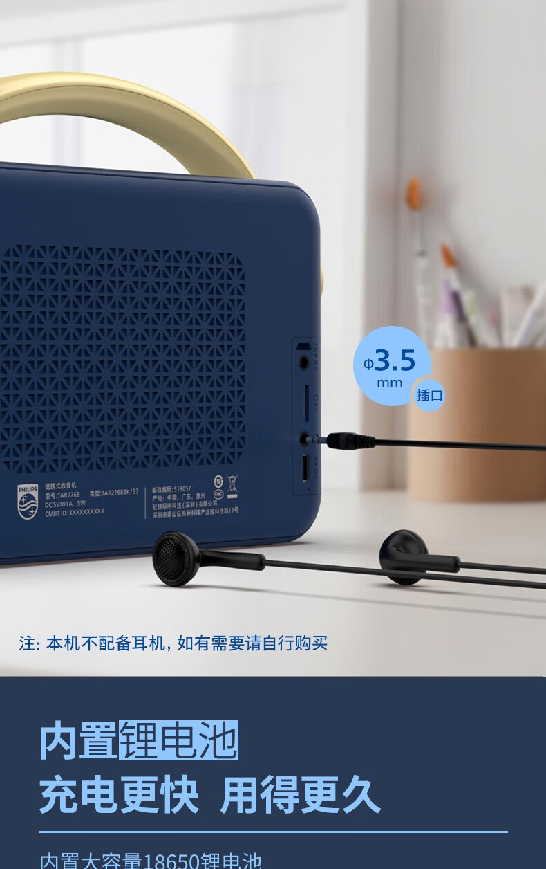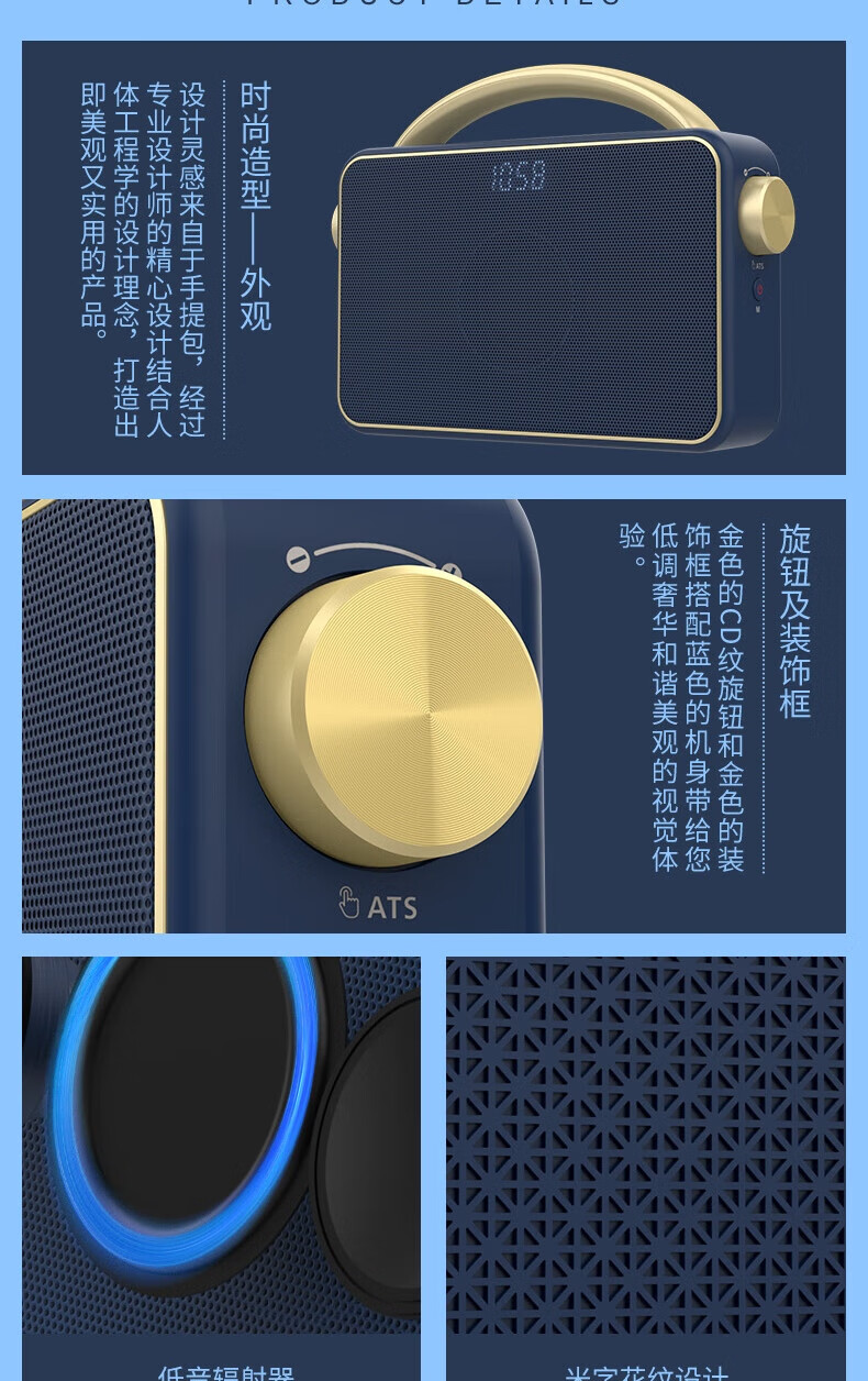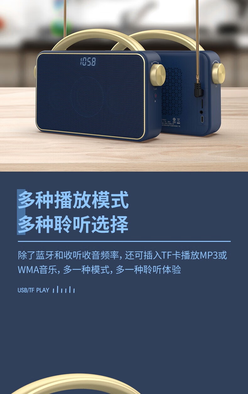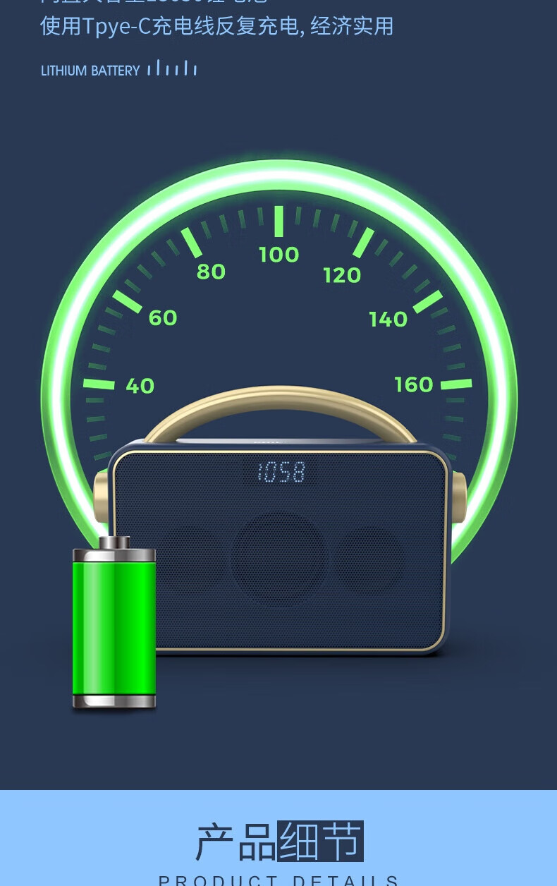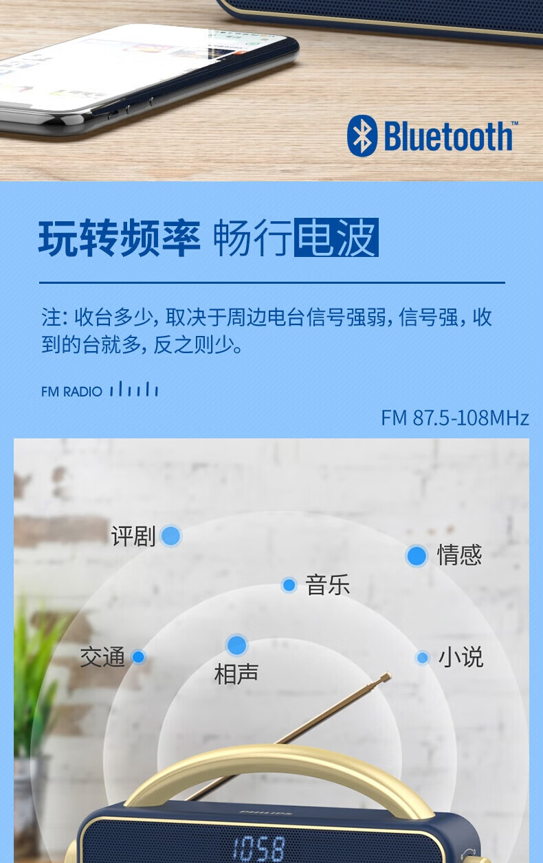 支持FM调频;内置2.0喇叭+低音振膜;锂电,便携,简约好音质