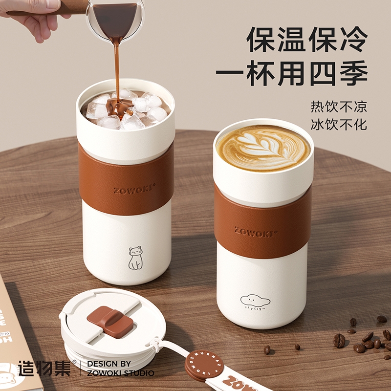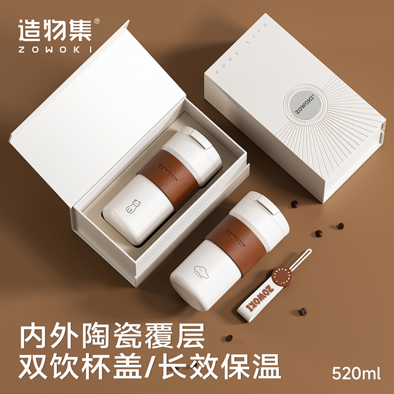 双饮口设计,适用不同场景;便携提绳设计,方便出行;质感皮革杯套,高级又舒适