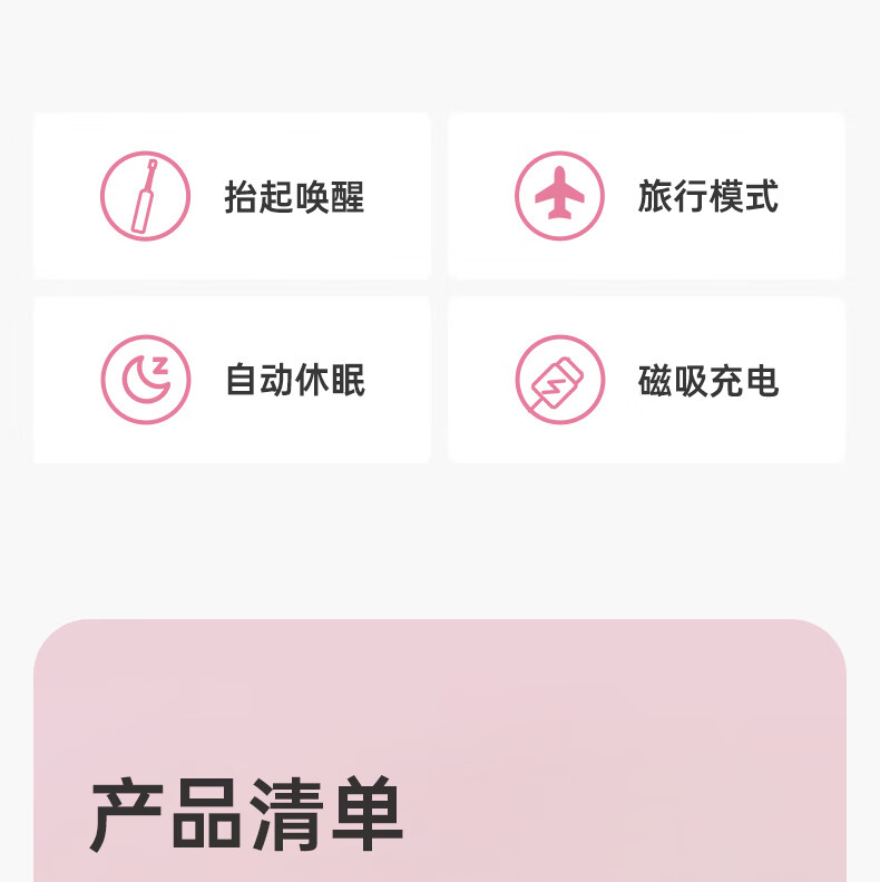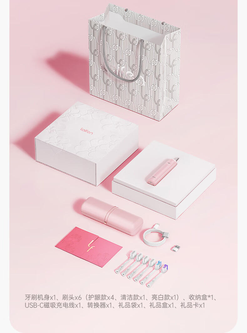 配置:牙刷机身*1,刷头*6(护龈款*4,清洁款*1,亮白款*1),收纳盒*1,USB-C磁吸充电线*1,转换器*1,礼品袋*1,礼品盒*1,礼品卡*1