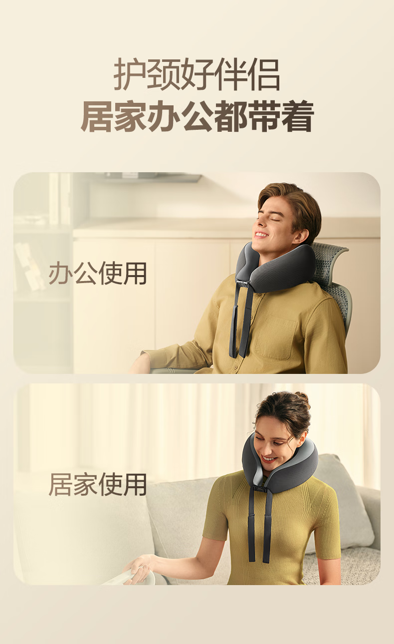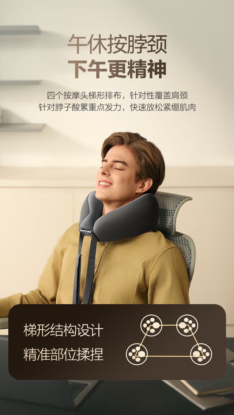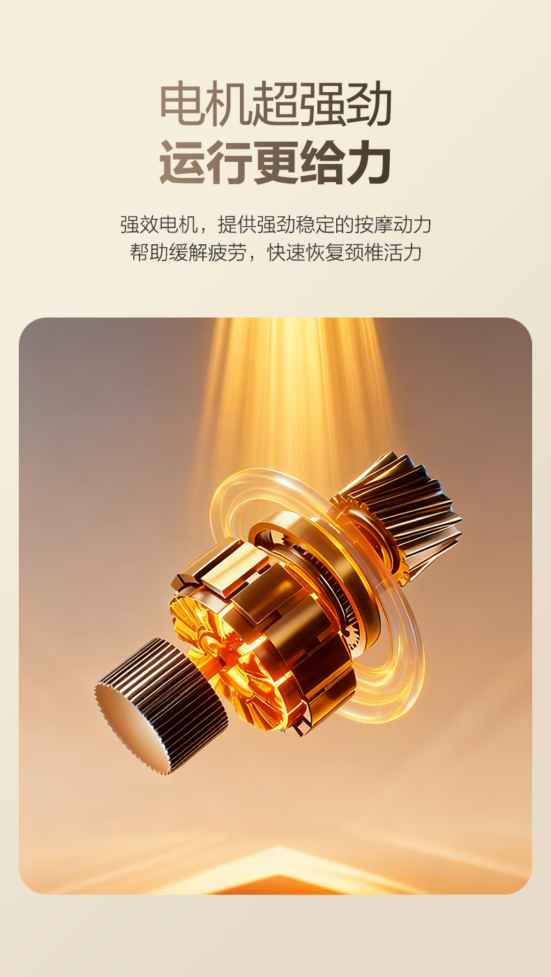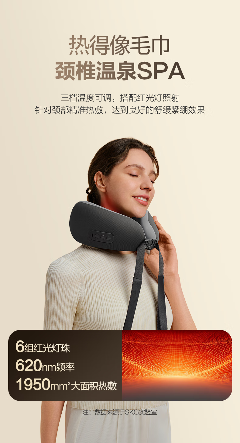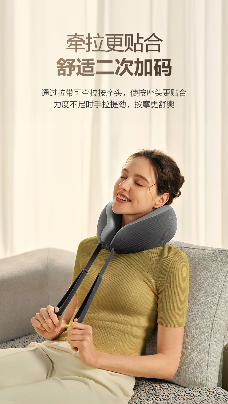6颗红光灯珠,、1950mm²的大面积热敷;4颗花瓣式滚转按摩头,精准定位肩颈高频疼痛点;3档按摩速度可供选择,配备可牵拉手拉带