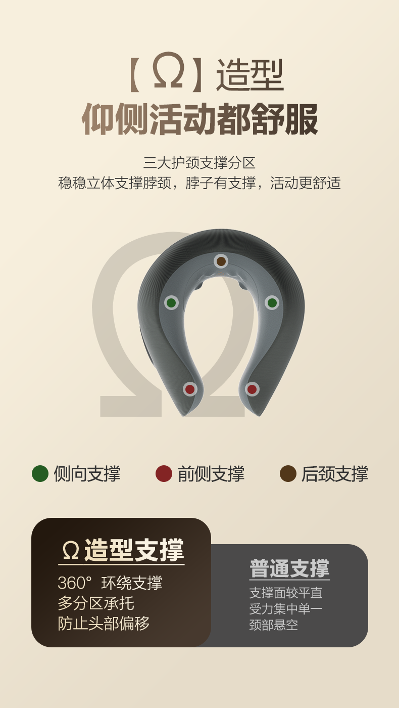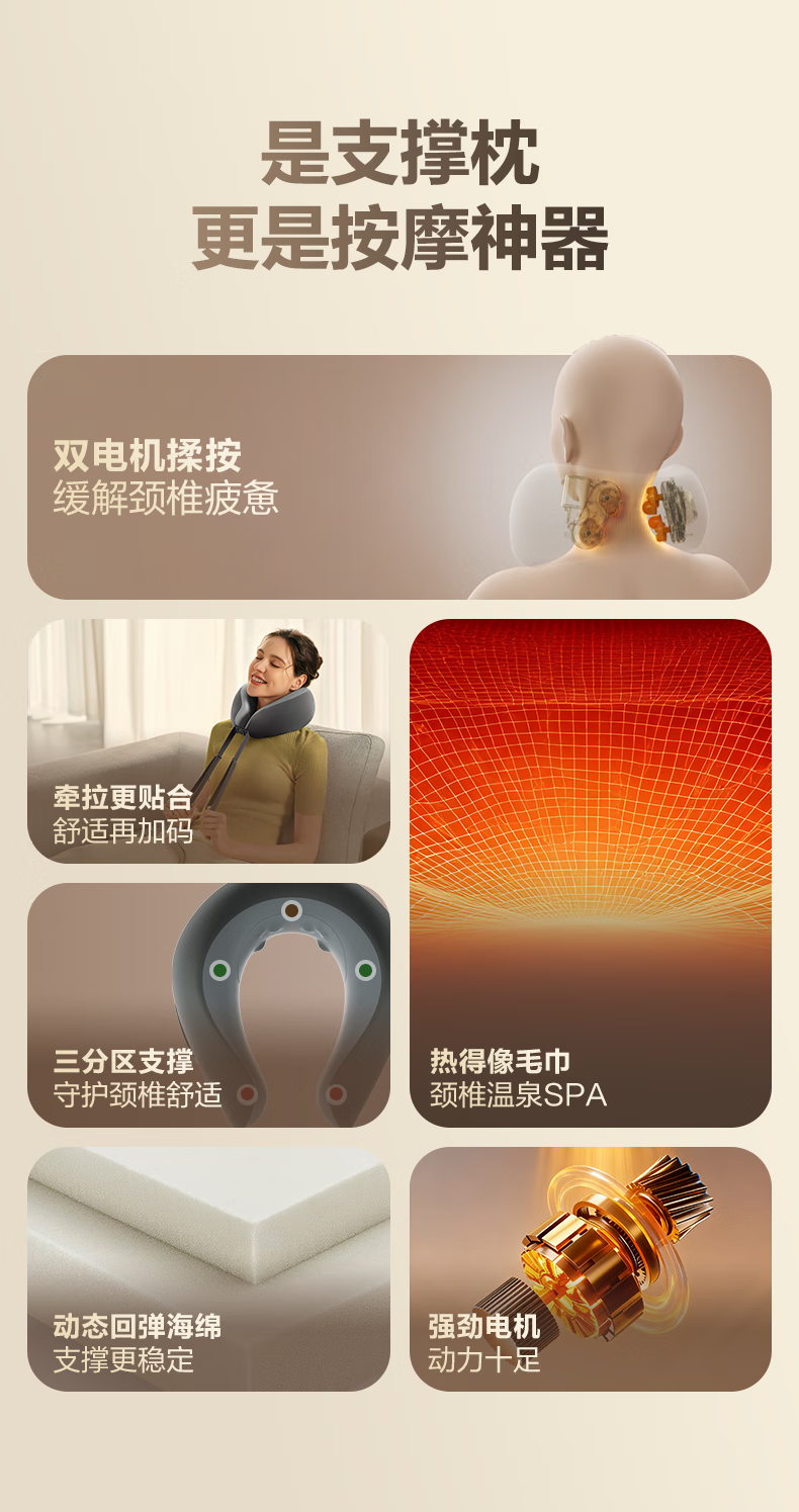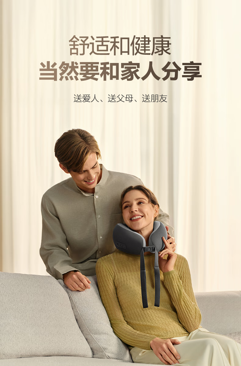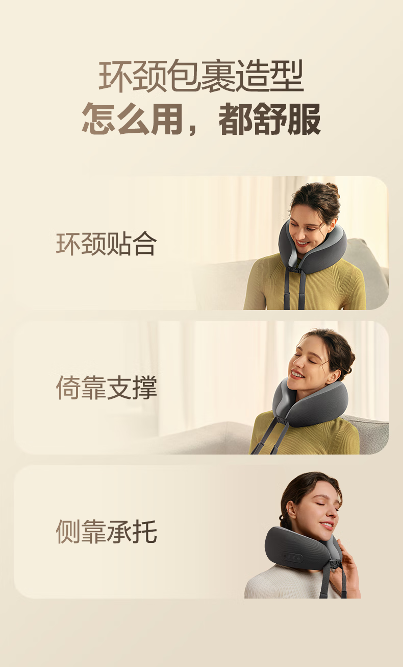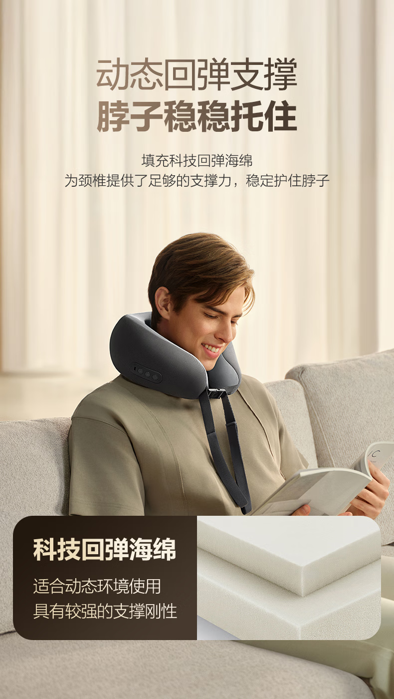 6颗红光灯珠,、1950mm²的大面积热敷;4颗花瓣式滚转按摩头,精准定位肩颈高频疼痛点;3档按摩速度可供选择,配备可牵拉手拉带