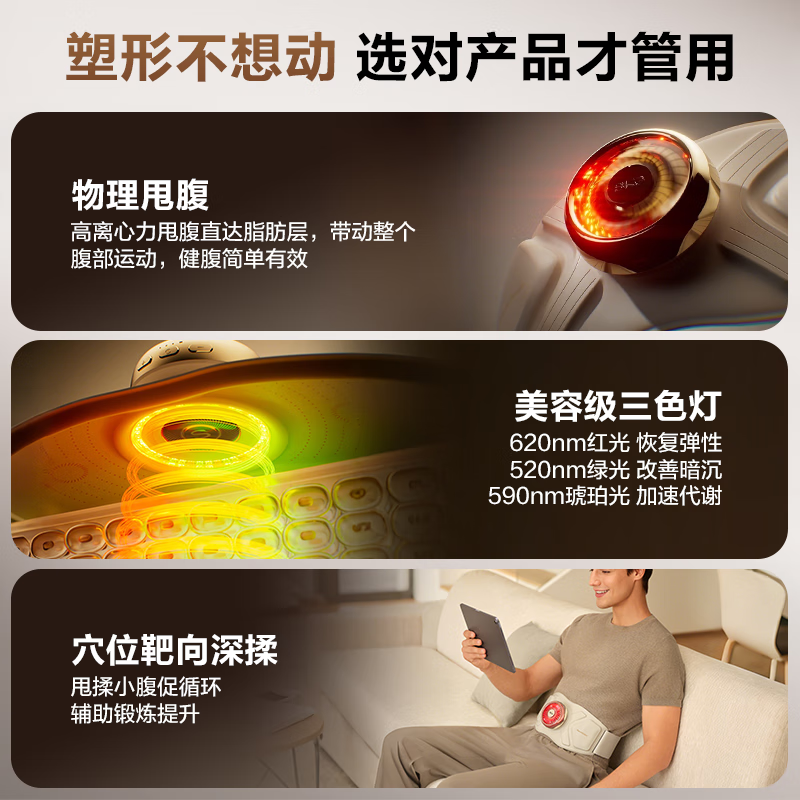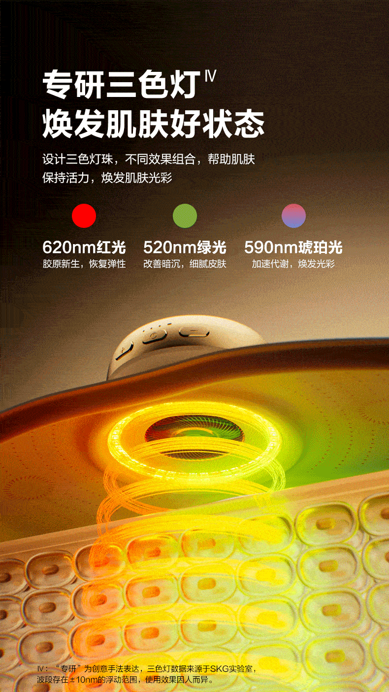 大面积热敷×锁温聚能仓;45颗红绿黄三色美容灯+40颗红光灯珠;三重降噪技术