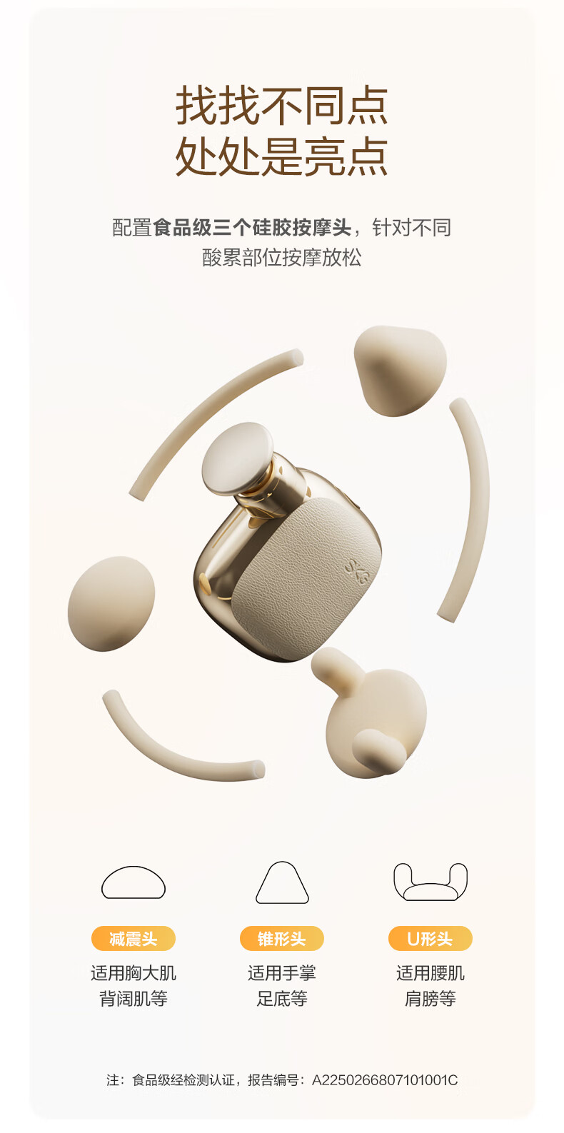 按摩头:原装铝合金平形+食品级硅胶球形/锥形/U形;配皮质收纳包+双层礼盒;精细4档变速