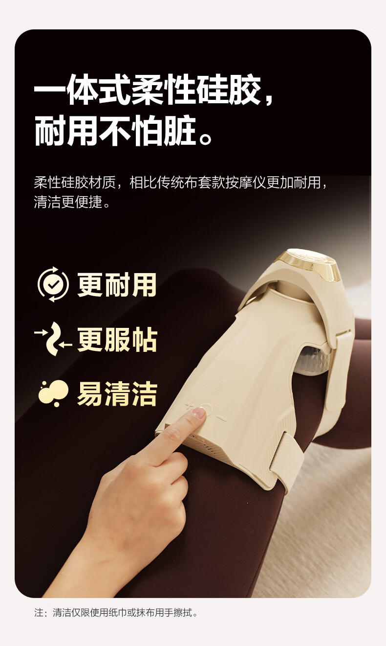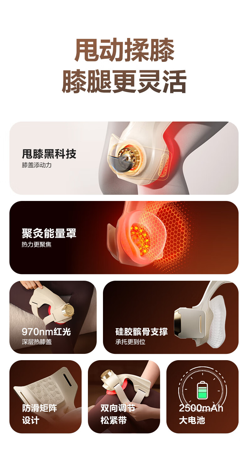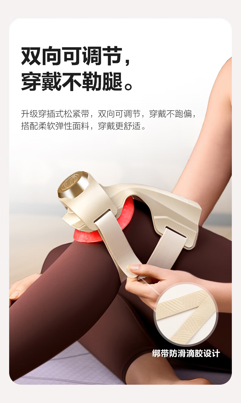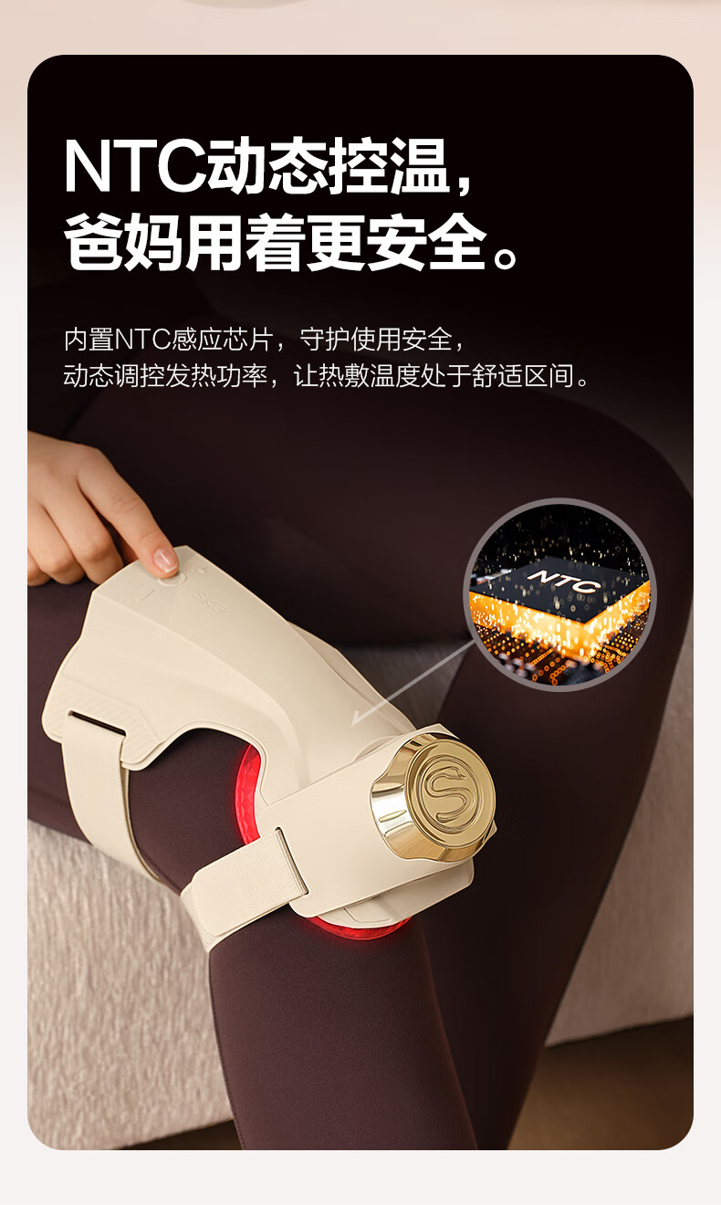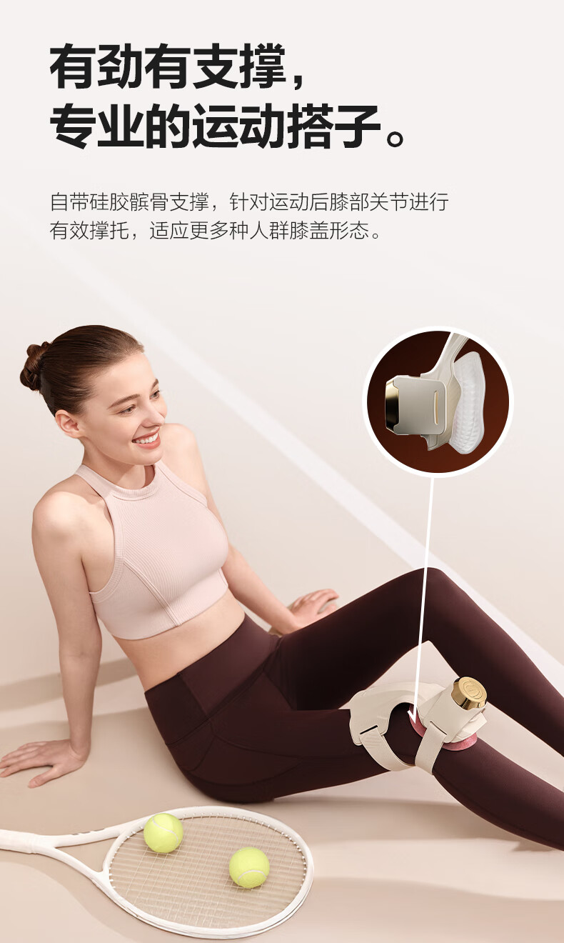弹性面料,穿插式松紧带;NTC感应技术,智能控温;透明硅胶髌骨支撑,防护支撑