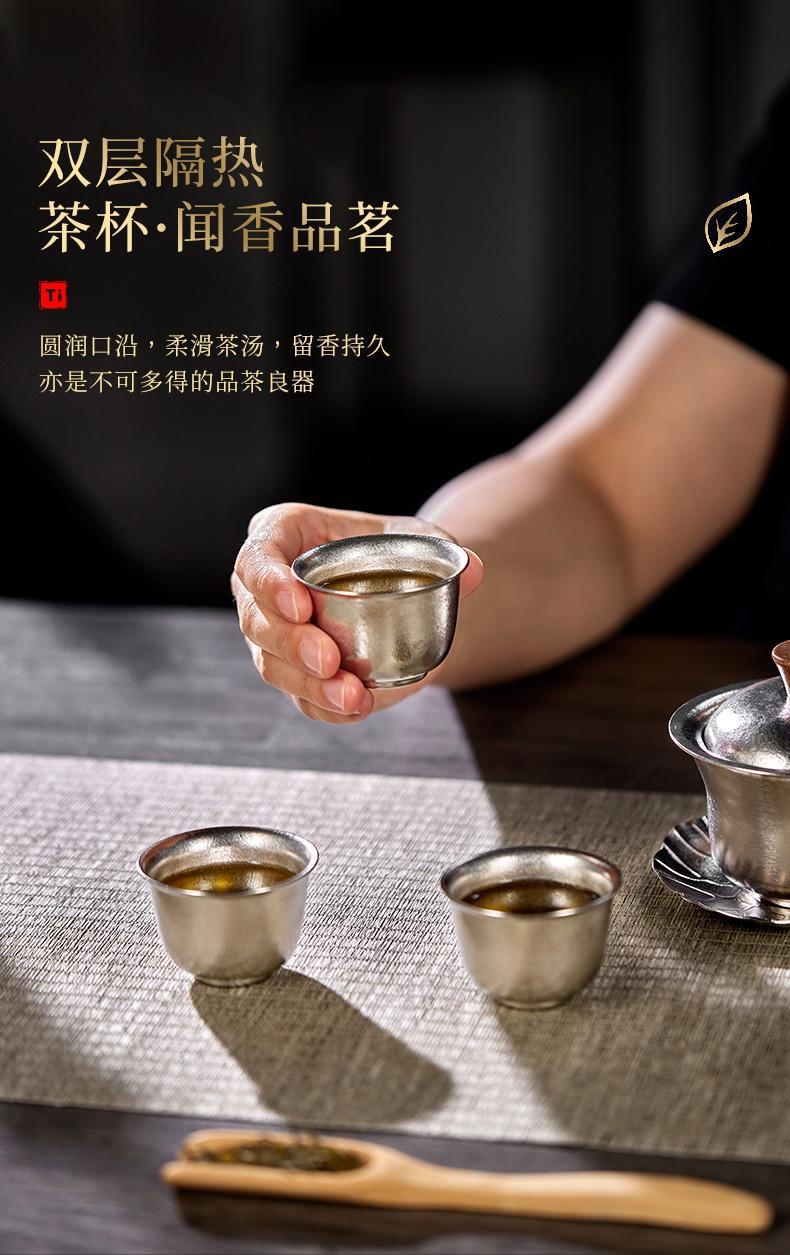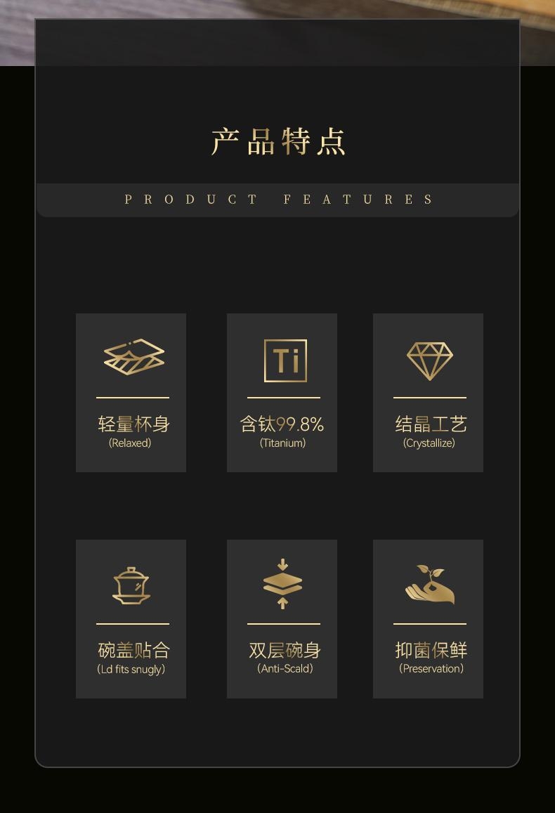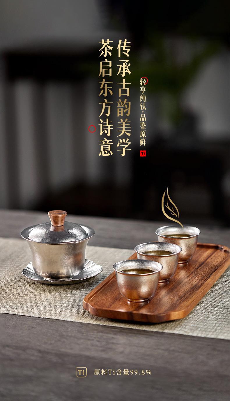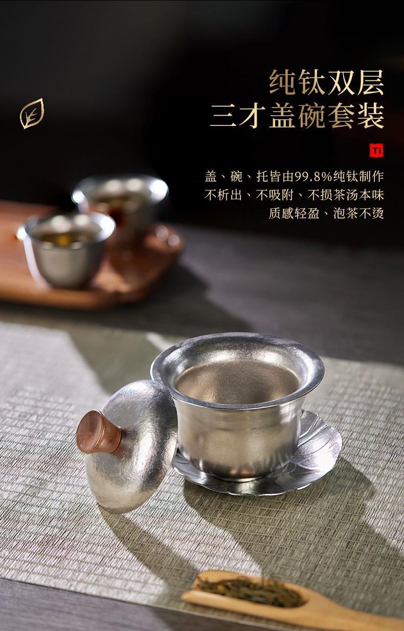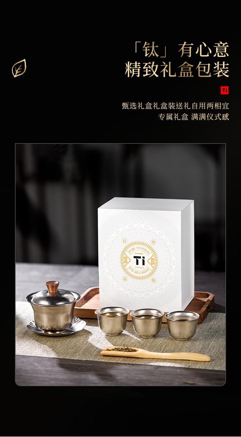 盖、碗、托皆由99.8%纯钛制作;不析出、不吸附、不损茶汤本味质感轻盈、泡茶不烫;碗口方便投茶冲茶,利于茶叶舒展不吸附茶性;钛为惰性金属,在高温冲泡时依旧稳定不惧茶中的酸碱物;甄选礼盒礼盒装送礼自用两相宜专属礼盒 满满仪式感