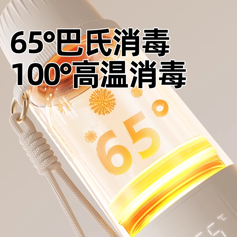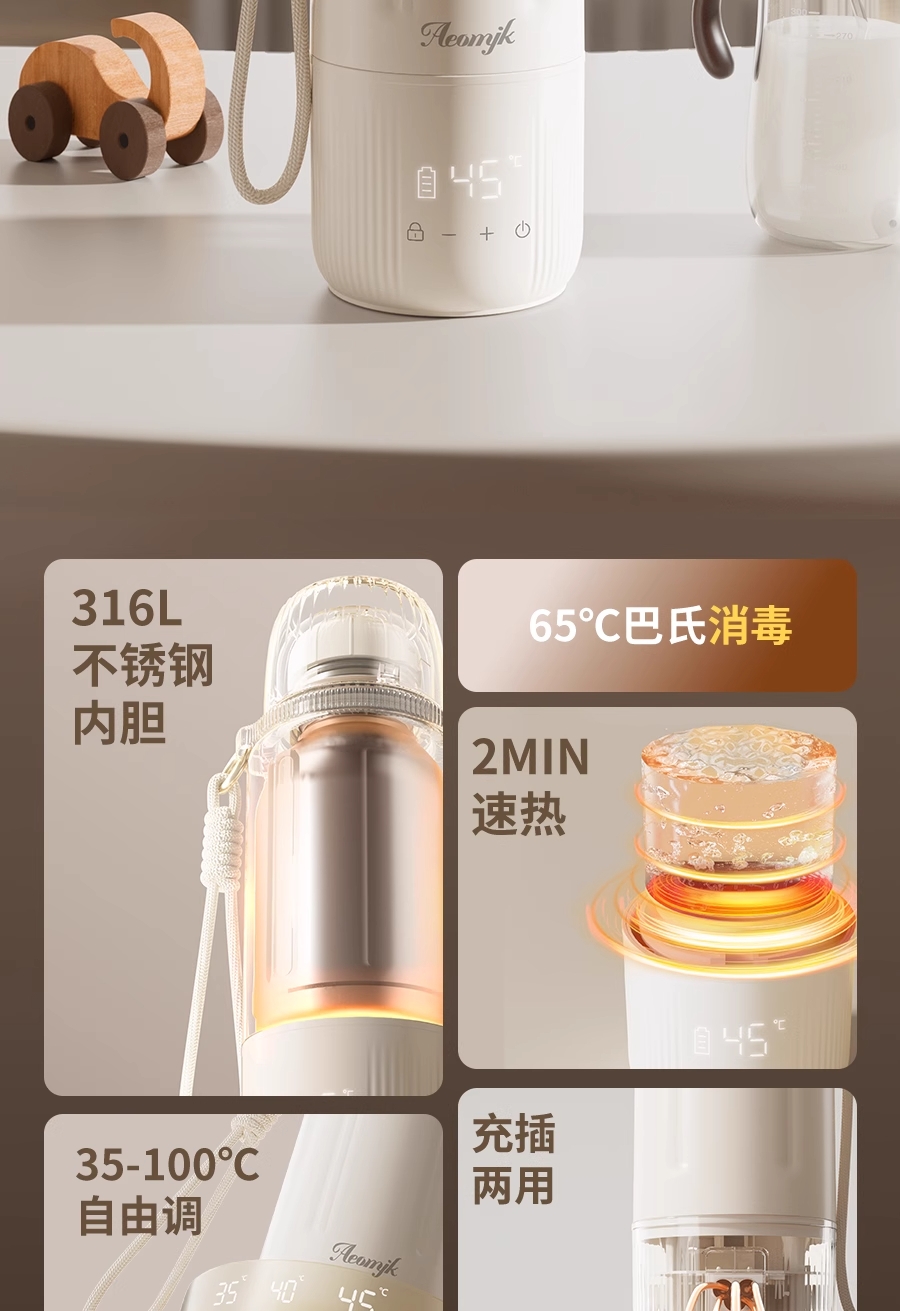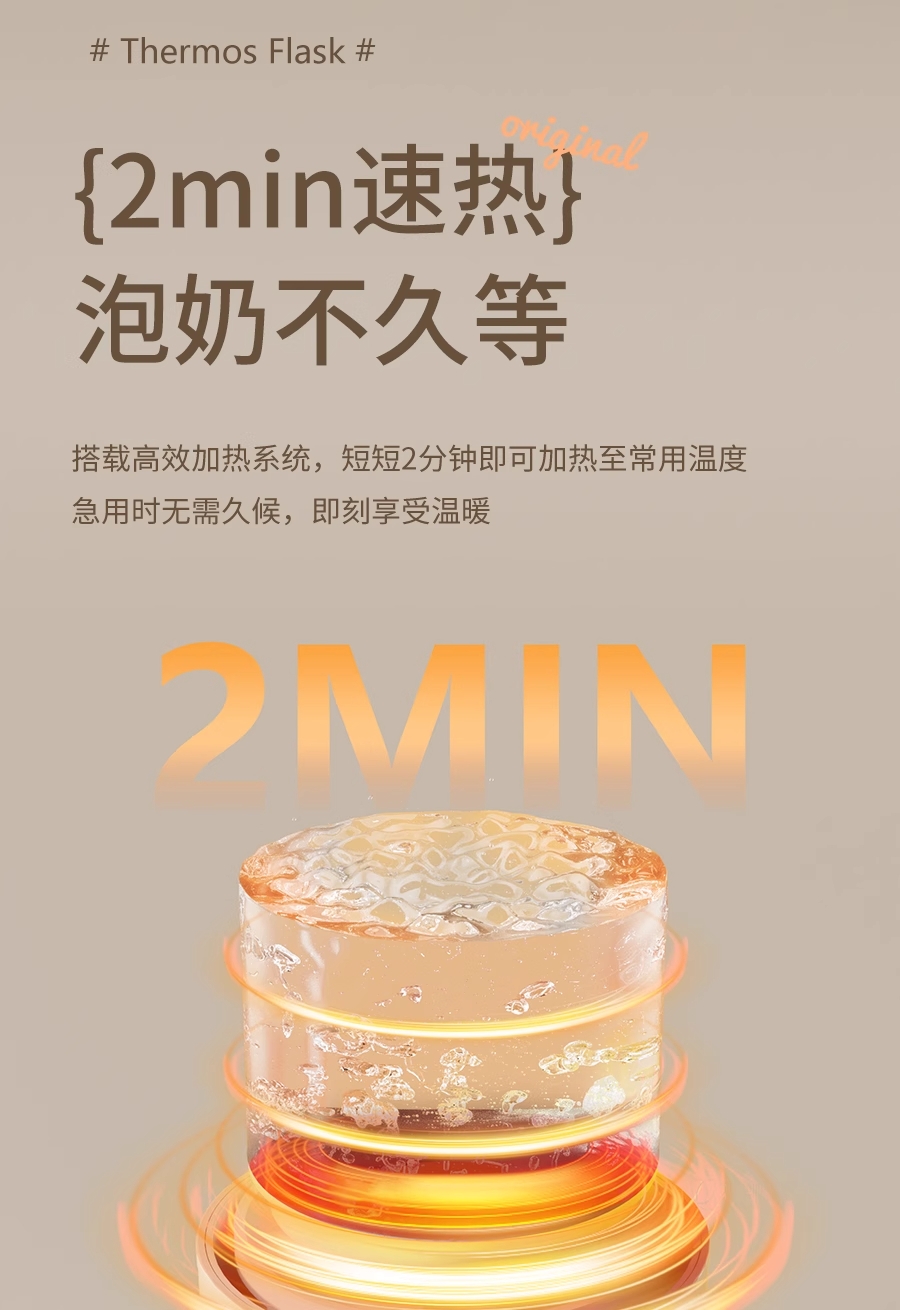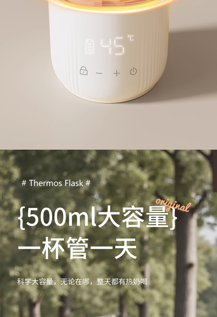 精准控温,316L不锈钢内胆,65℃巴氏消毒;2MIN速热,35-100℃自由调,充插两用;7层真空锁温,48H恒温,500ml大容量