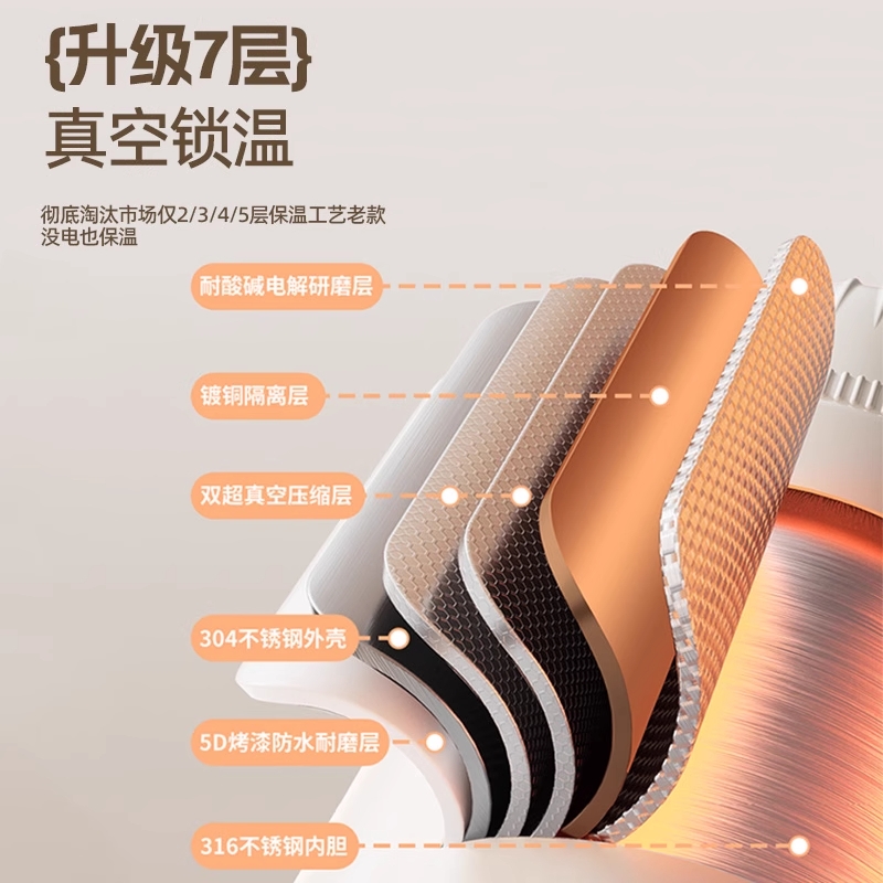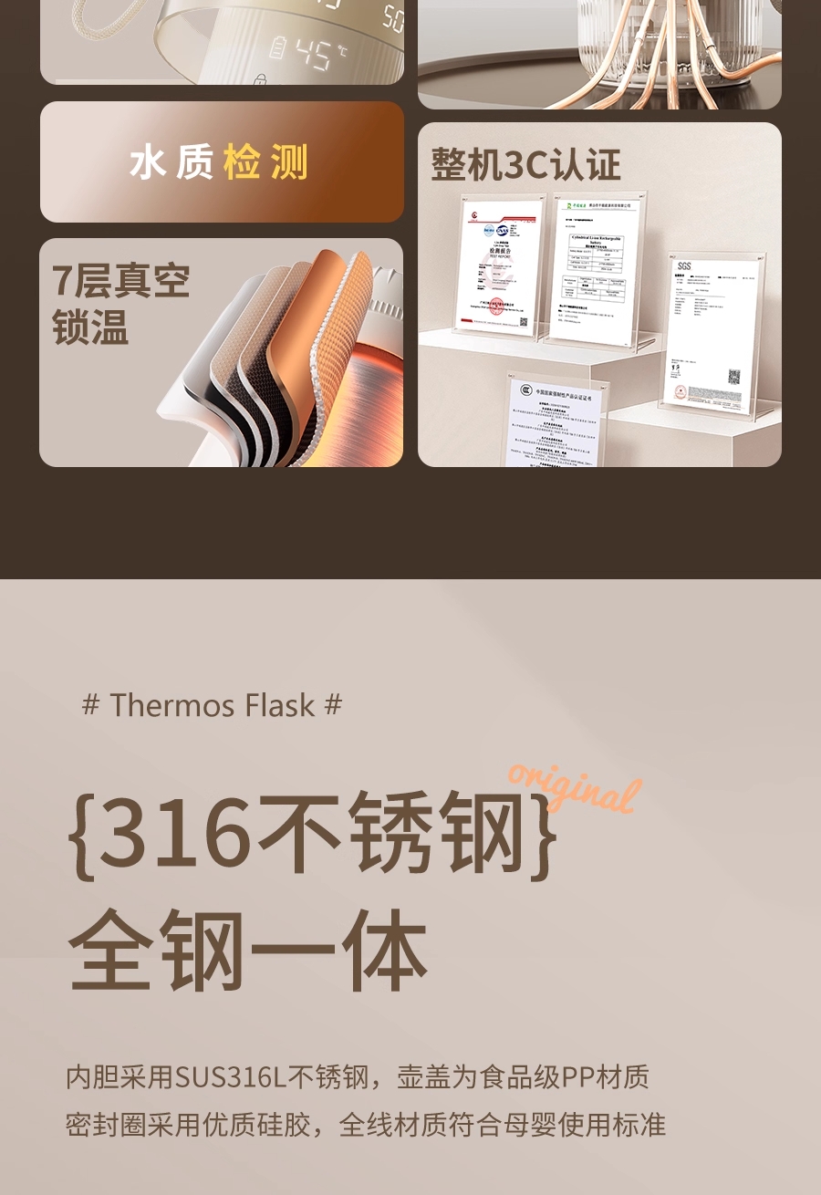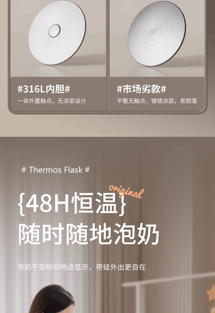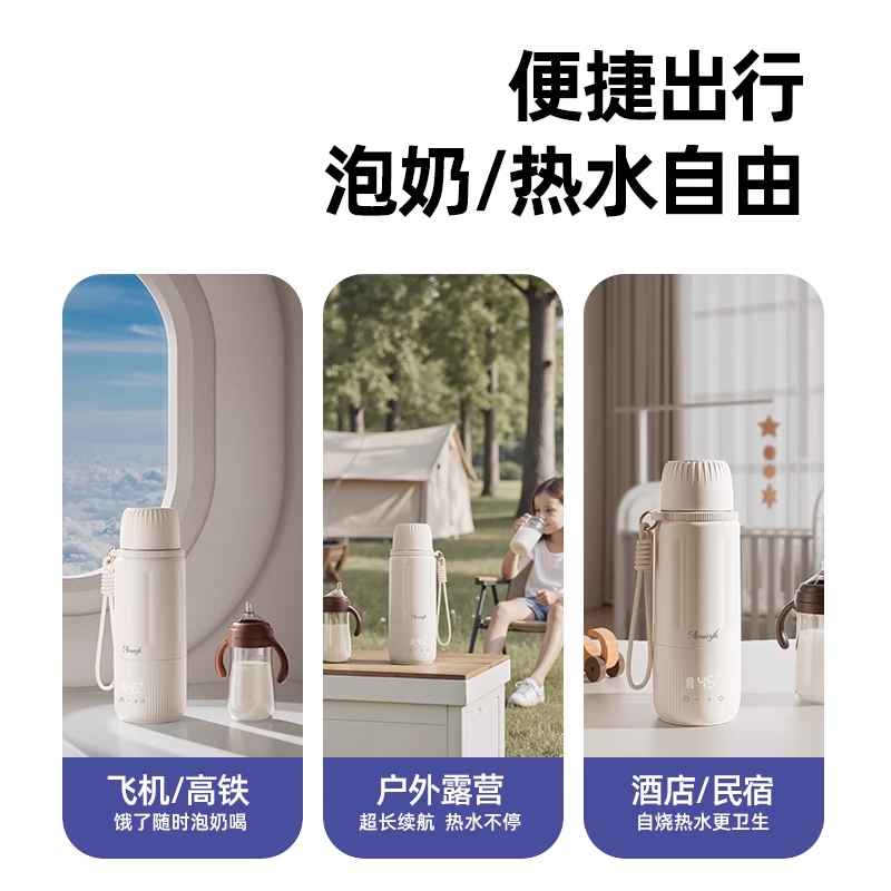 精准控温,316L不锈钢内胆,65℃巴氏消毒;2MIN速热,35-100℃自由调,充插两用;7层真空锁温,48H恒温,500ml大容量