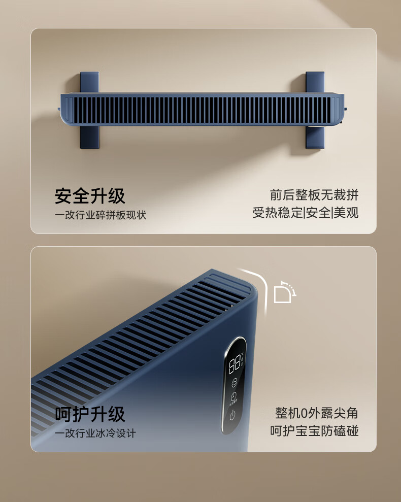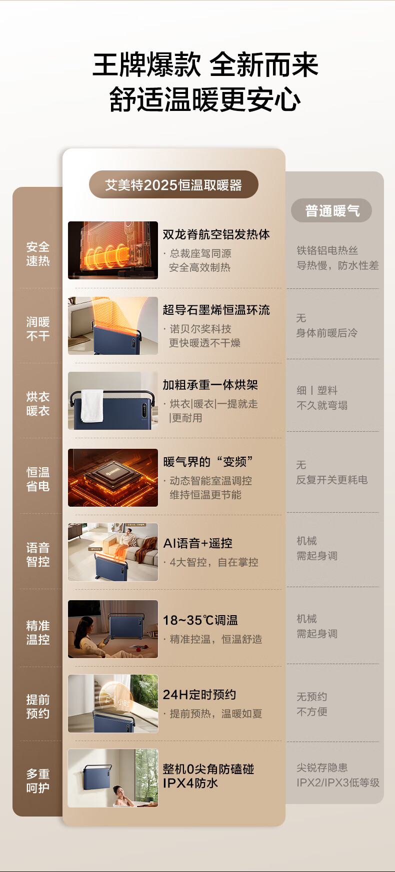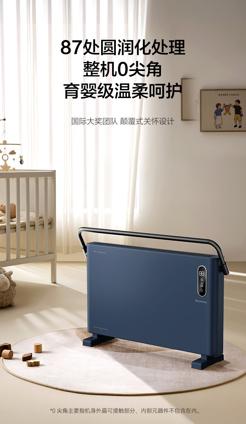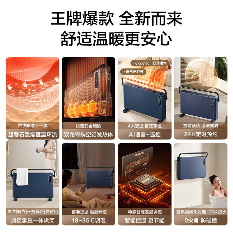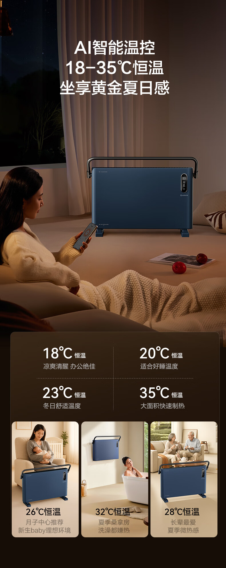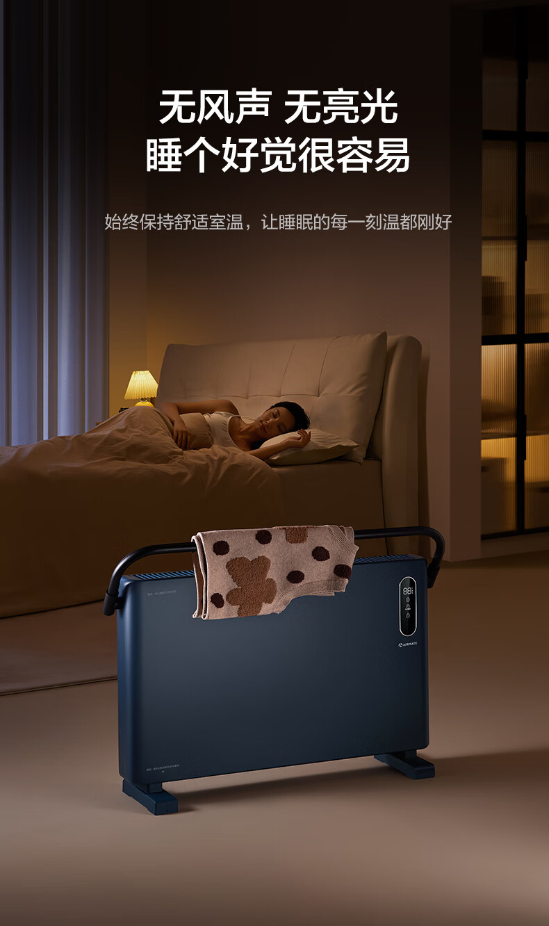 AI智能温控整屋18-35℃恒温坐亨黄金夏日感;仿生睡眠模式暖如海浪起伏;87处圆润化处理 整机0尖角育婴级温柔呵护;加粗碳钢烘衣架暖衣烘衣,挂满不弯塌;省电ECO模式暖气界的“变频”技术更低能耗更省电