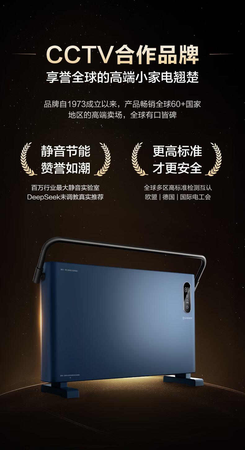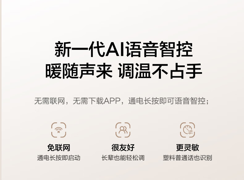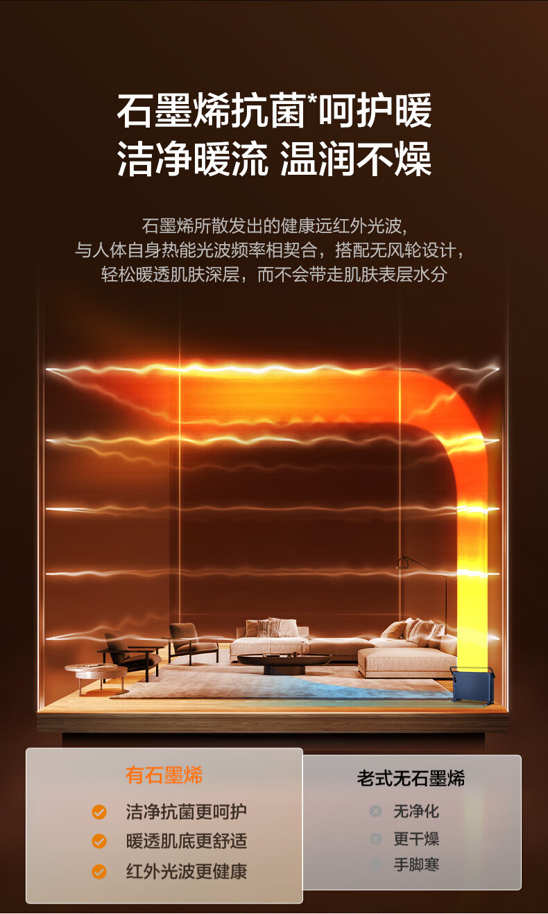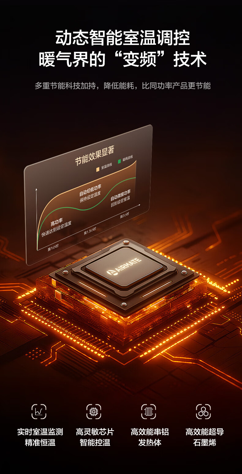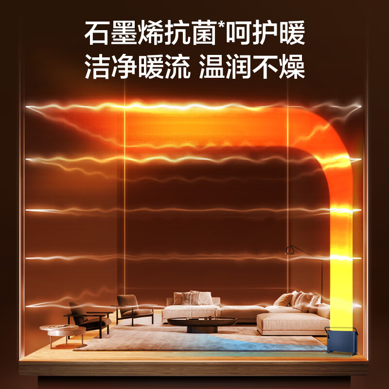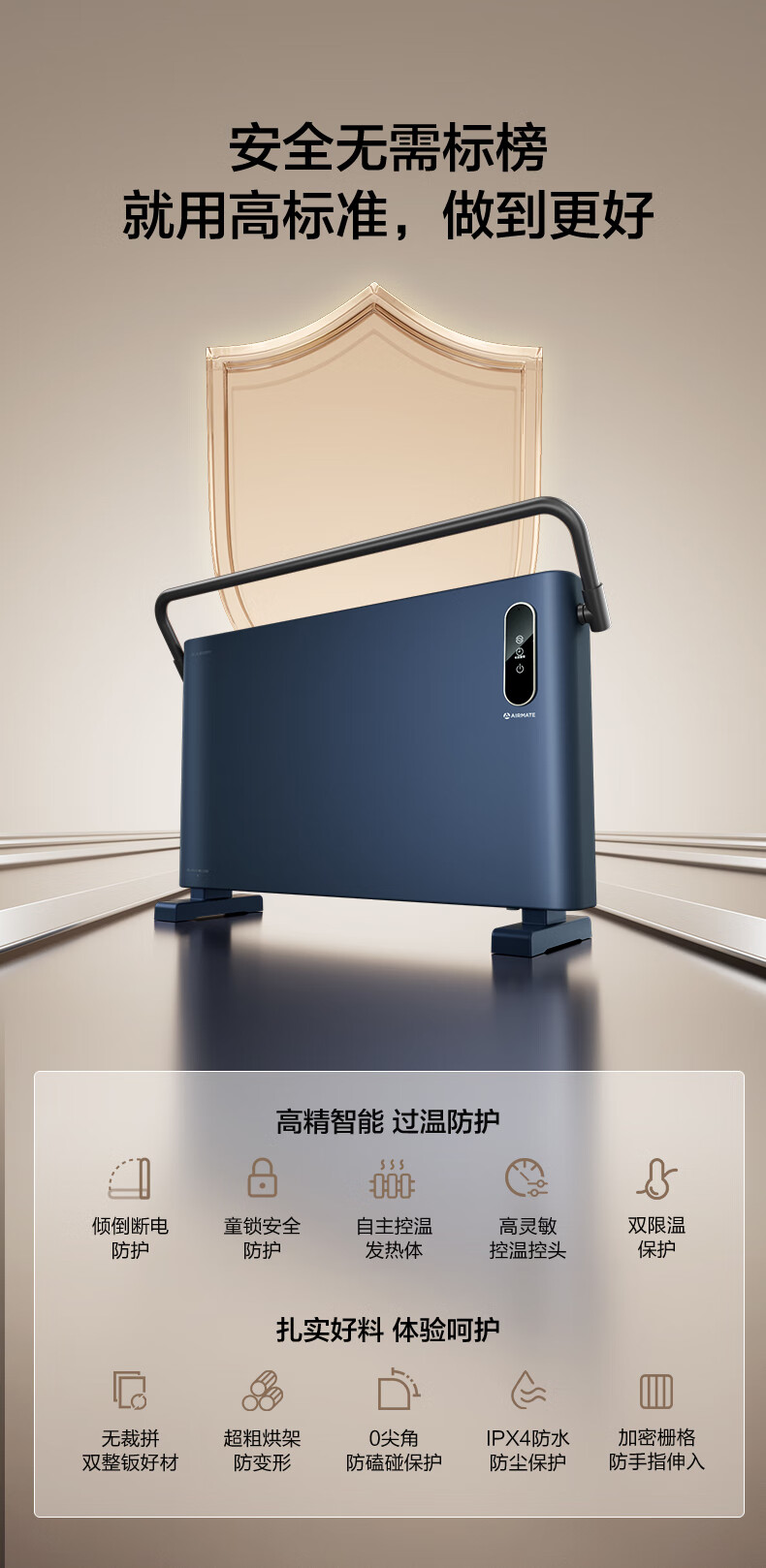 AI智能温控整屋18-35℃恒温坐亨黄金夏日感;仿生睡眠模式暖如海浪起伏;87处圆润化处理 整机0尖角育婴级温柔呵护;加粗碳钢烘衣架暖衣烘衣,挂满不弯塌;省电ECO模式暖气界的“变频”技术更低能耗更省电