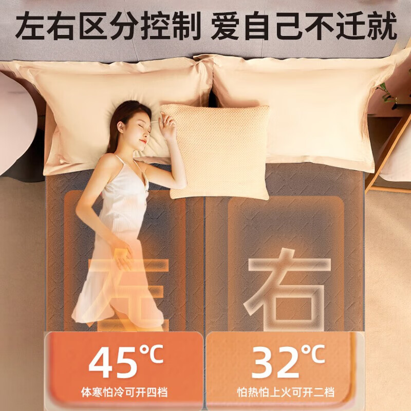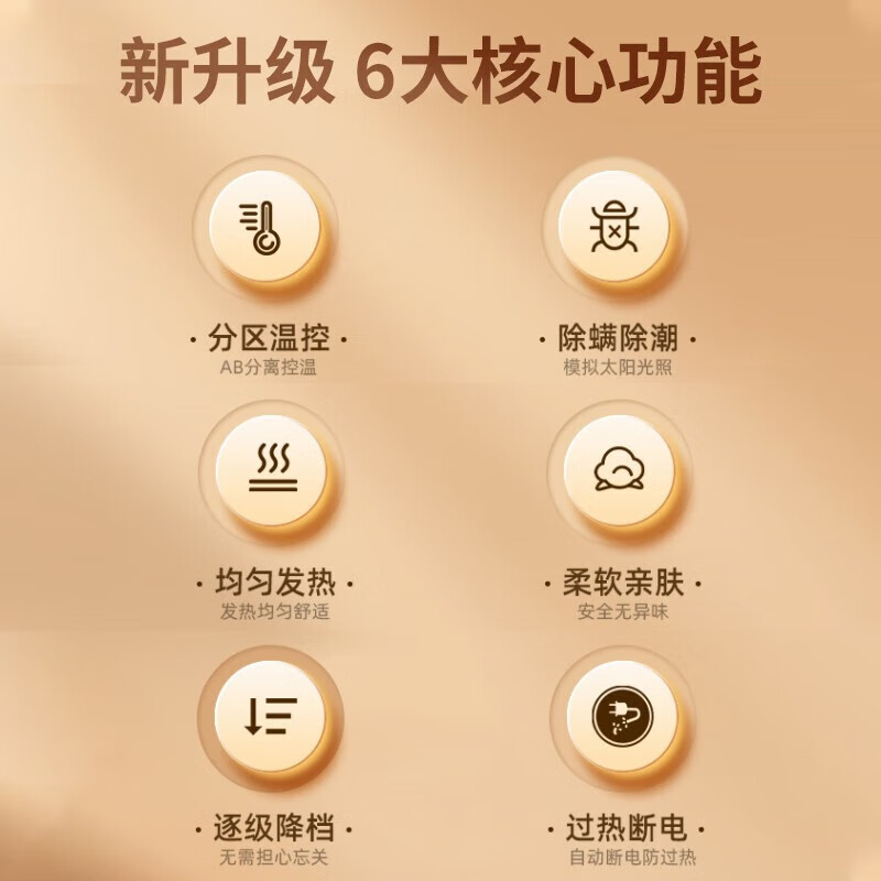 四档调温,随心把控。抑菌除螨 让温暖更安全;左右可独立调节,满足双人使用时对温度的不同需求;发热丝外层包裹绝缘橡胶,防水防漏电,不怕宝宝尿床。;2-12小时定时开关,12小时自动断电安全入睡更放;防潮,除螨,解锁跨界功能