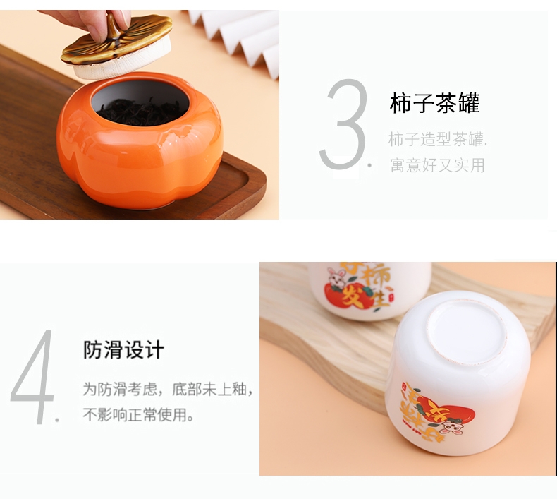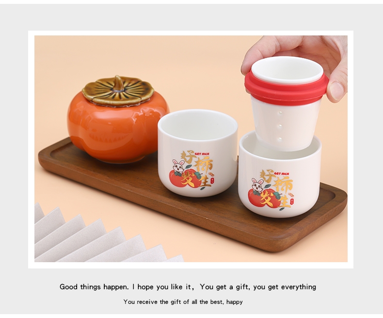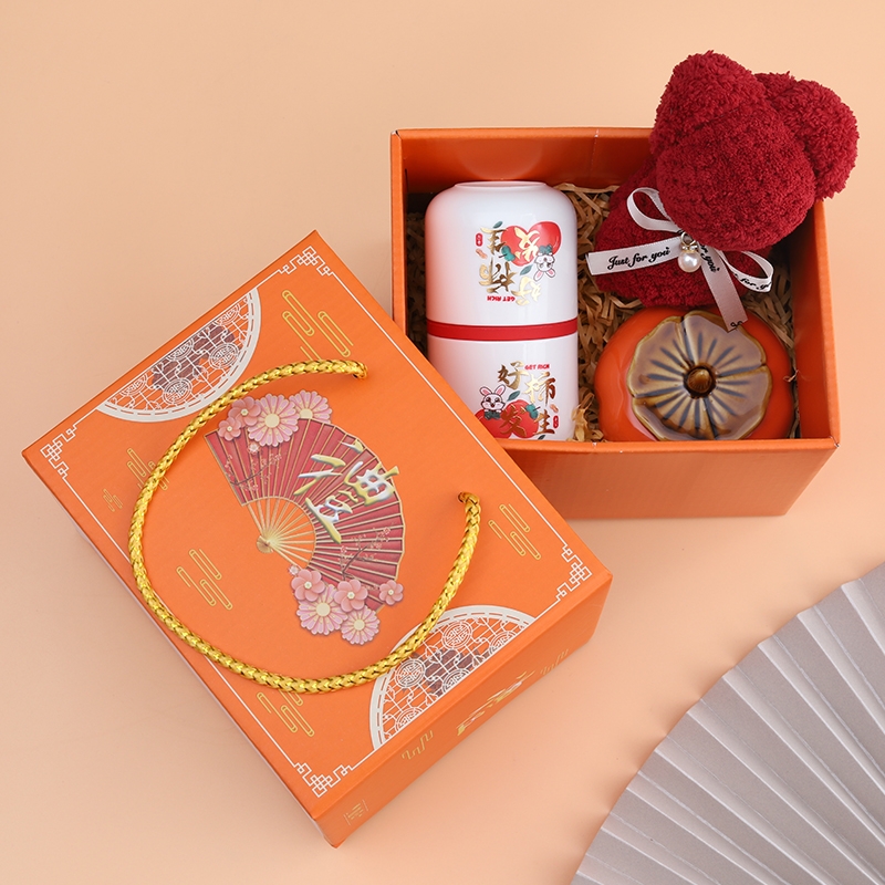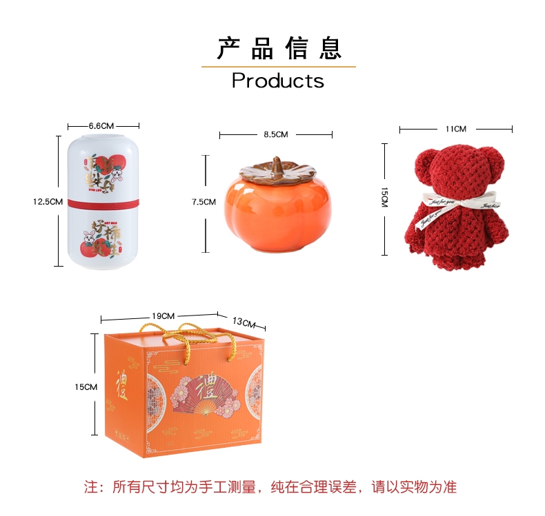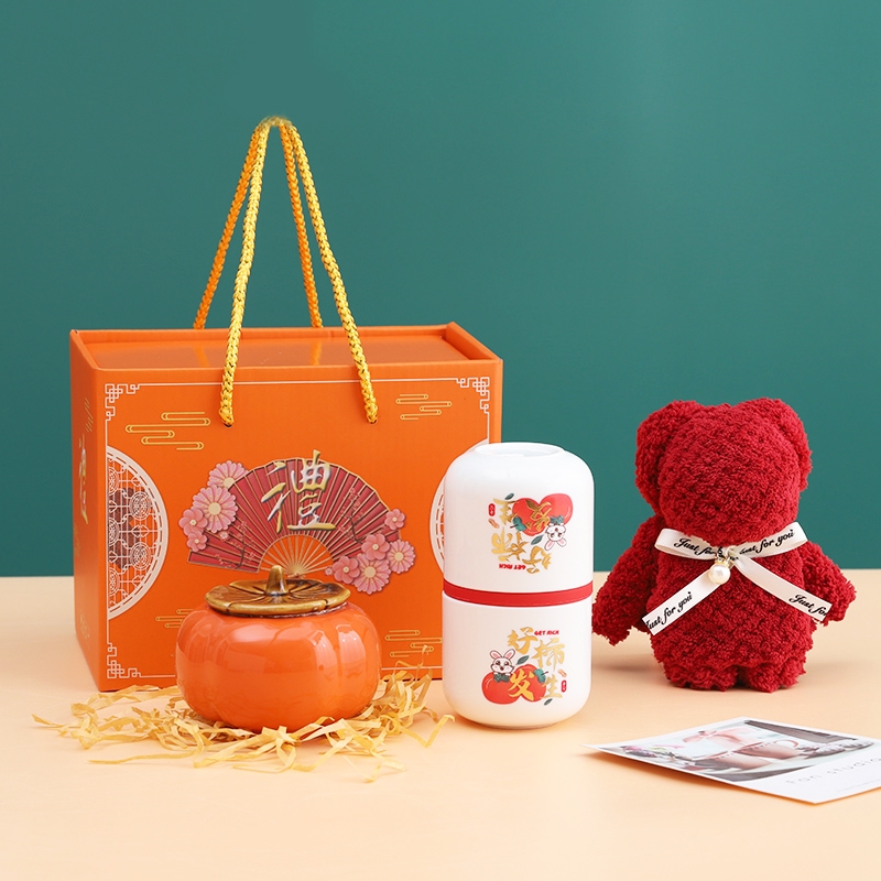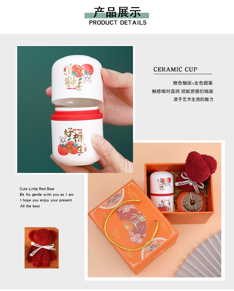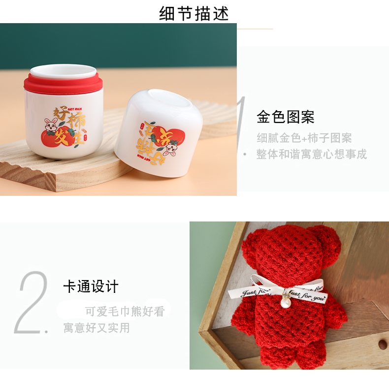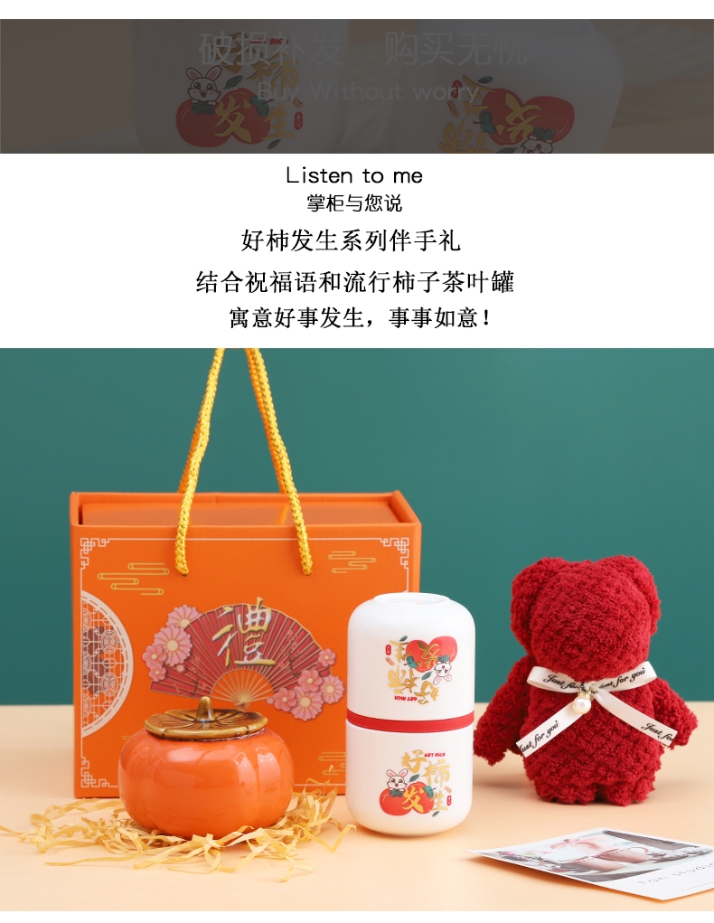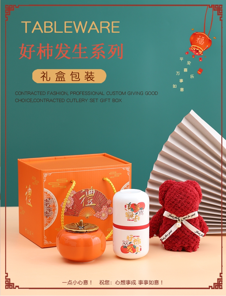 送礼佳品;寓意好事发生,事事如意;同心杯+柿子茶罐+卡通毛巾熊,寓意好又实用