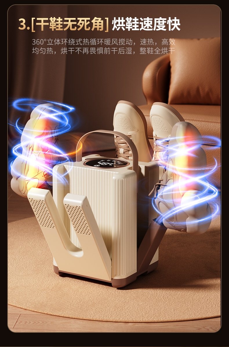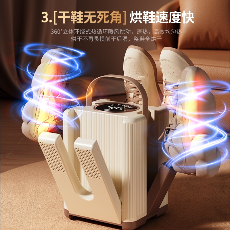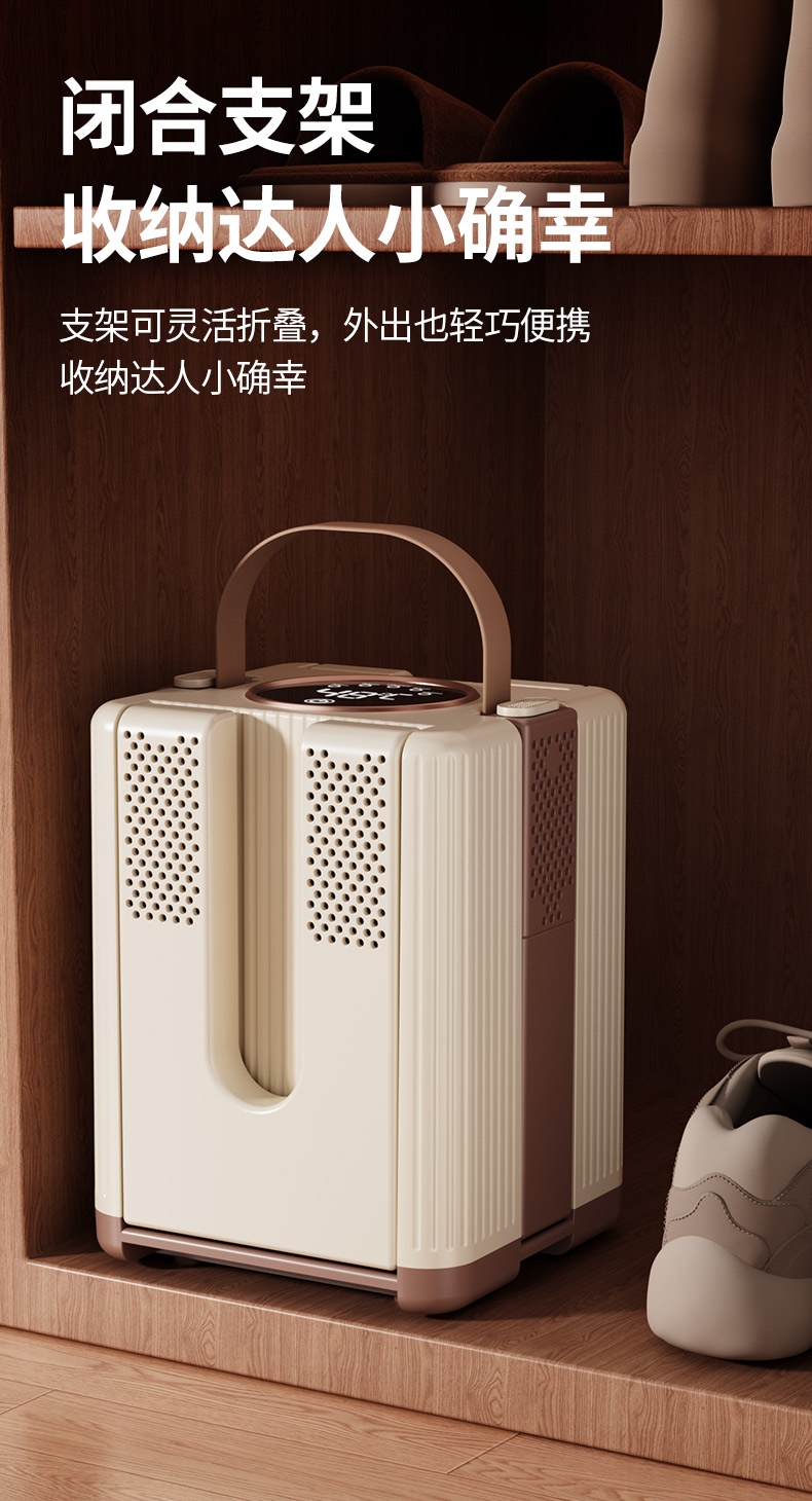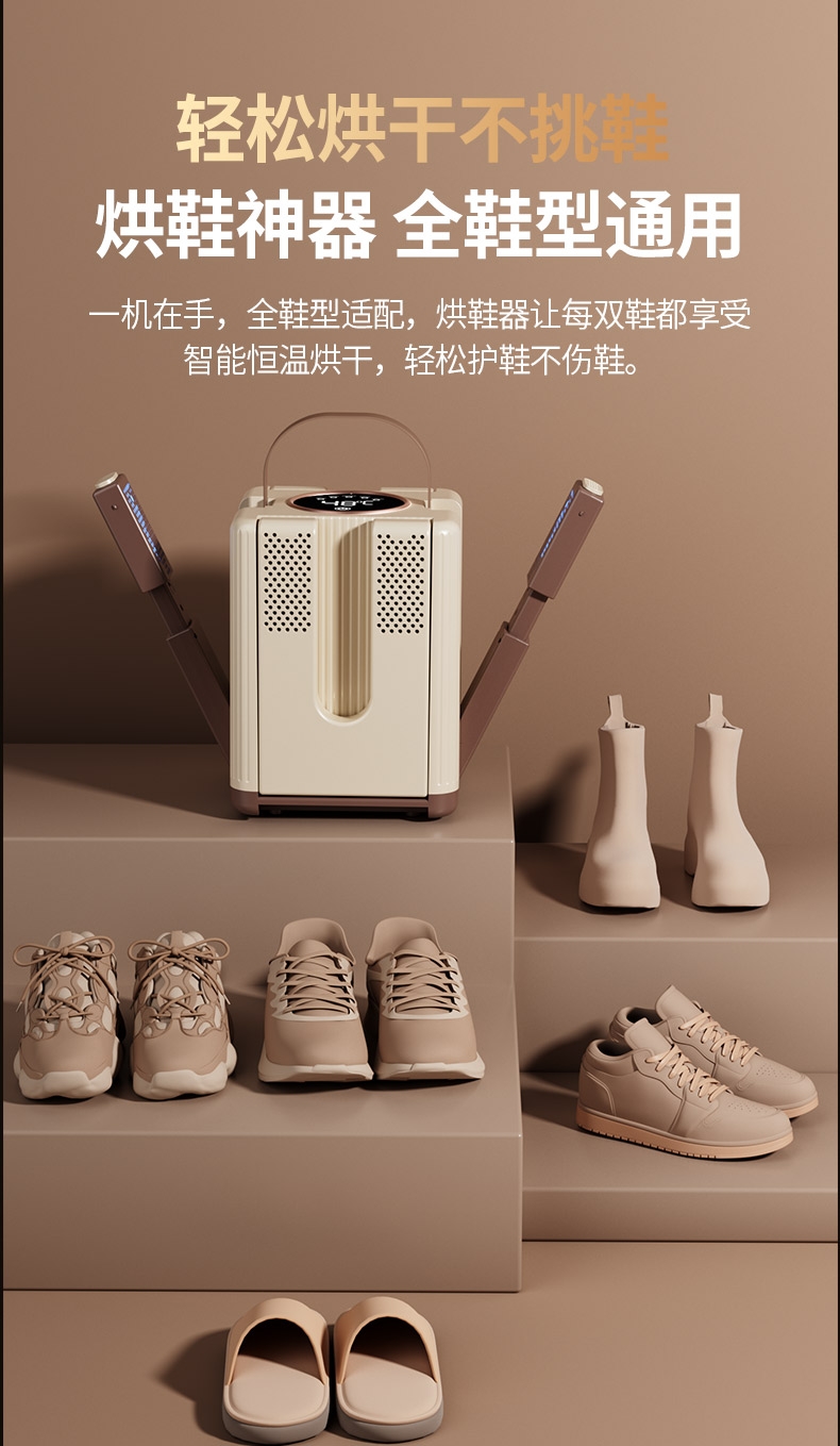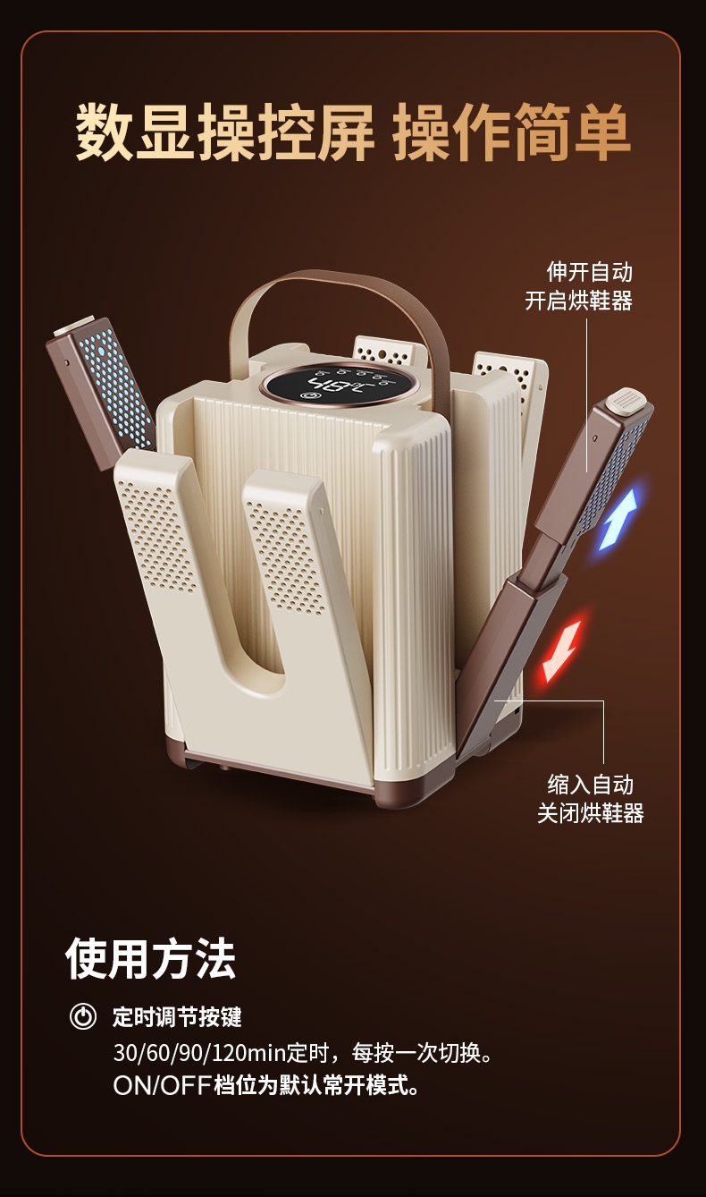 UV蓝光紫外线杀菌120min定时烘鞋;恒温烘干同时可烘干六双鞋子;数显操控屏折叠收纳不占地方