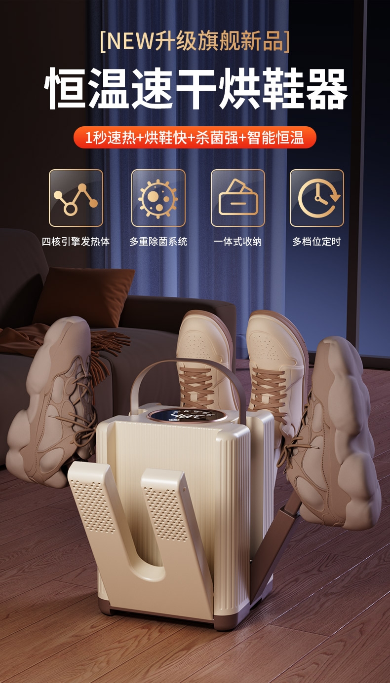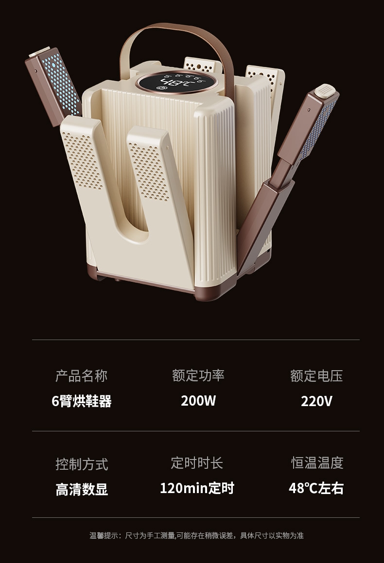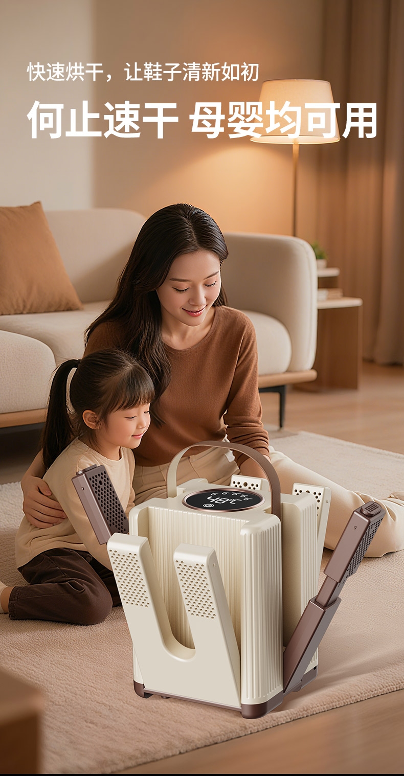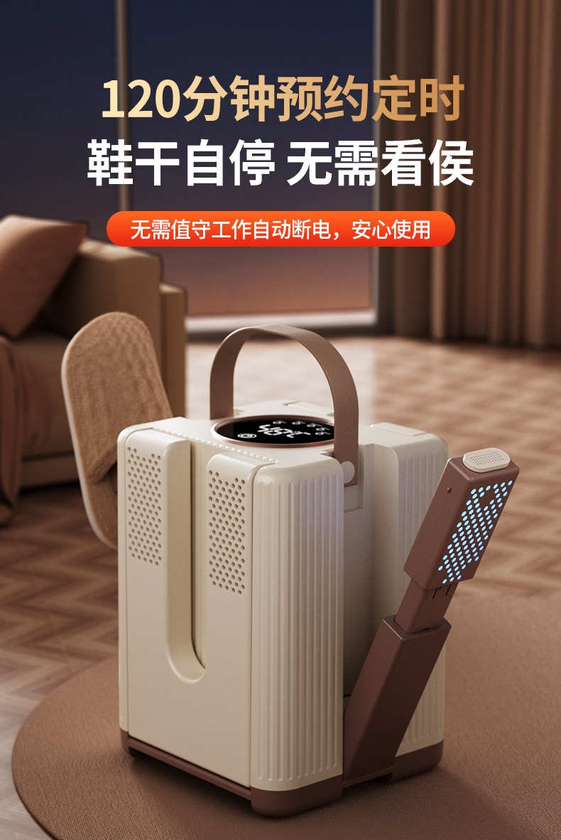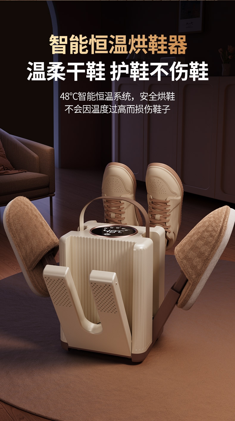 UV蓝光紫外线杀菌120min定时烘鞋;恒温烘干同时可烘干六双鞋子;数显操控屏折叠收纳不占地方