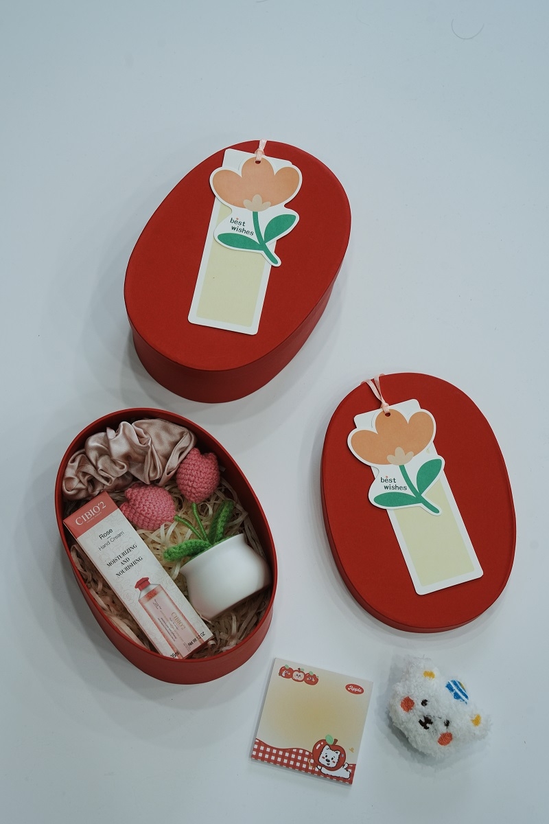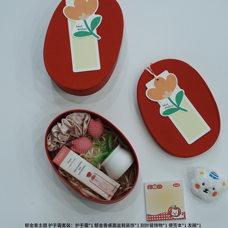 配置清单:红色礼盒*1 真丝发圈*1 泰国护手霜35ml*1 郁金香盆栽*1(款式随机) 卡通便签*1 小熊胸针*1 花朵卡片*1