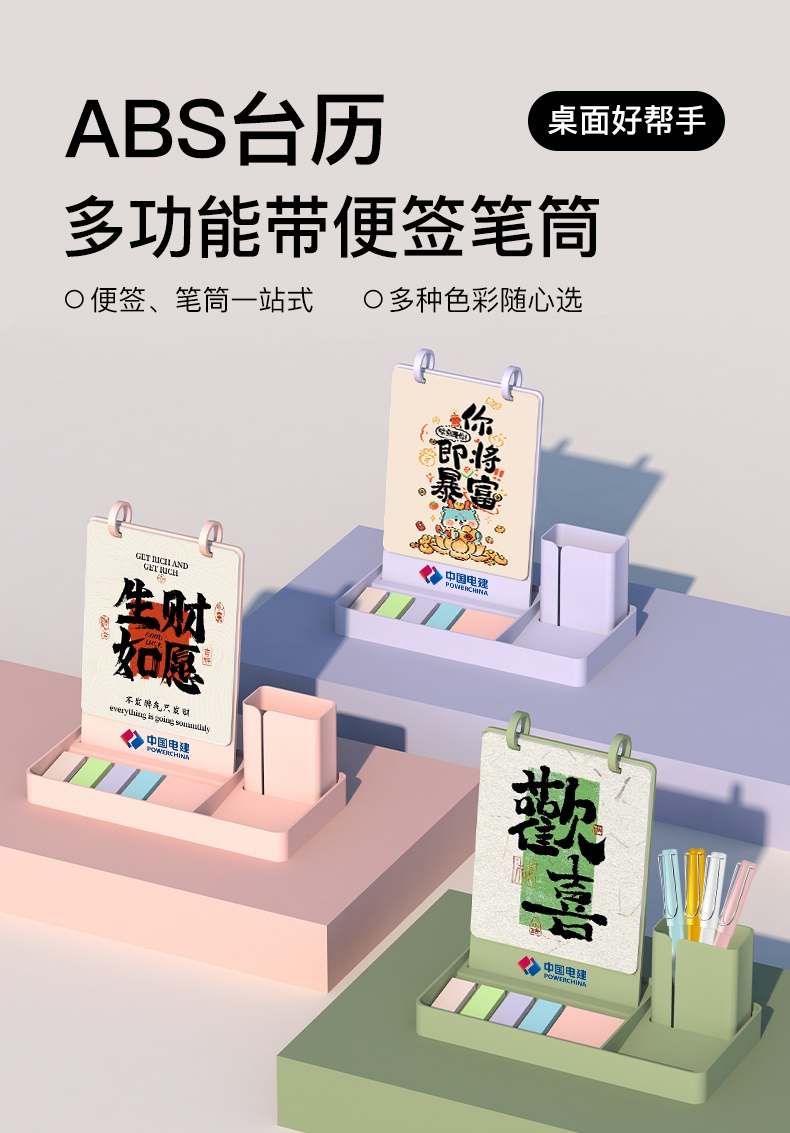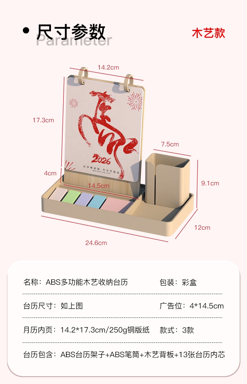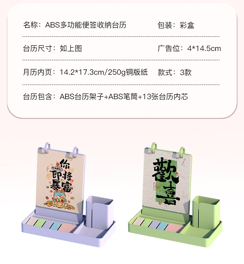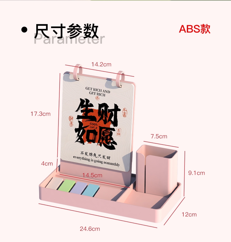 配置清单:13张内芯+ABS收纳台历架子+ ABS笔筒