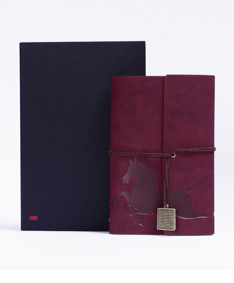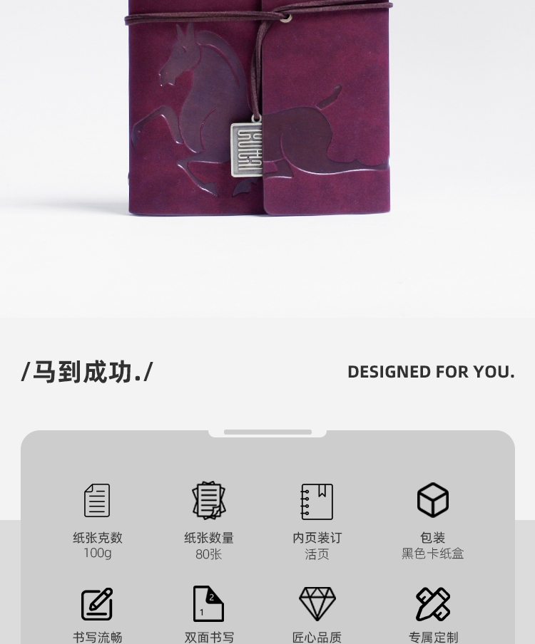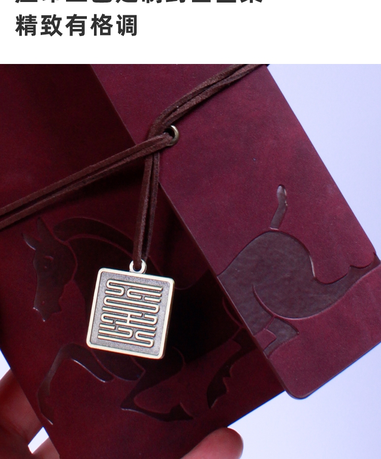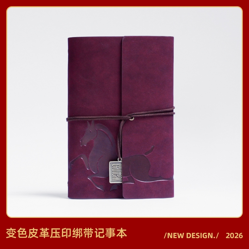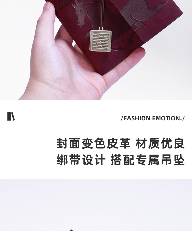 封面变色皮革 材质优良 绑带设计 搭配专属吊坠;压印工艺定制封面图案 精致有格调;千越象牙白纸 书写顺滑 活页装订 方便内芯替换;单本包装 精美雅致 黑色卡纸盒