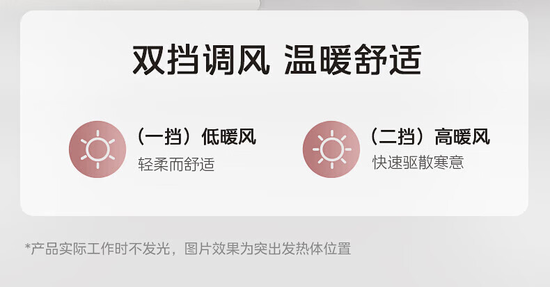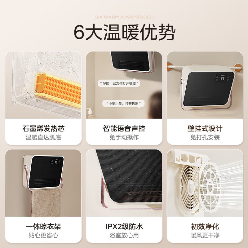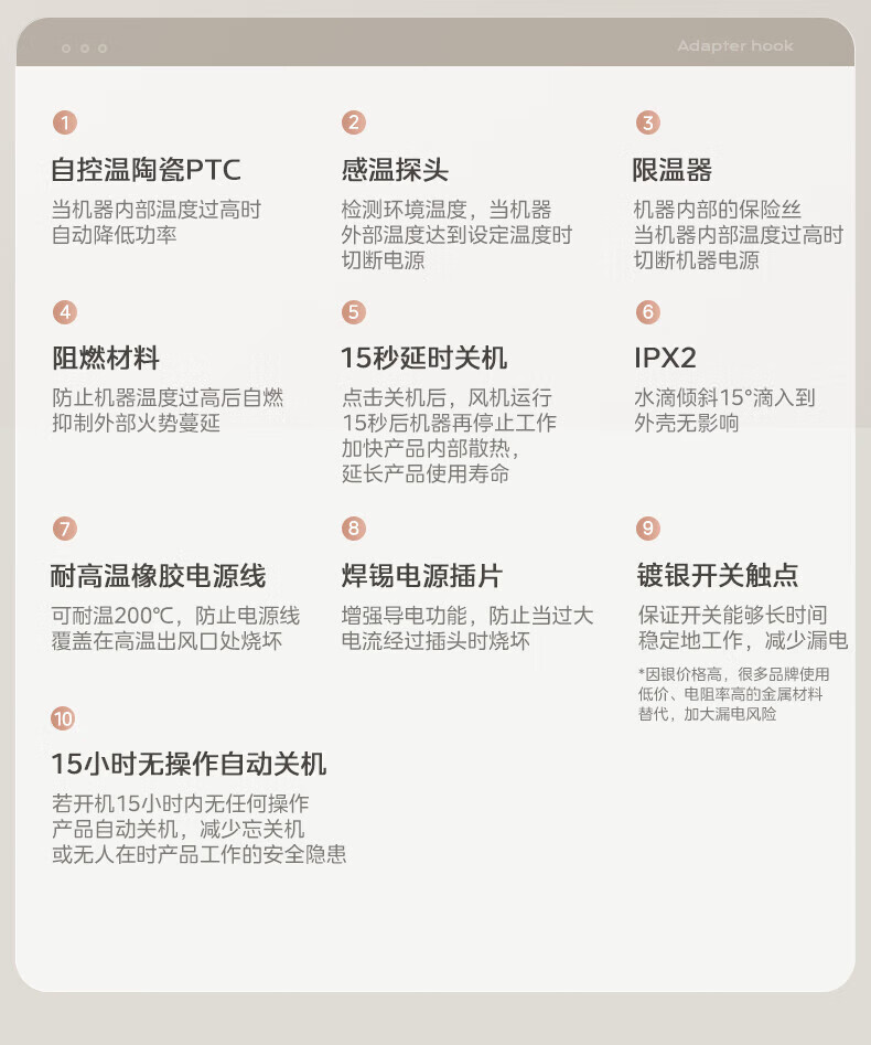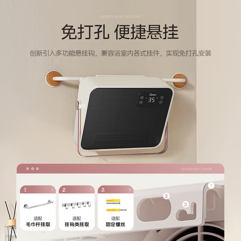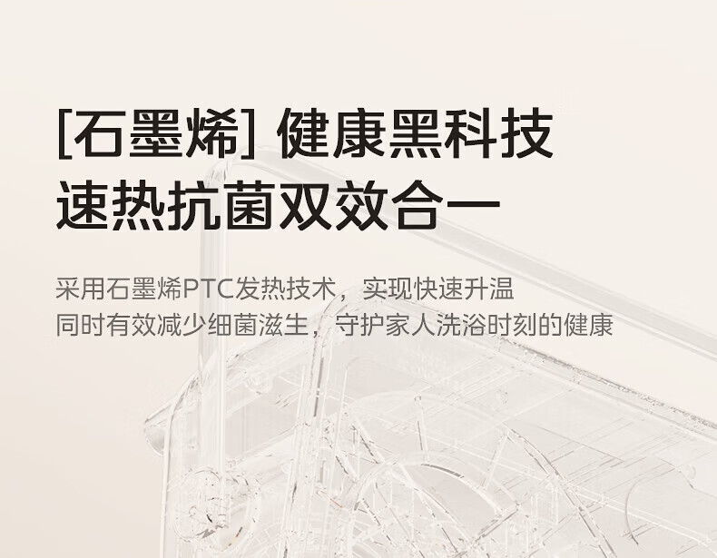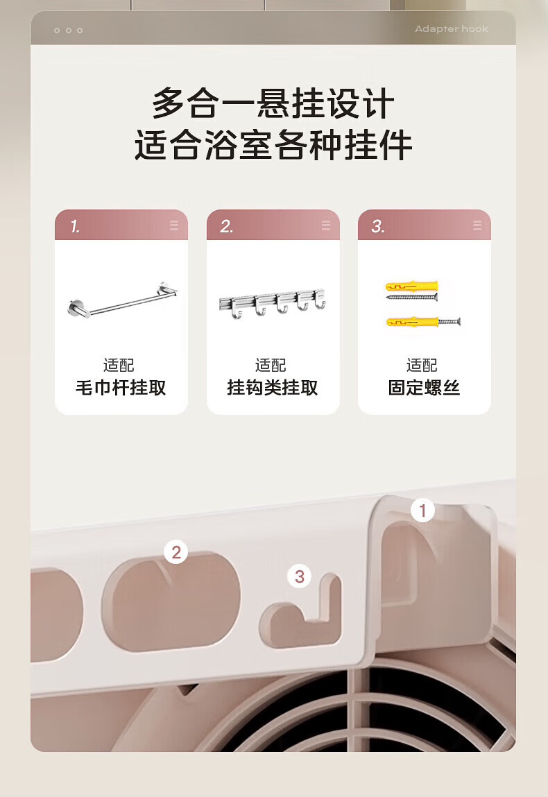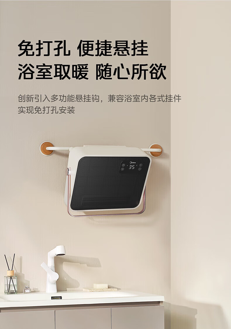 IPX2级防水三重结构 更安全;精细化定时+智能调温更懂你的小习惯;创新引入多功能悬挂钩,兼容浴室内各式挂件实现免打孔