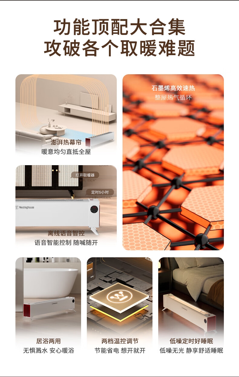 石墨烯速热技术15-35℃恒温调节;两档调节 热幕帘立体升温;负离子净化,语音触摸多重控制