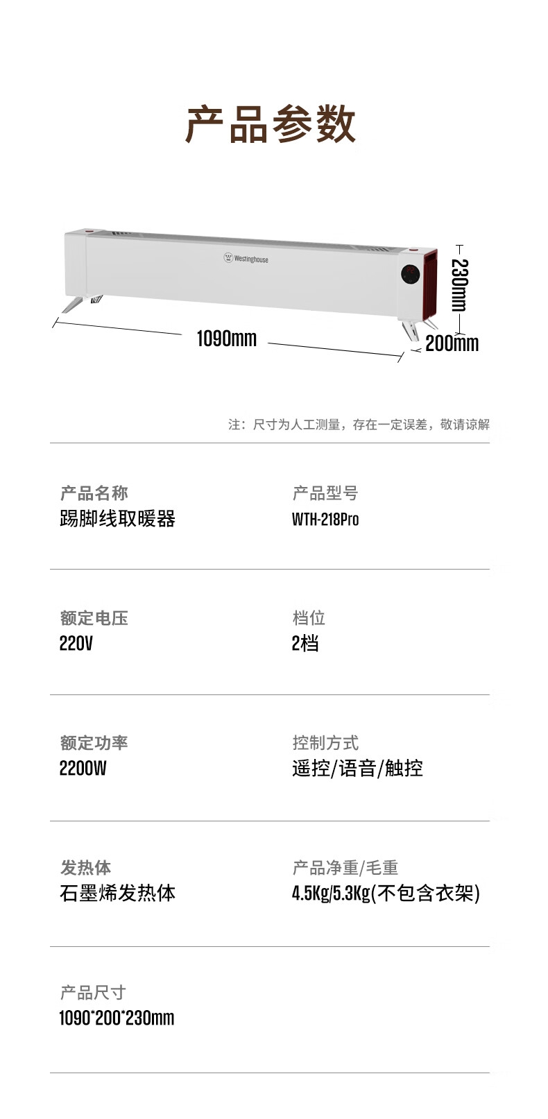 西屋 踢脚线取暖器石墨烯电暖气WTH-218pro