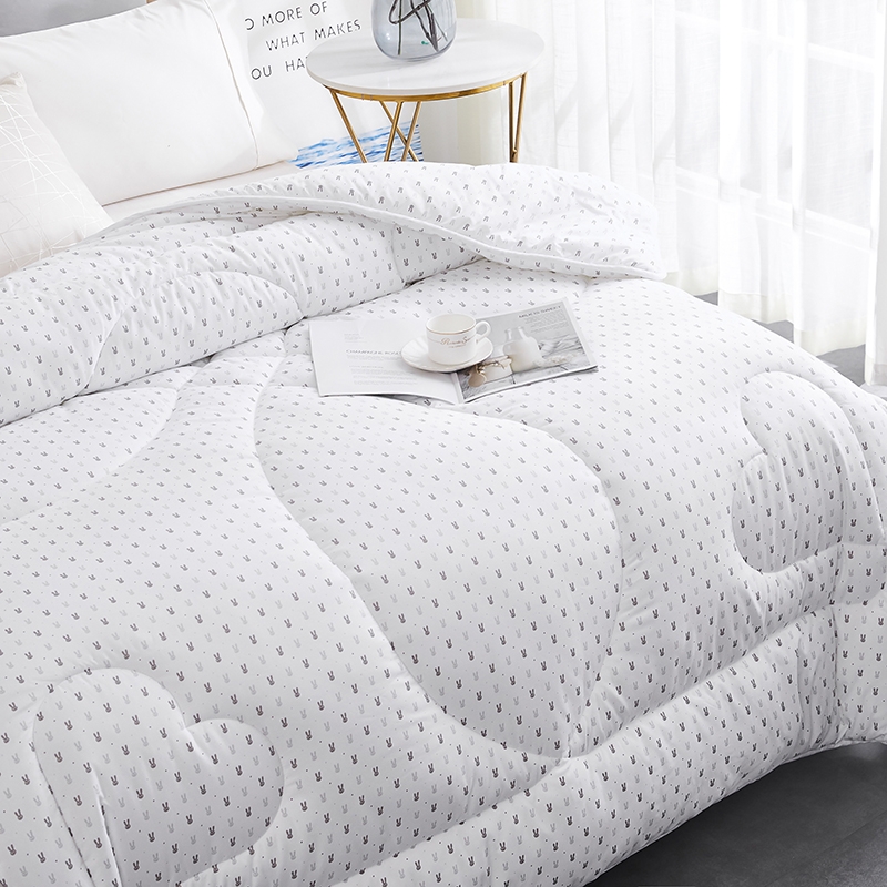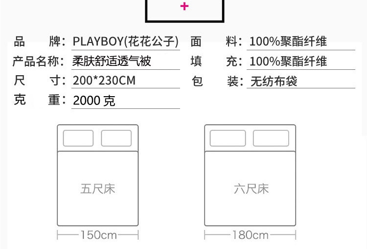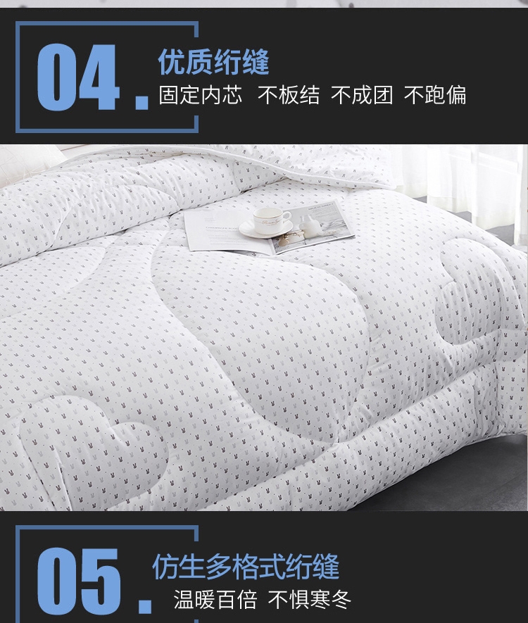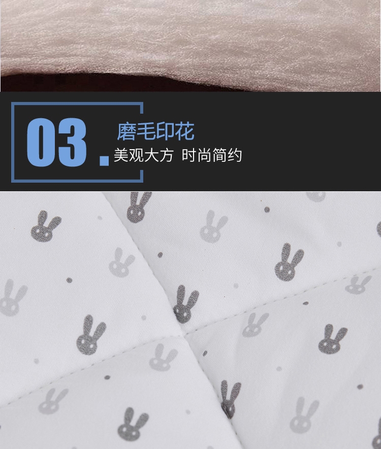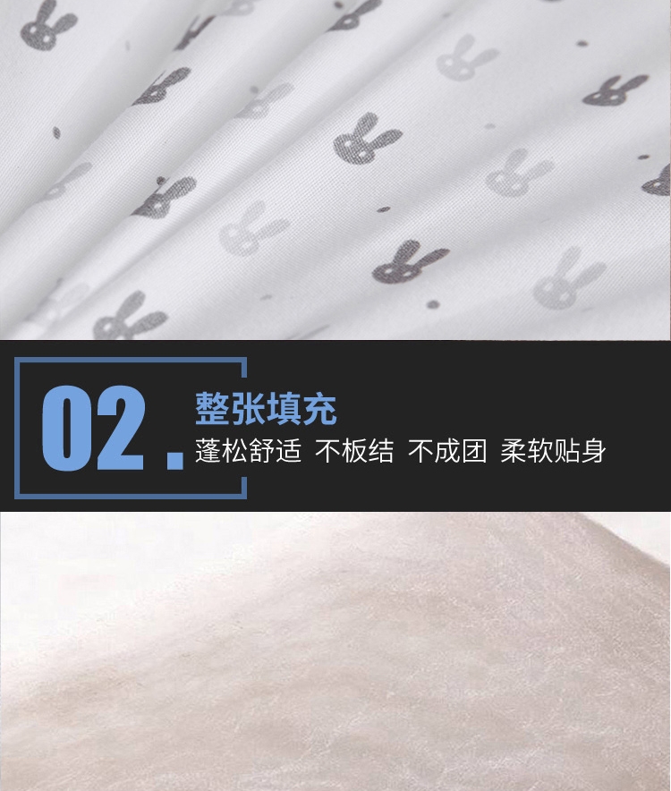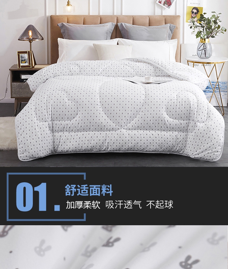 超细超轻纤维填充,饱满蓬松,透气好;被芯磨毛布面料,高支高密,柔软亲肤;细密压花绗缝,填充固定,久用不跑位