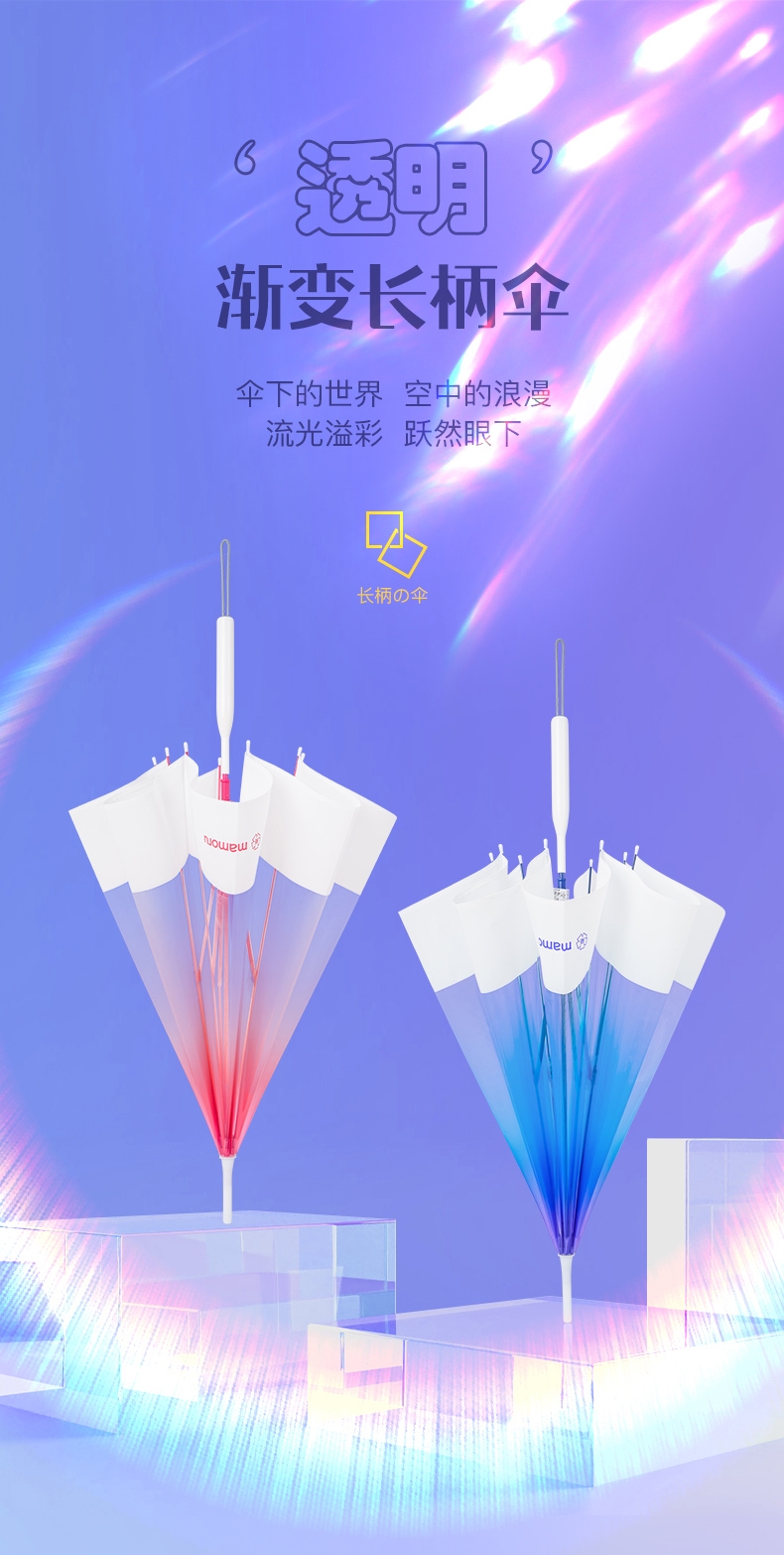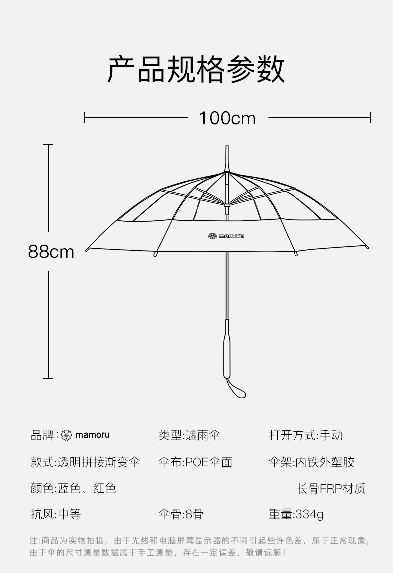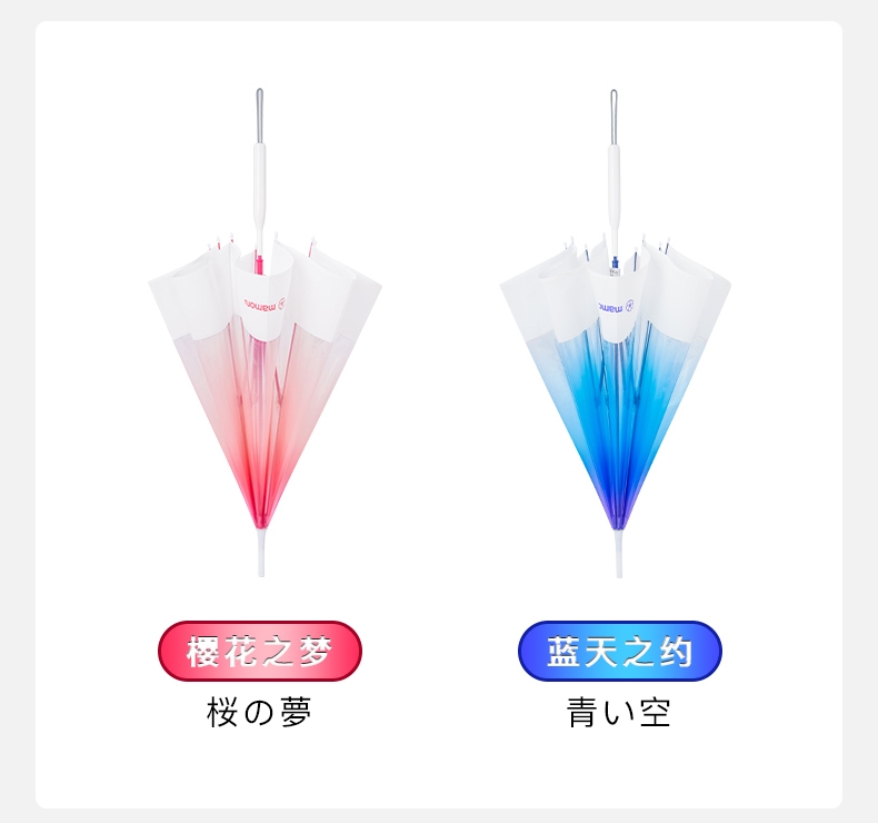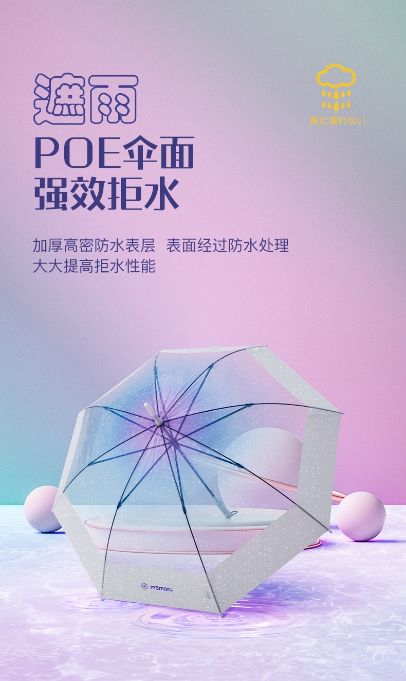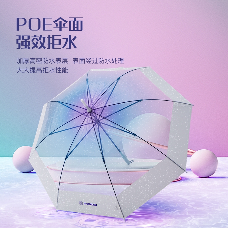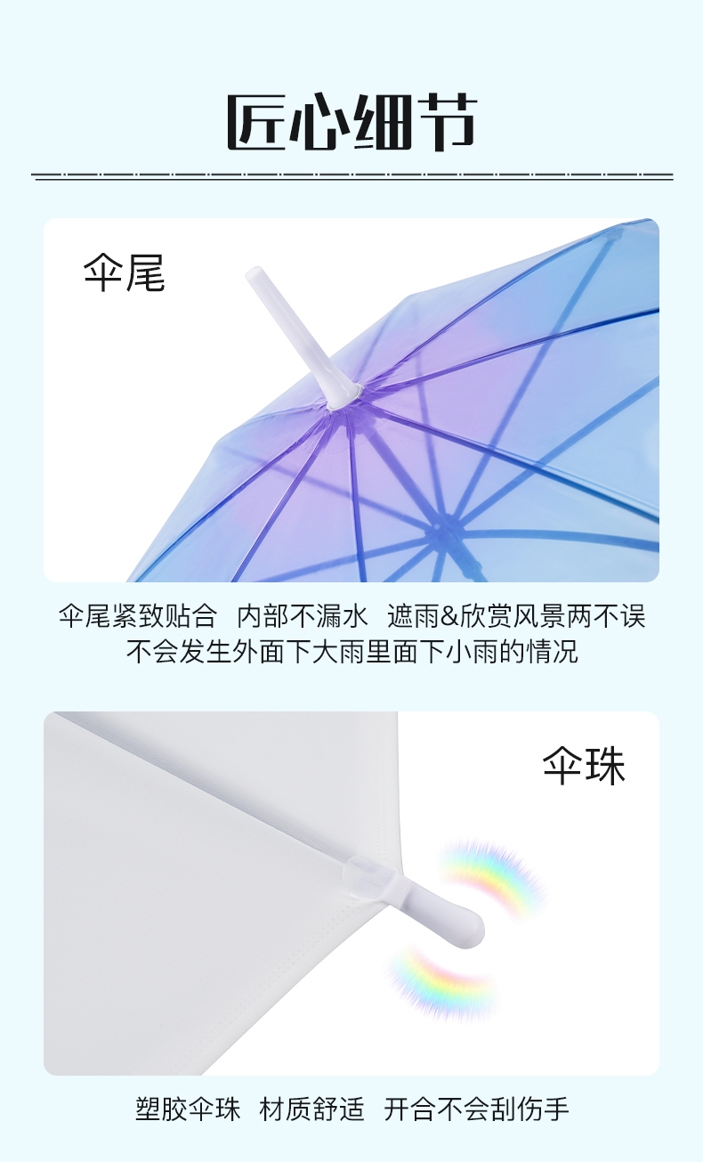 伞面采用POE加厚拼接PVC渐变色的时尚设计;雨天也能绽放清透时尚;把手日本专利设计,软胶悬挂带,舒适方便