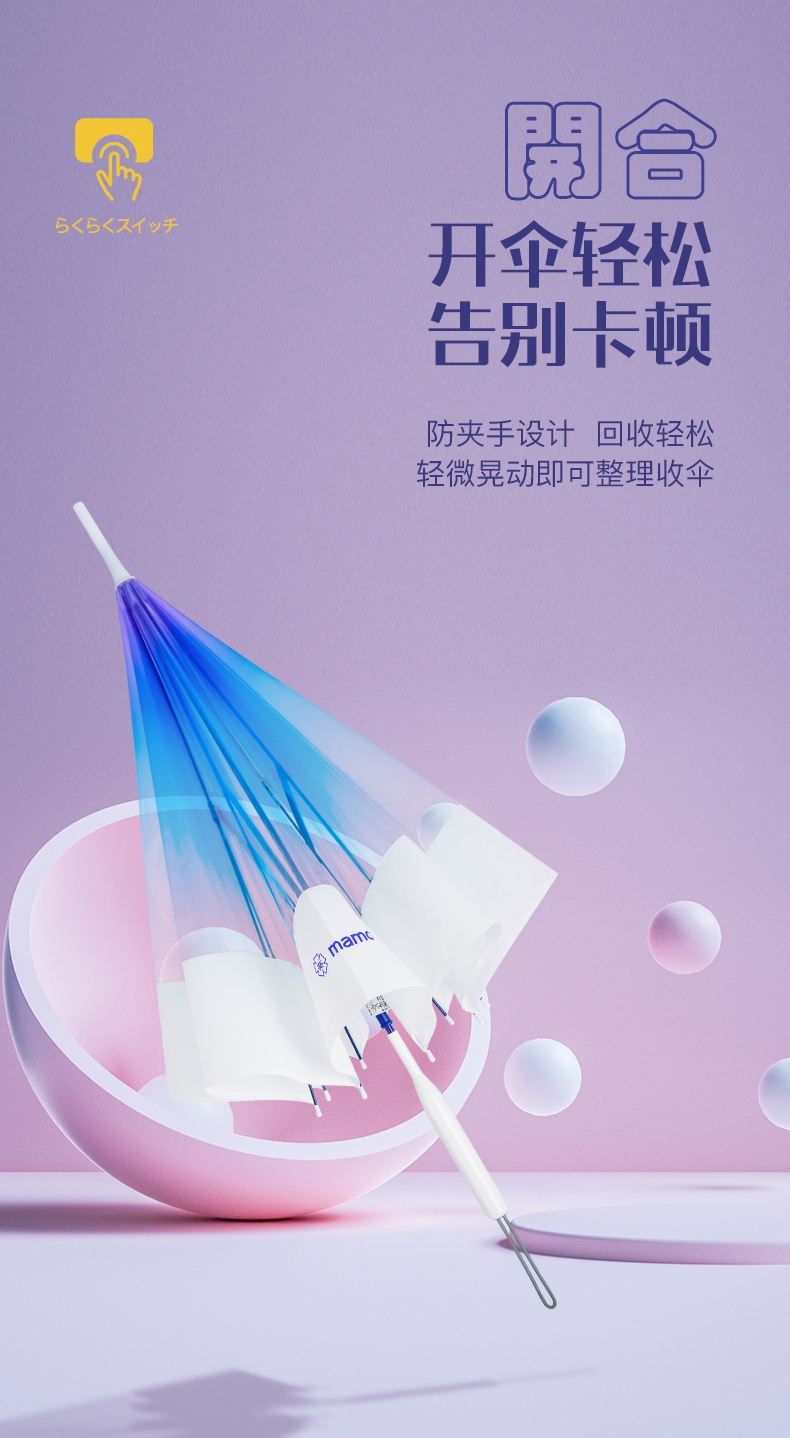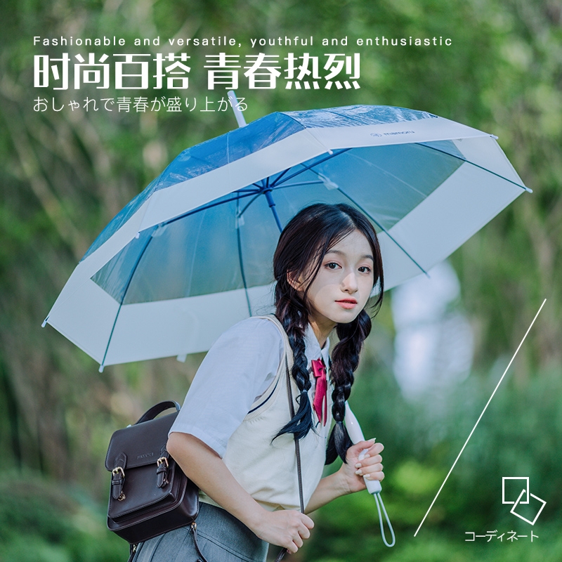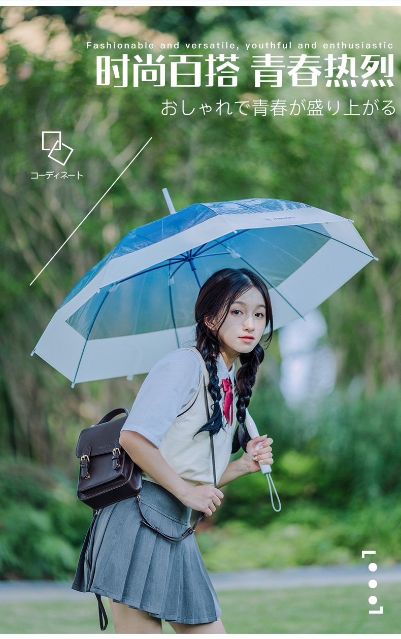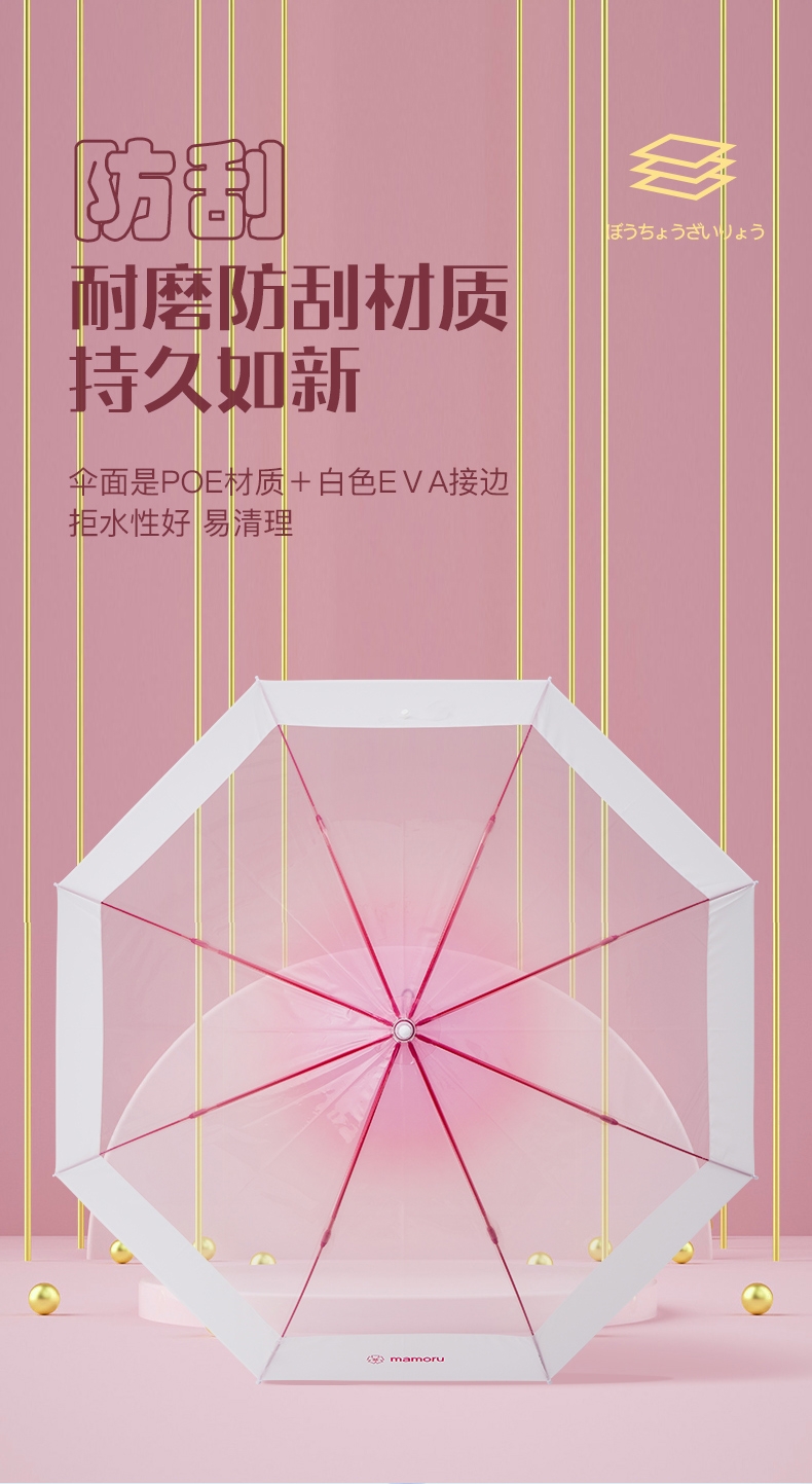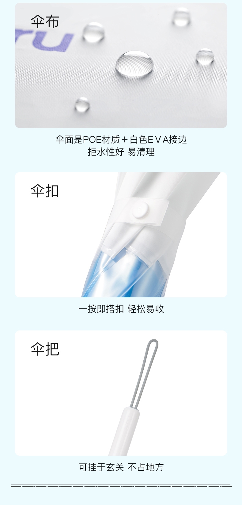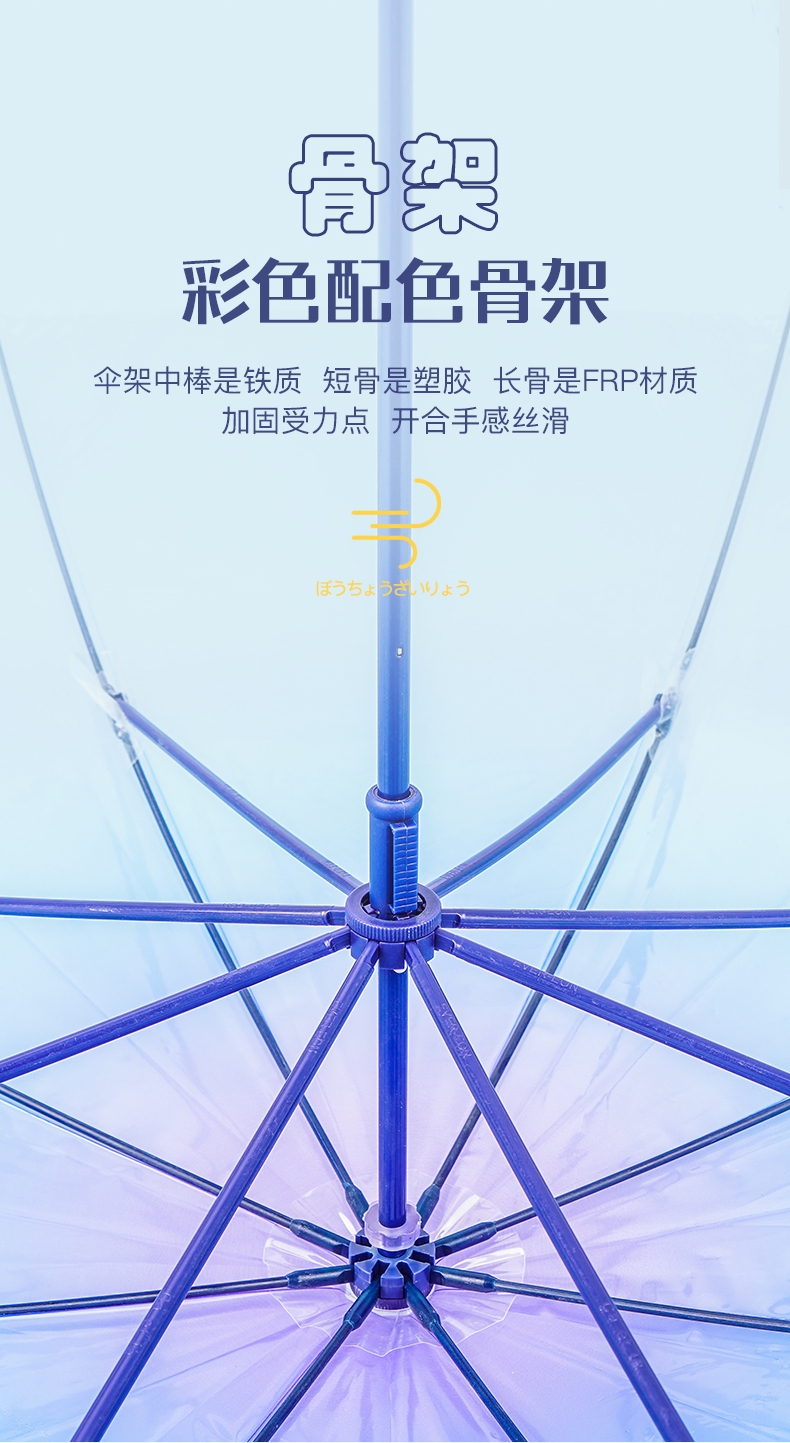伞面采用POE加厚拼接PVC渐变色的时尚设计;雨天也能绽放清透时尚;把手日本专利设计,软胶悬挂带,舒适方便