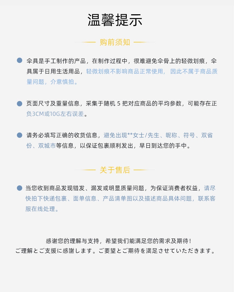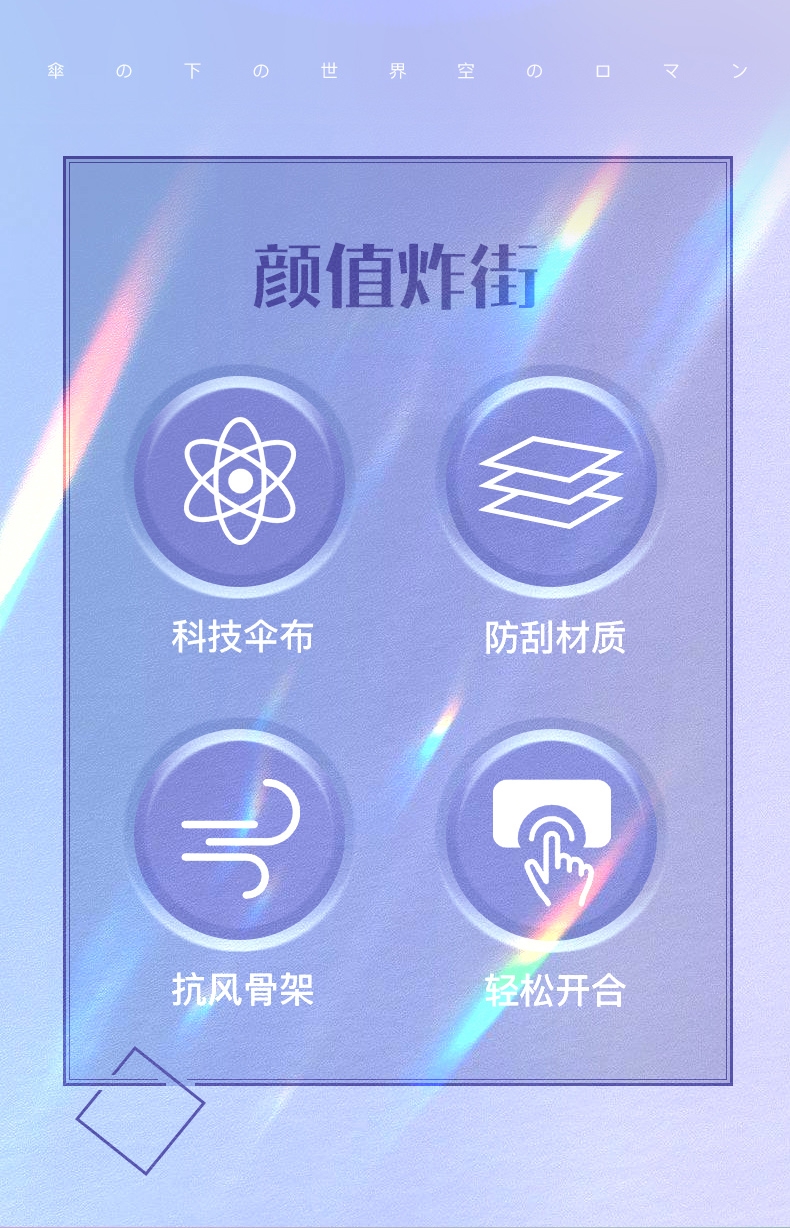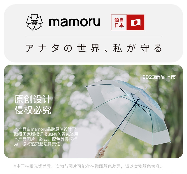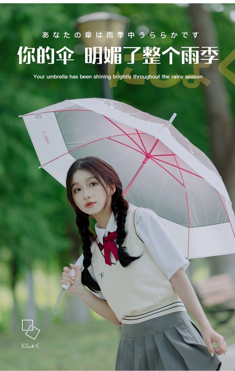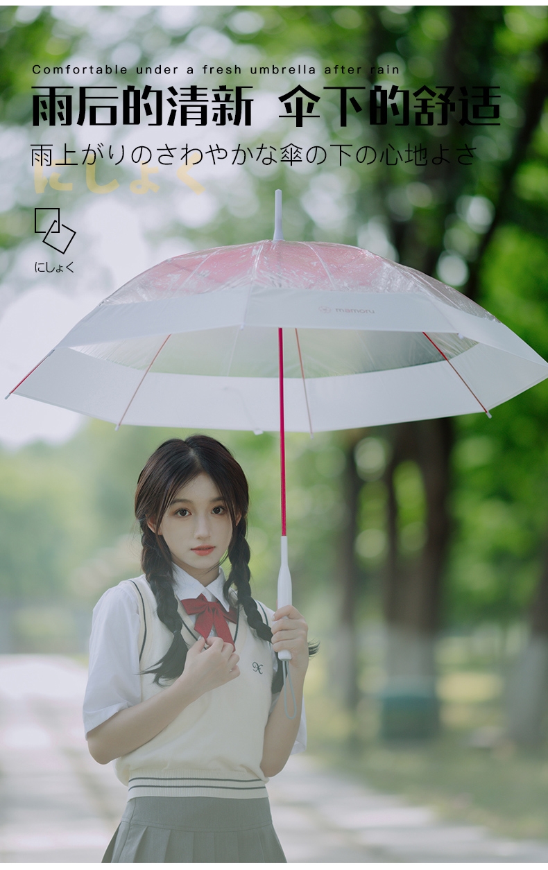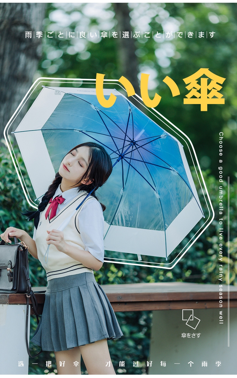 伞面采用POE加厚拼接PVC渐变色的时尚设计;雨天也能绽放清透时尚;把手日本专利设计,软胶悬挂带,舒适方便