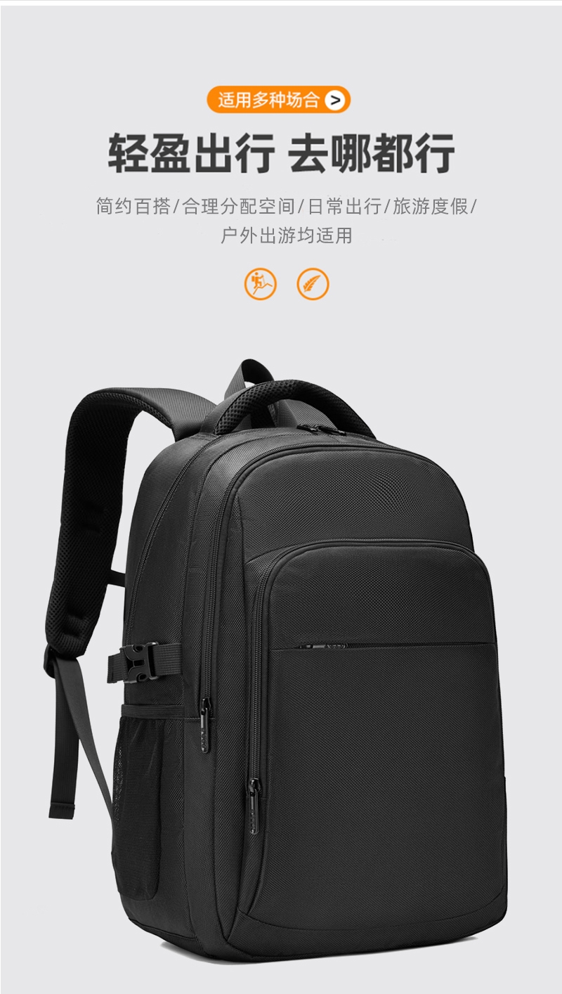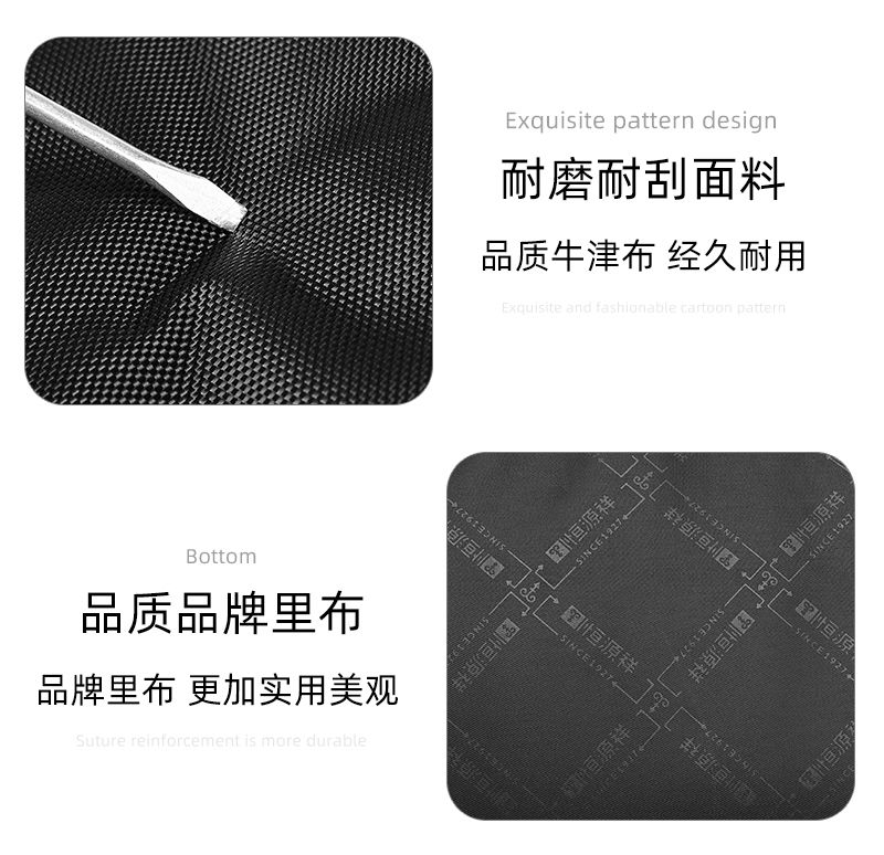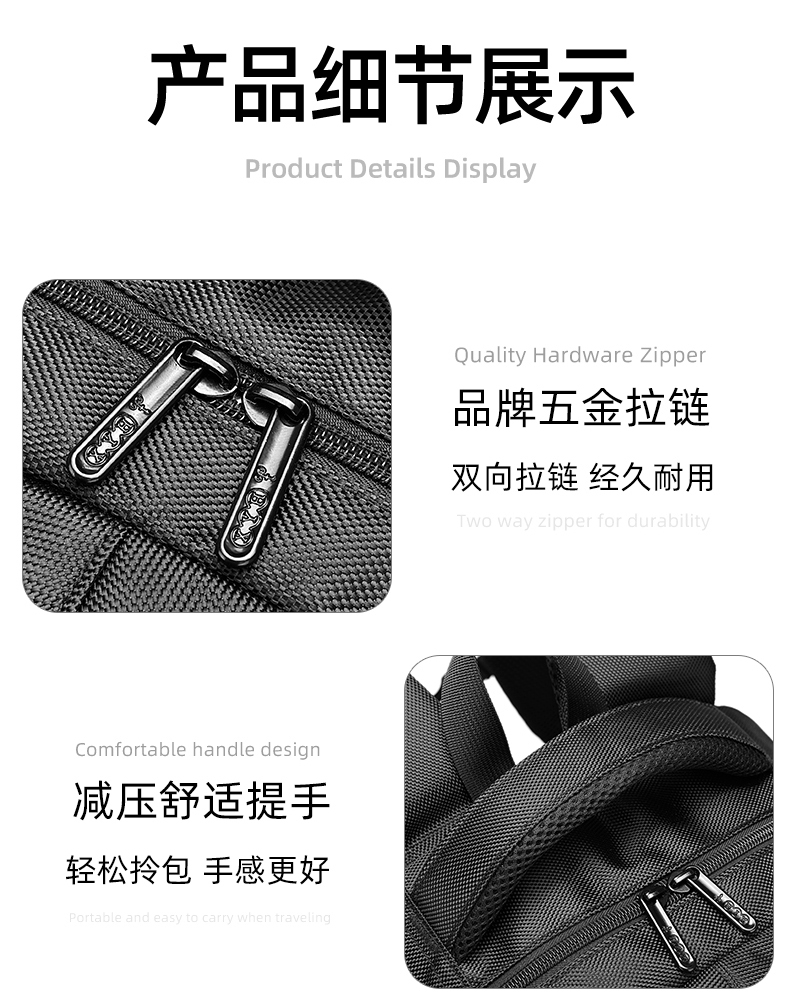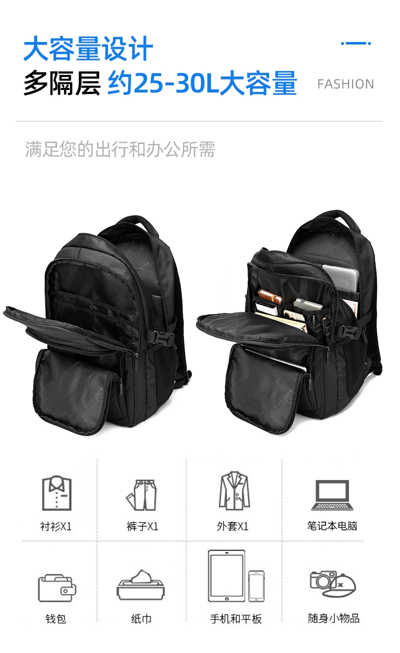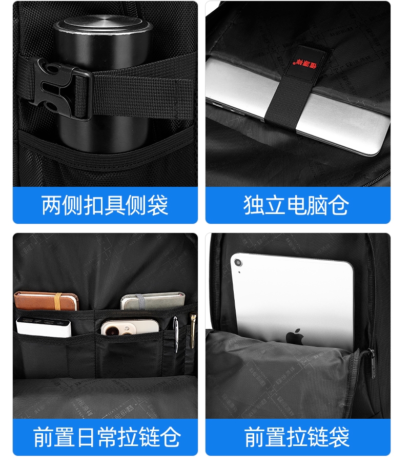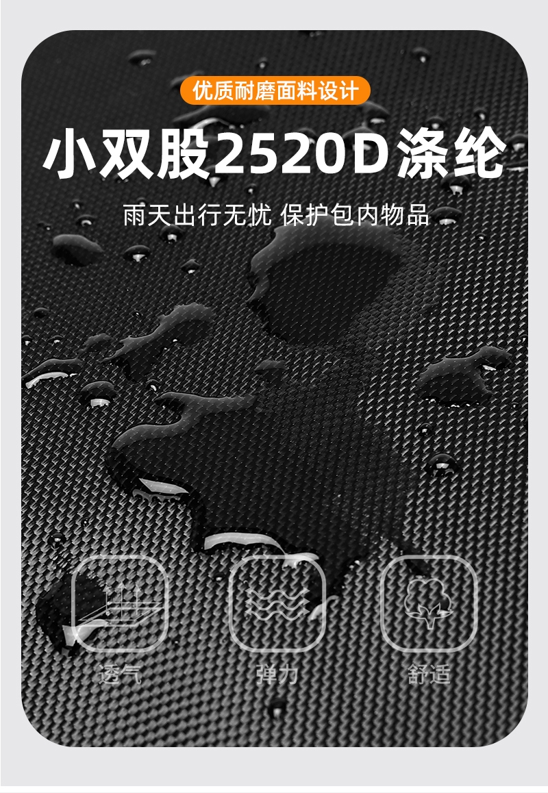 小双股2520D涤纶材质;两侧水杯、雨伞专用收纳袋;四层收纳拉链袋