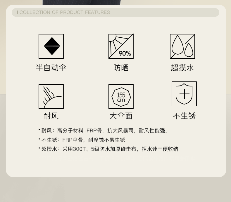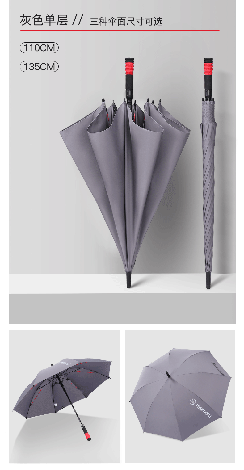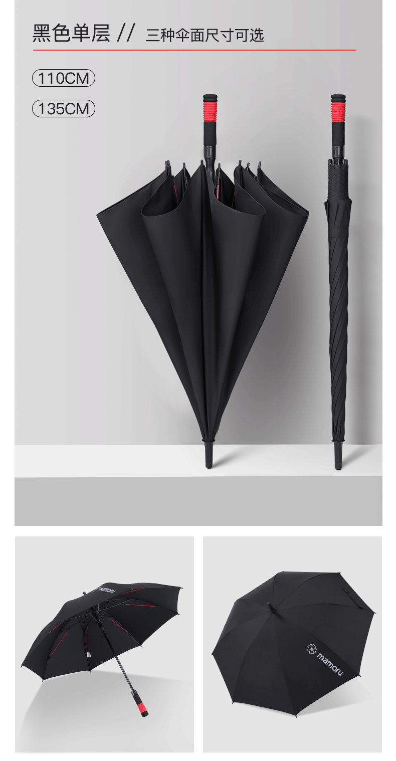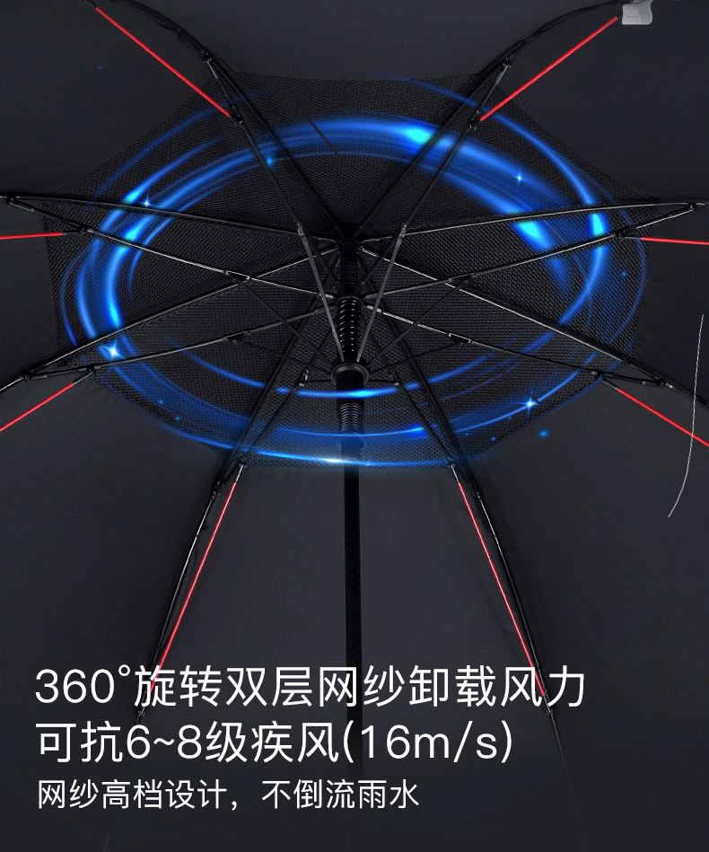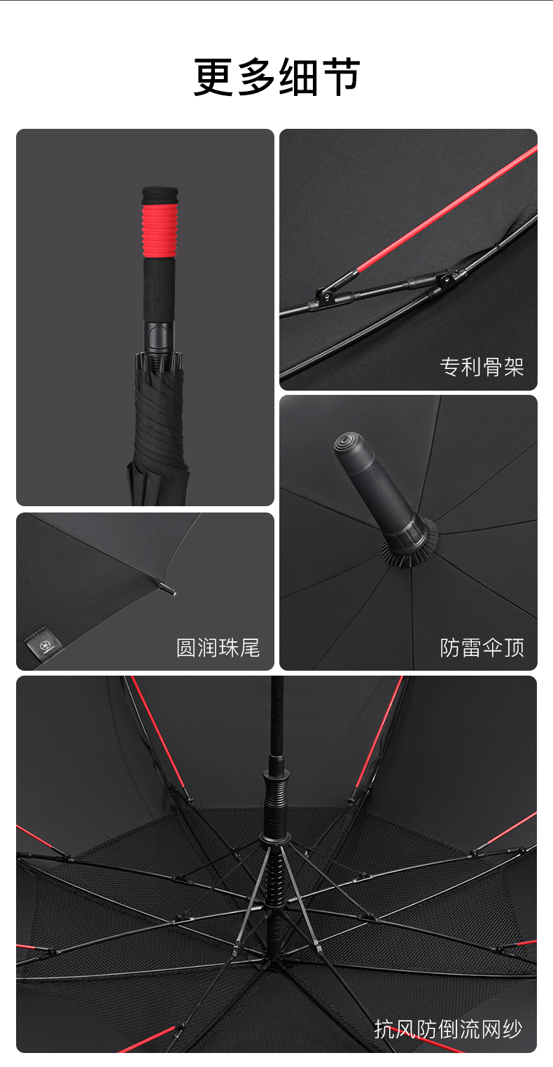 超大伞面打开直径1.35米,双层的伞面结构设计;抗风伞骨,增加了红色的抗风拉条,可抗8级风;5级超泼水面料,300T加厚防雨的同时兼顾防晒