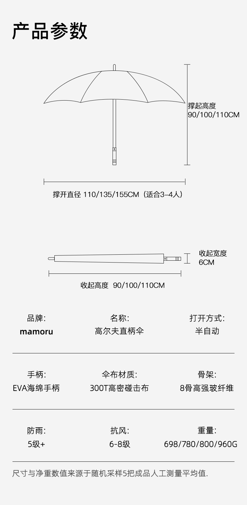 伞面尺寸/规格:135CM,750CM*8K