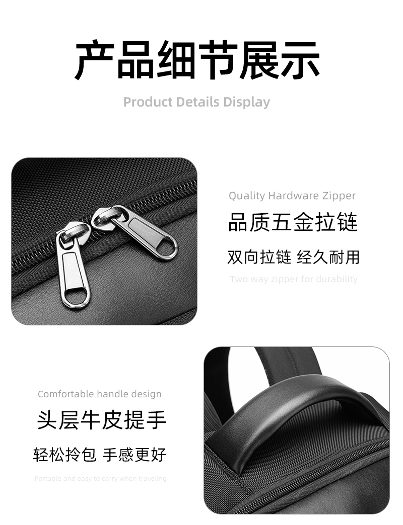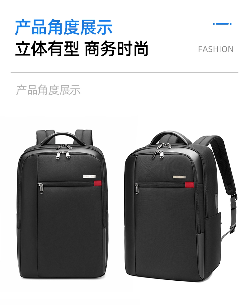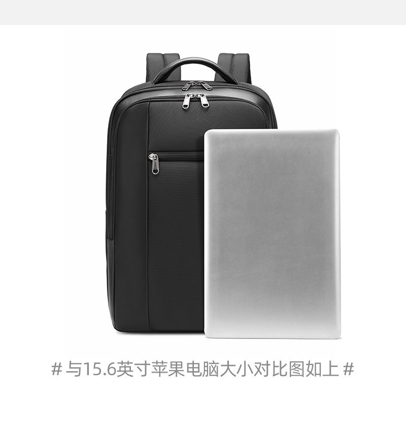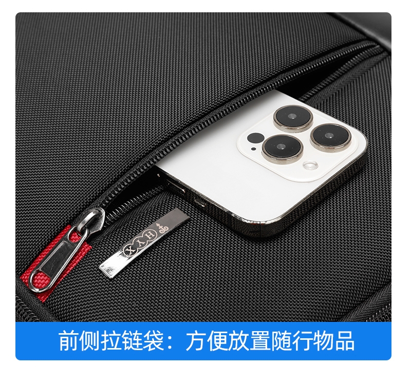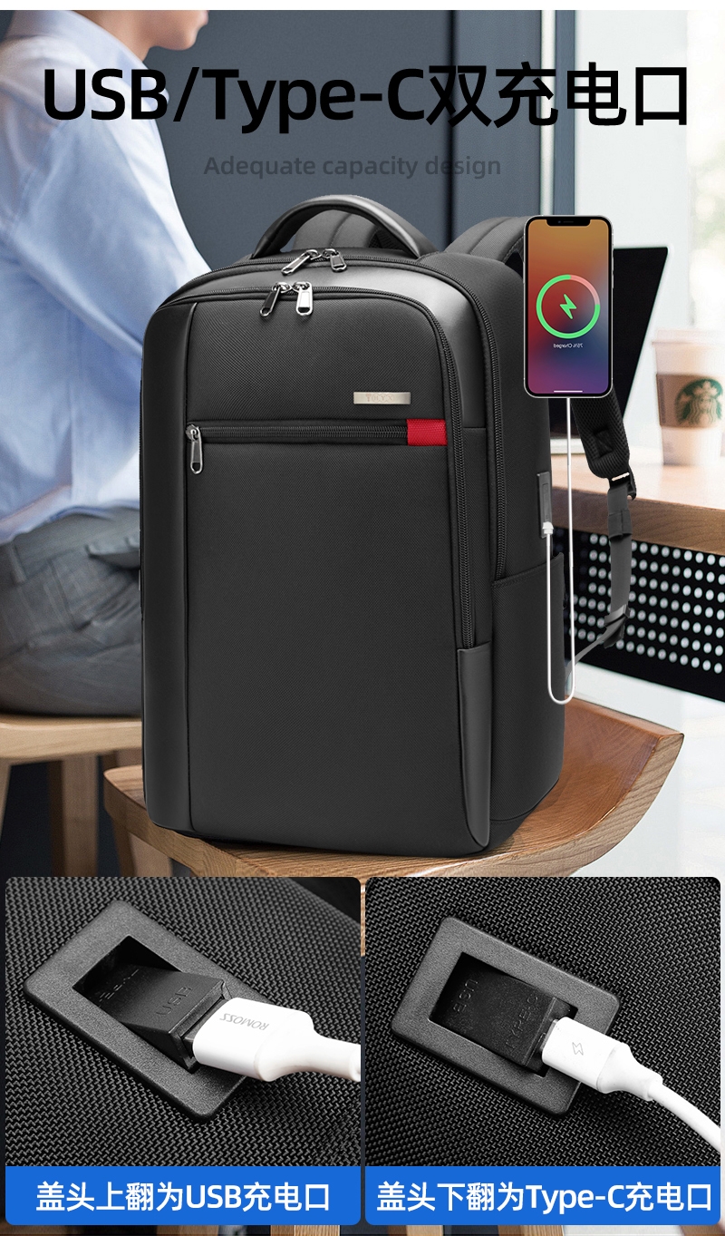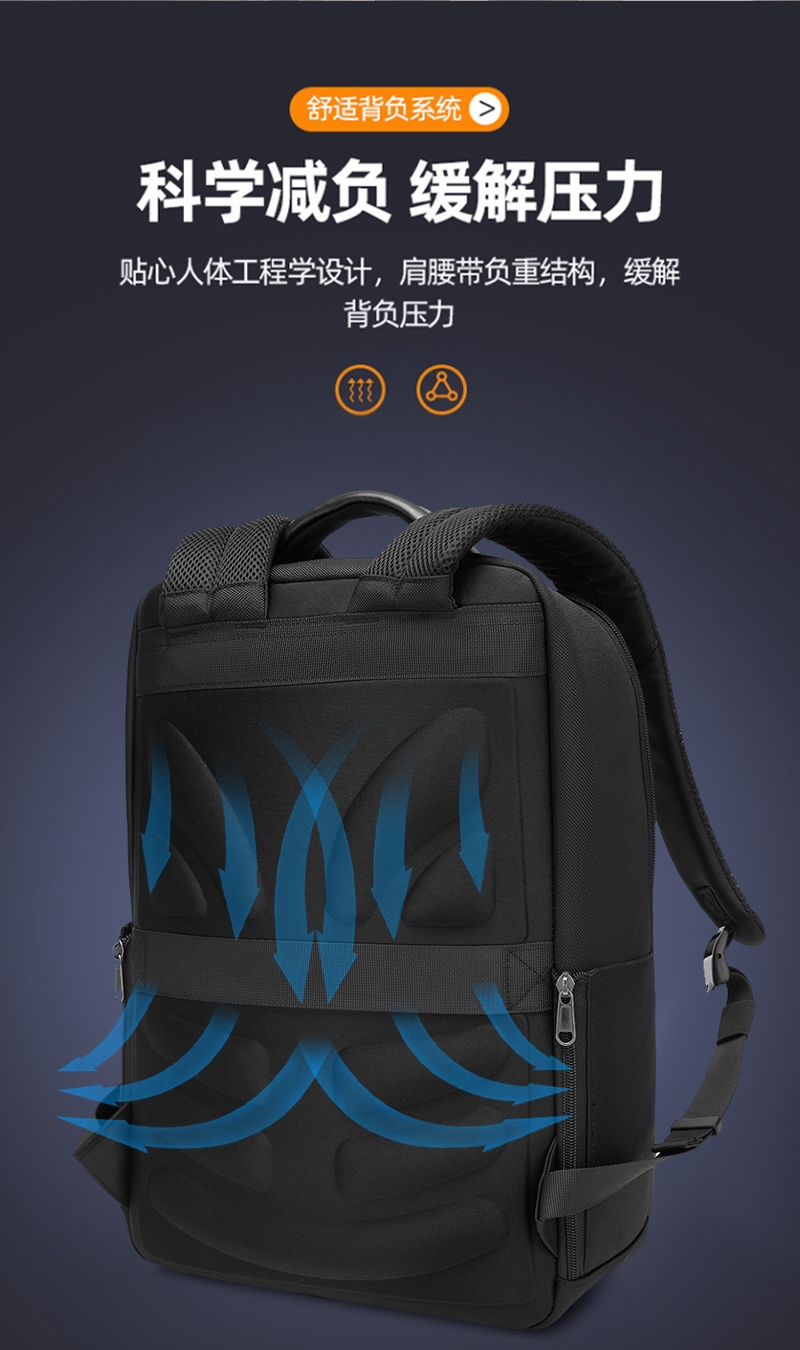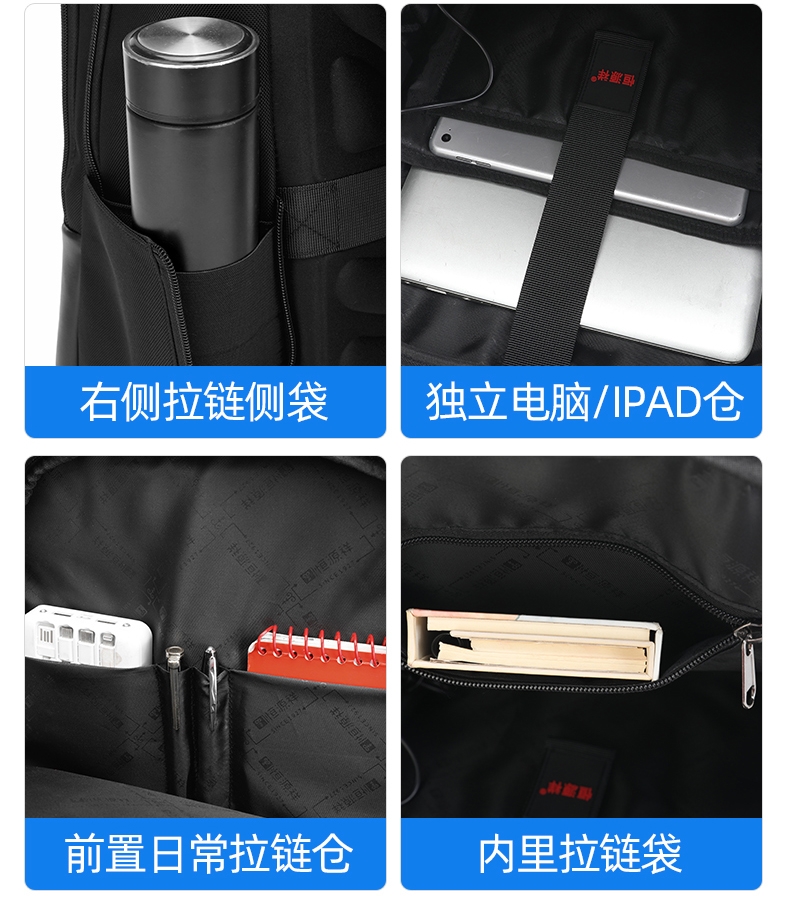 最新款翻盖式USB转接口,双头双接口;前袋可分区放置办公用品、签字笔,商务办公得心应手;部EVA一体热压防震透气背负系统