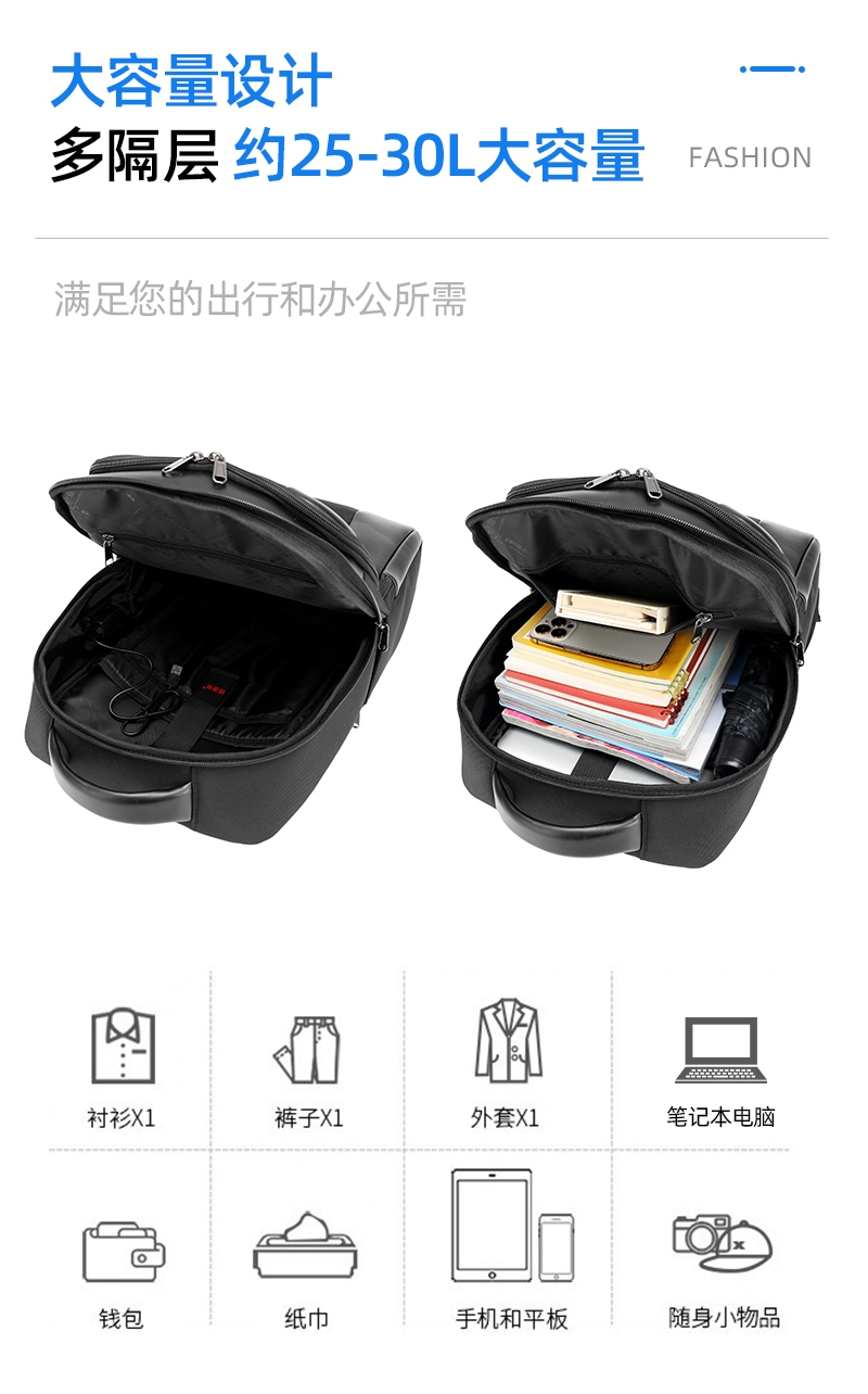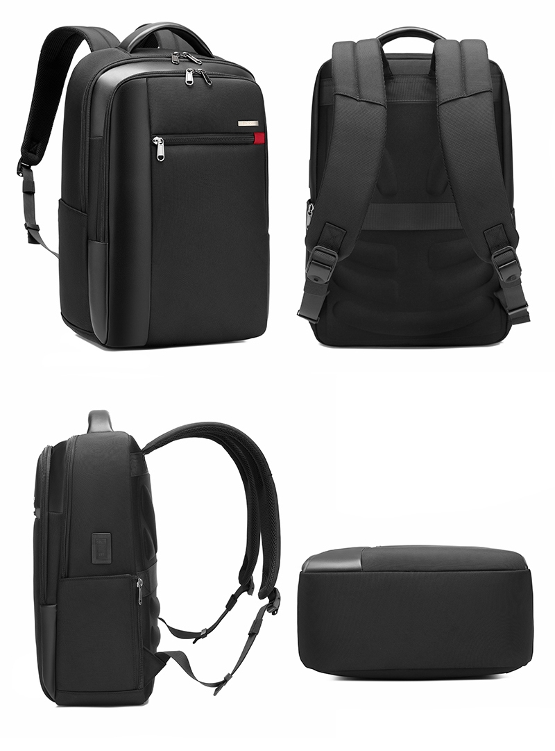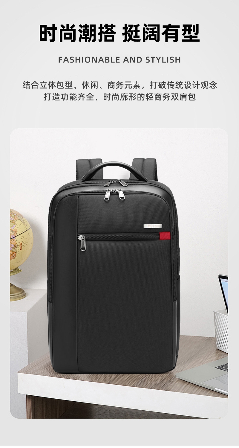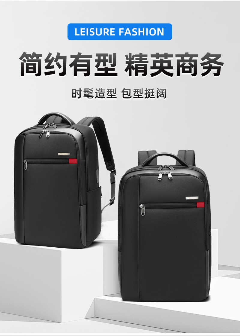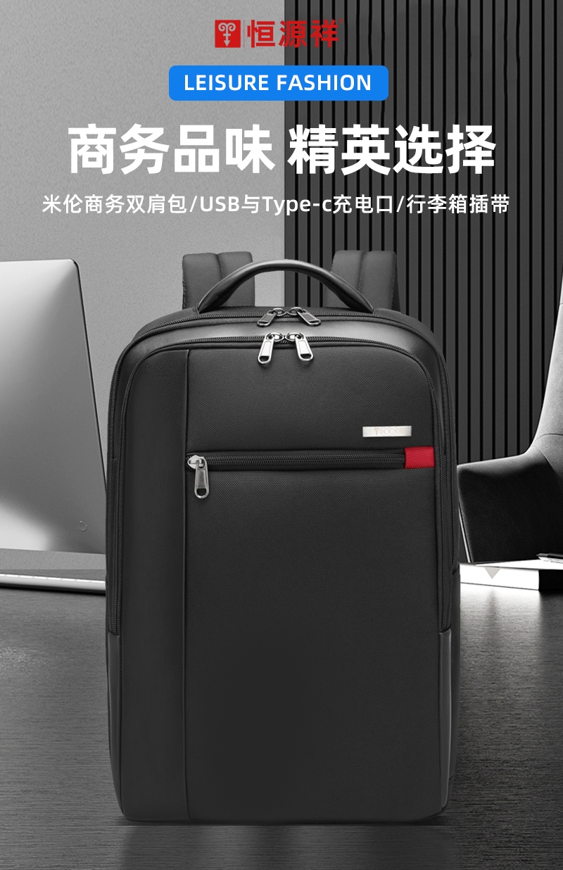 最新款翻盖式USB转接口,双头双接口;前袋可分区放置办公用品、签字笔,商务办公得心应手;部EVA一体热压防震透气背负系统