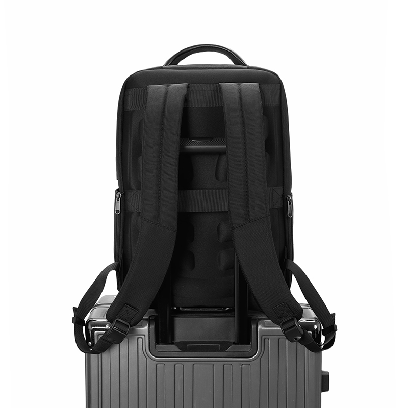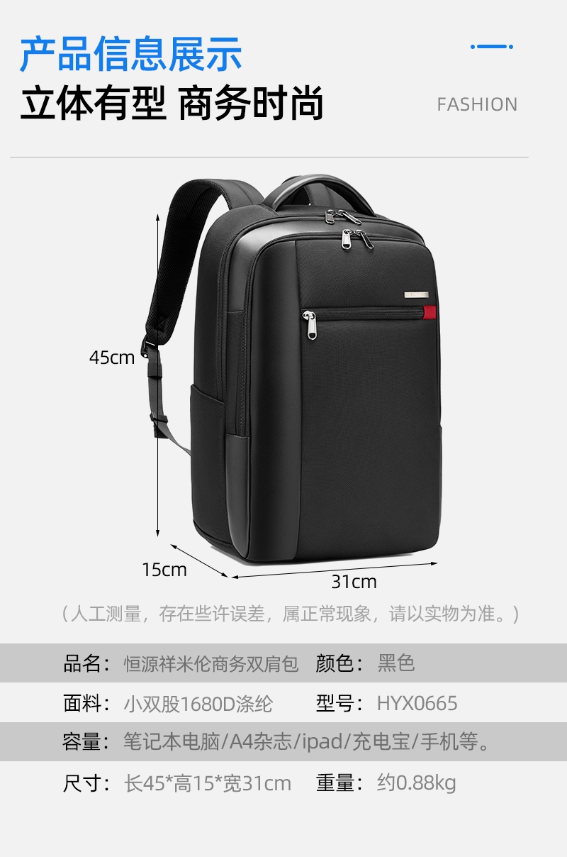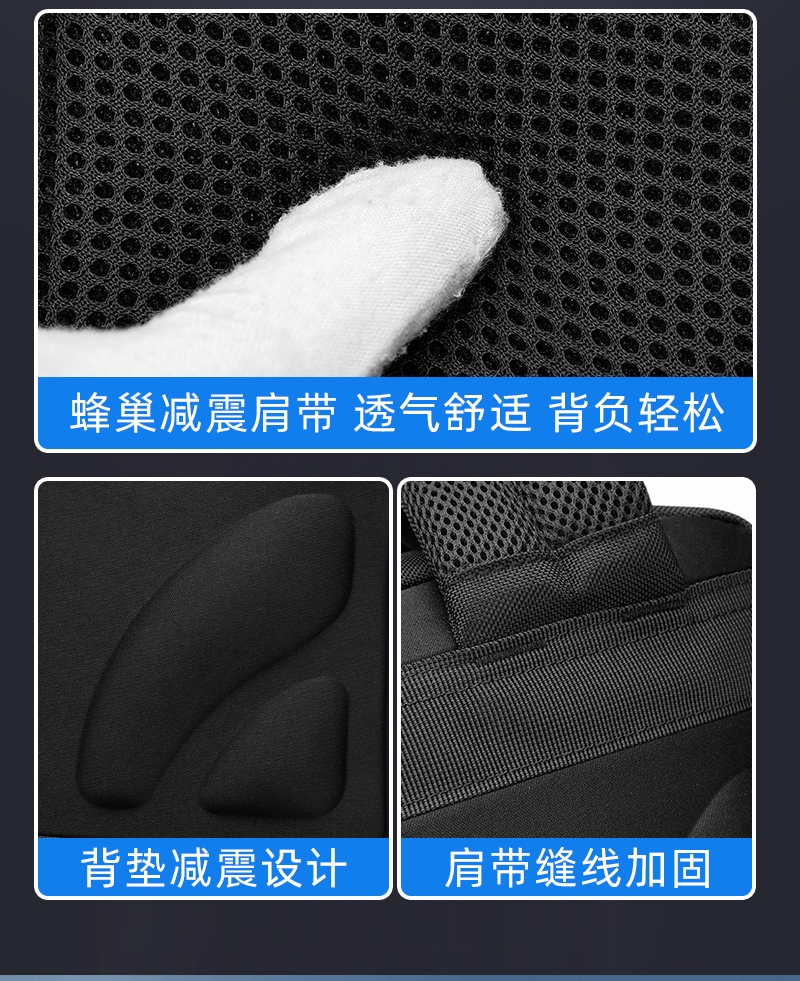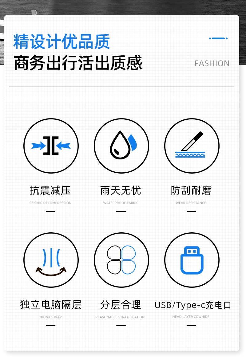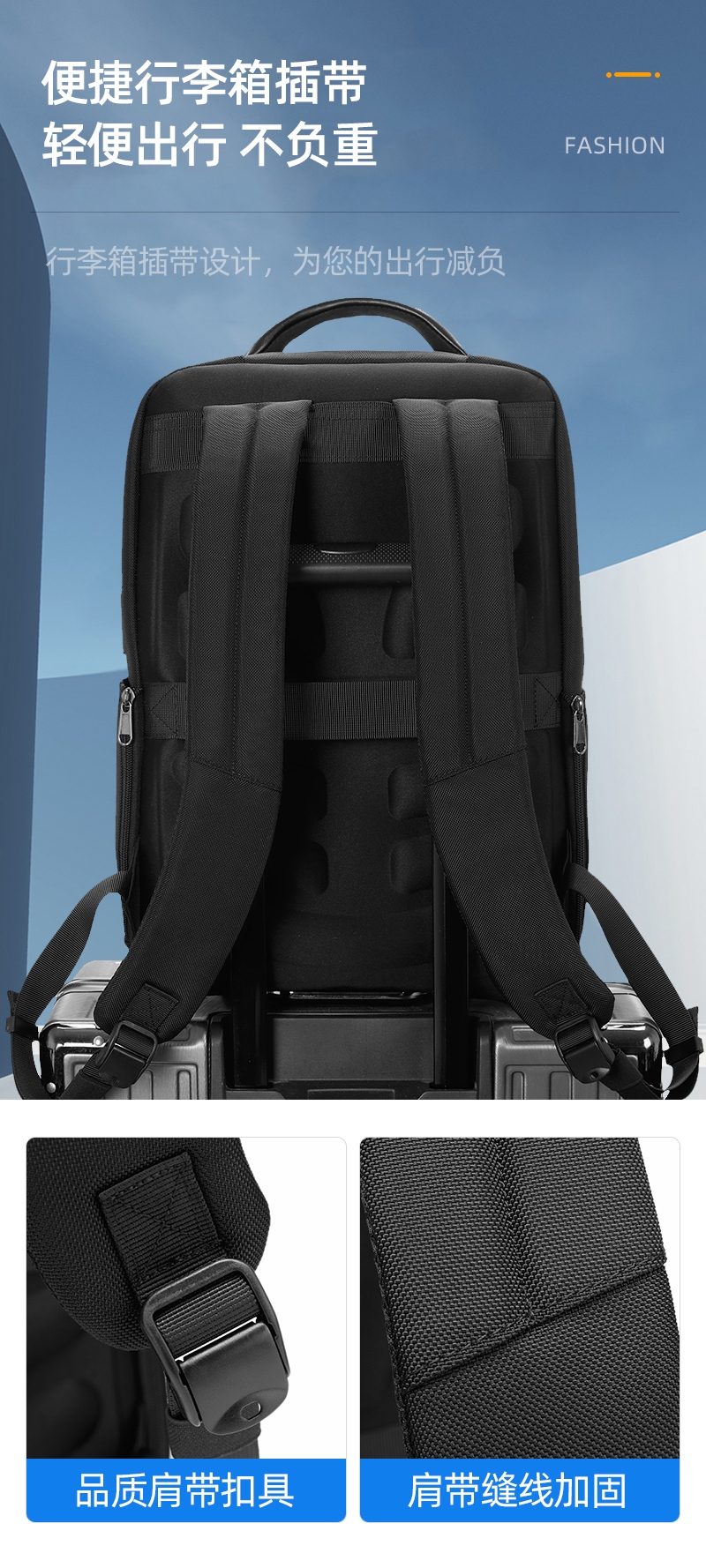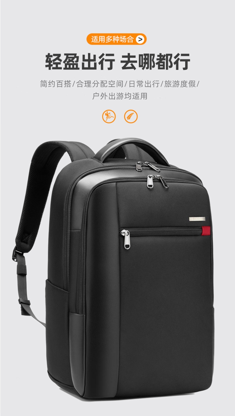 最新款翻盖式USB转接口,双头双接口;前袋可分区放置办公用品、签字笔,商务办公得心应手;部EVA一体热压防震透气背负系统