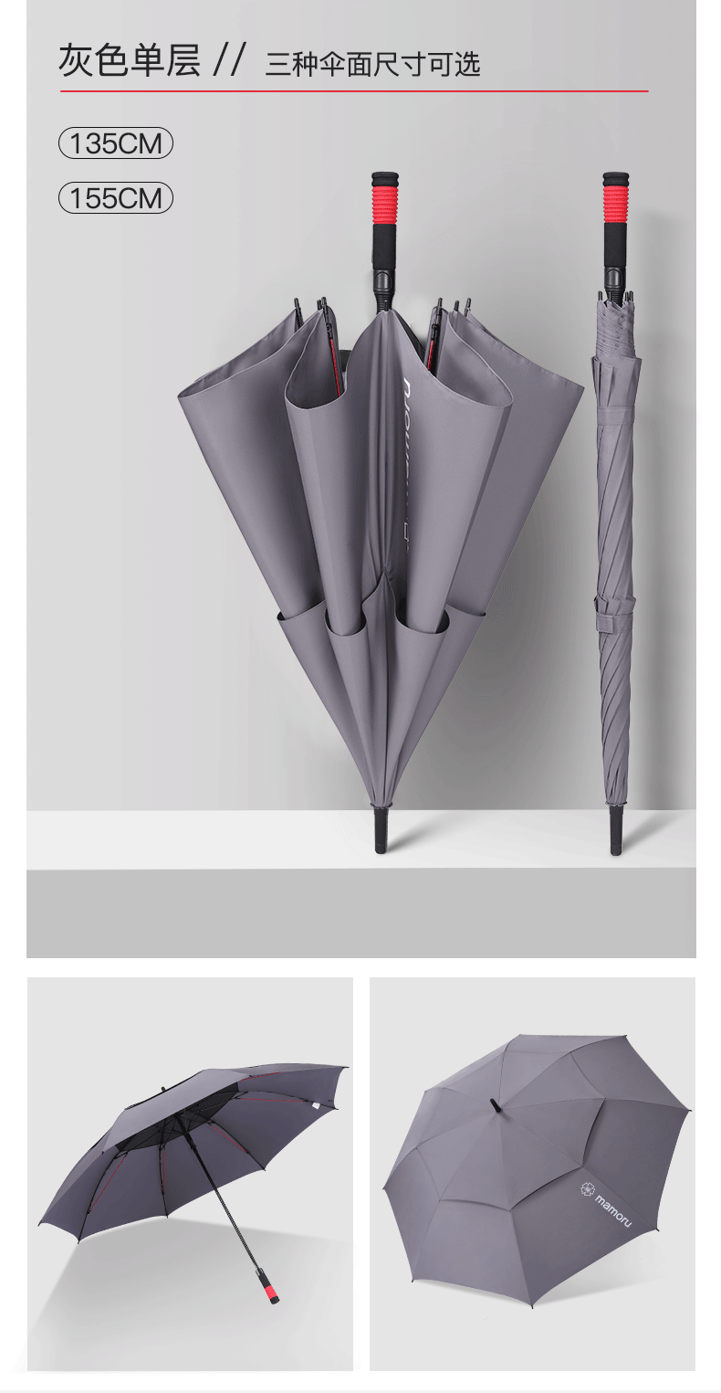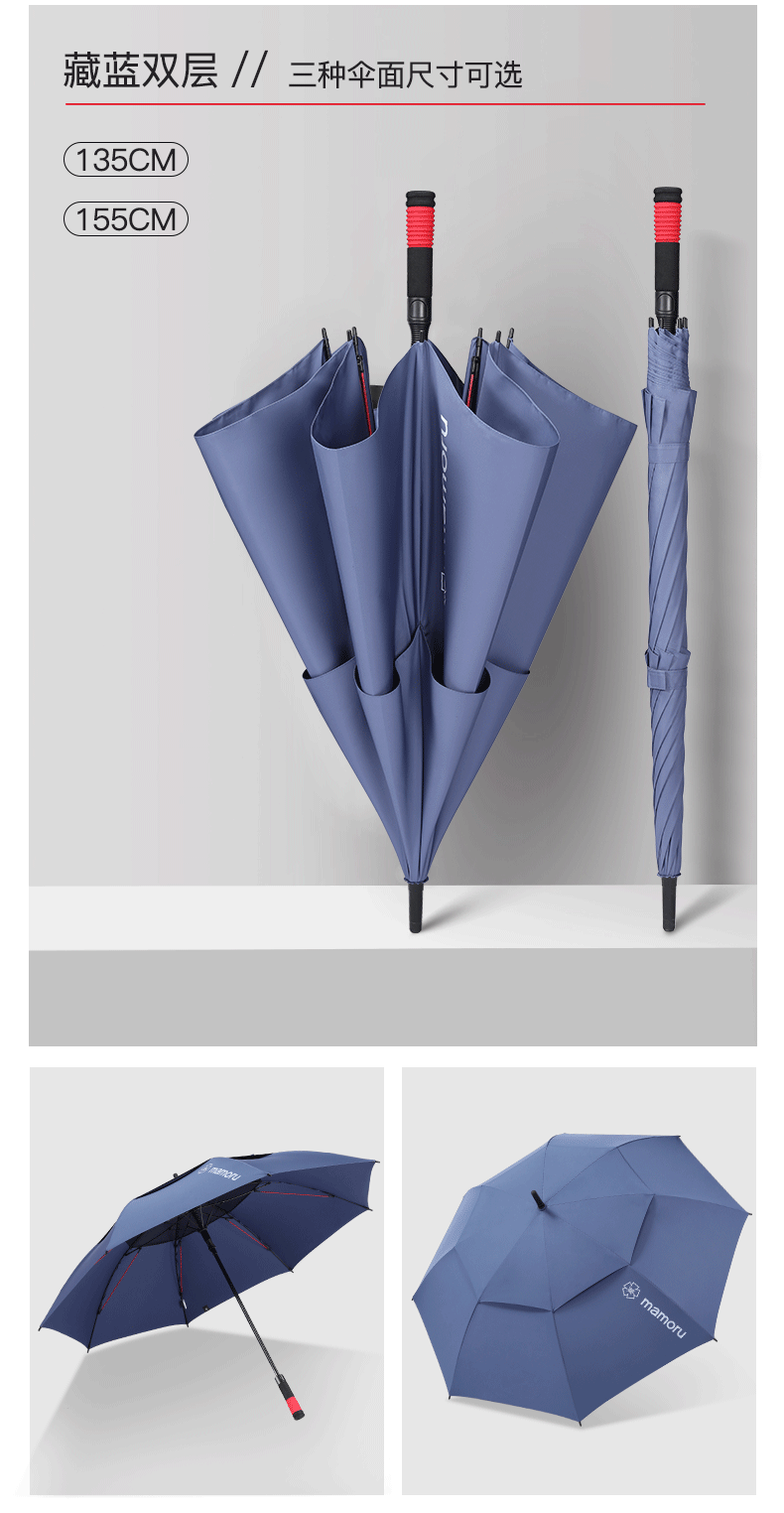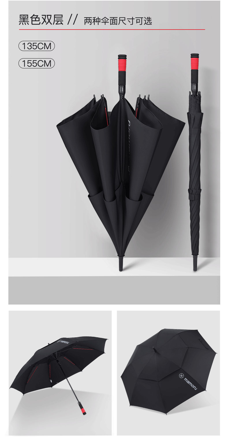 超大伞面打开直径1.55米,双层的伞面结构设计;抗风伞骨,增加了红色的抗风拉条,可抗8级风;5级超泼水面料,300T加厚防雨的同时兼顾防晒