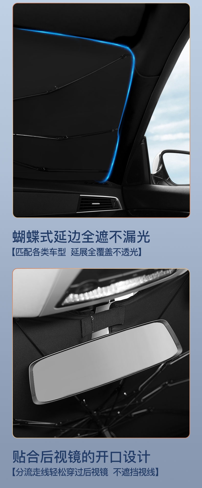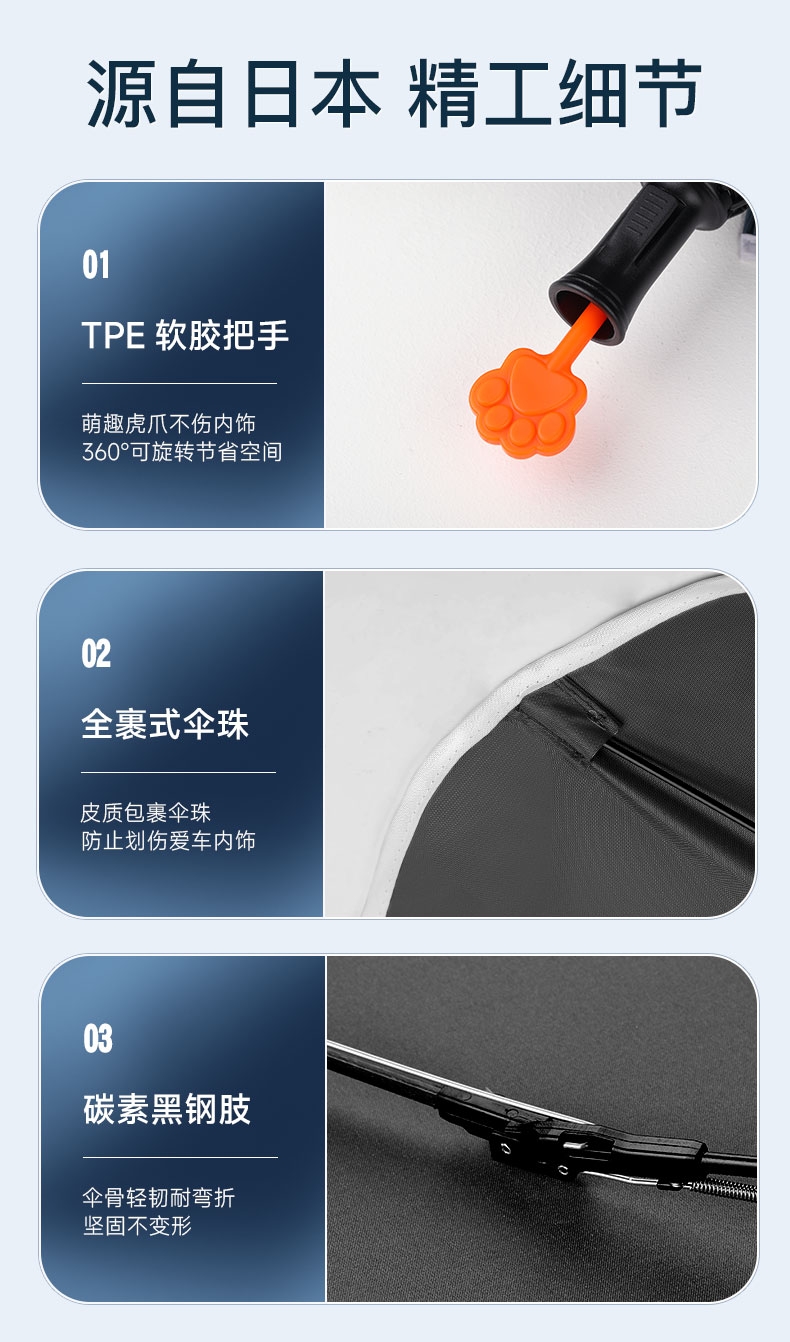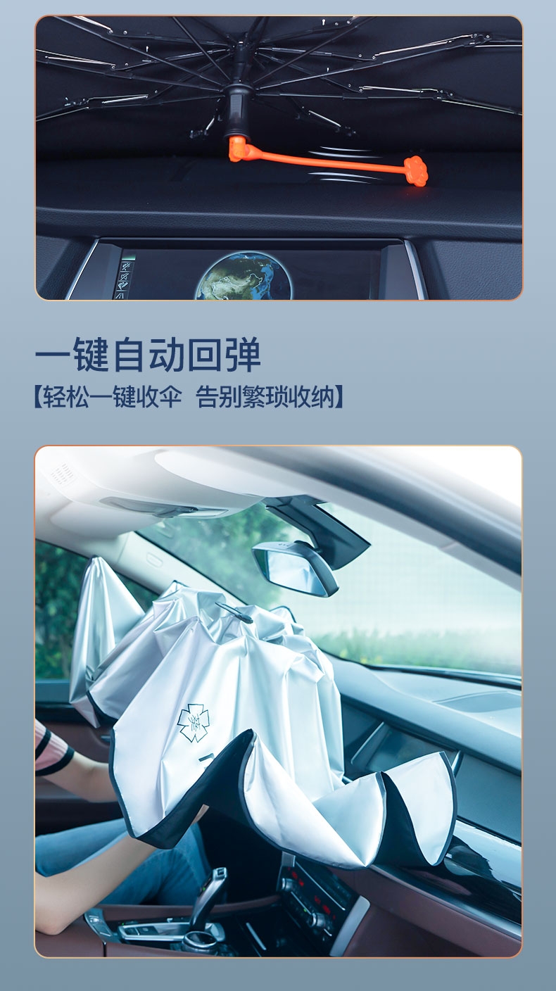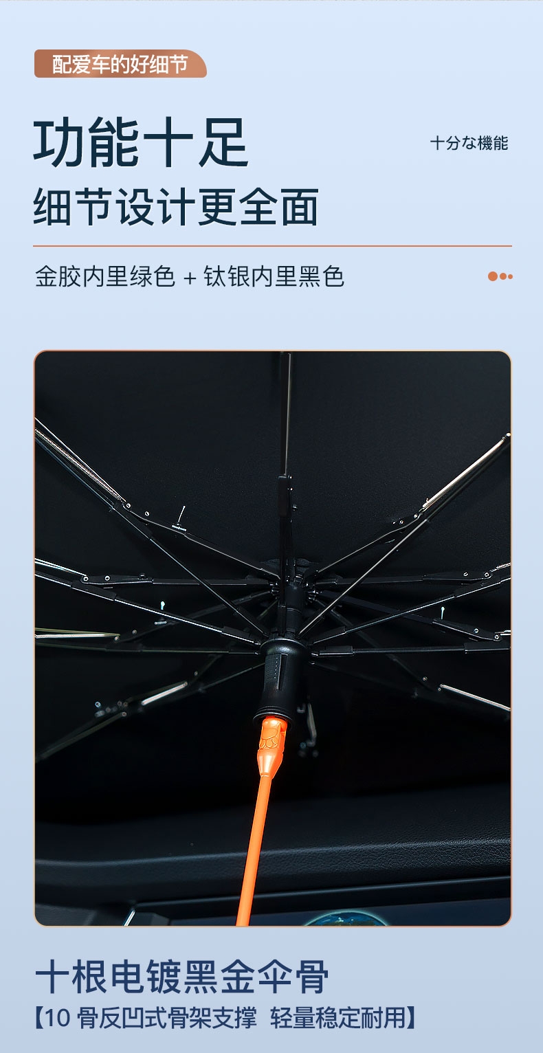 一片式汽车伞通常具备防雨涂层;配备了防紫外线涂层;一片式汽车伞通常设计为大面积的伞盖