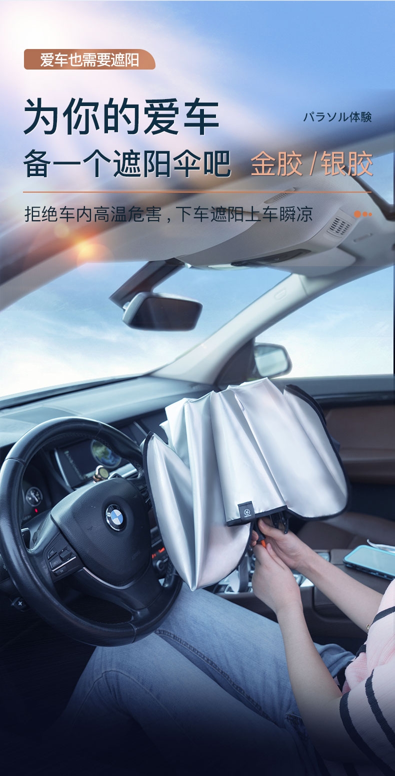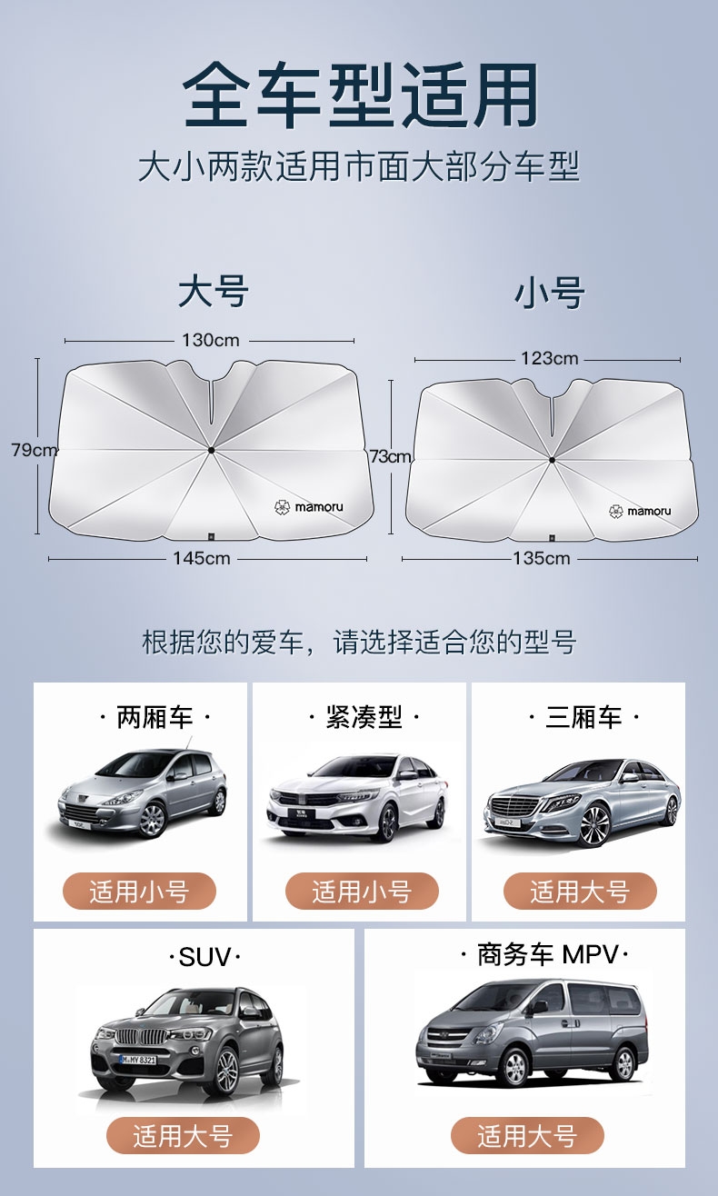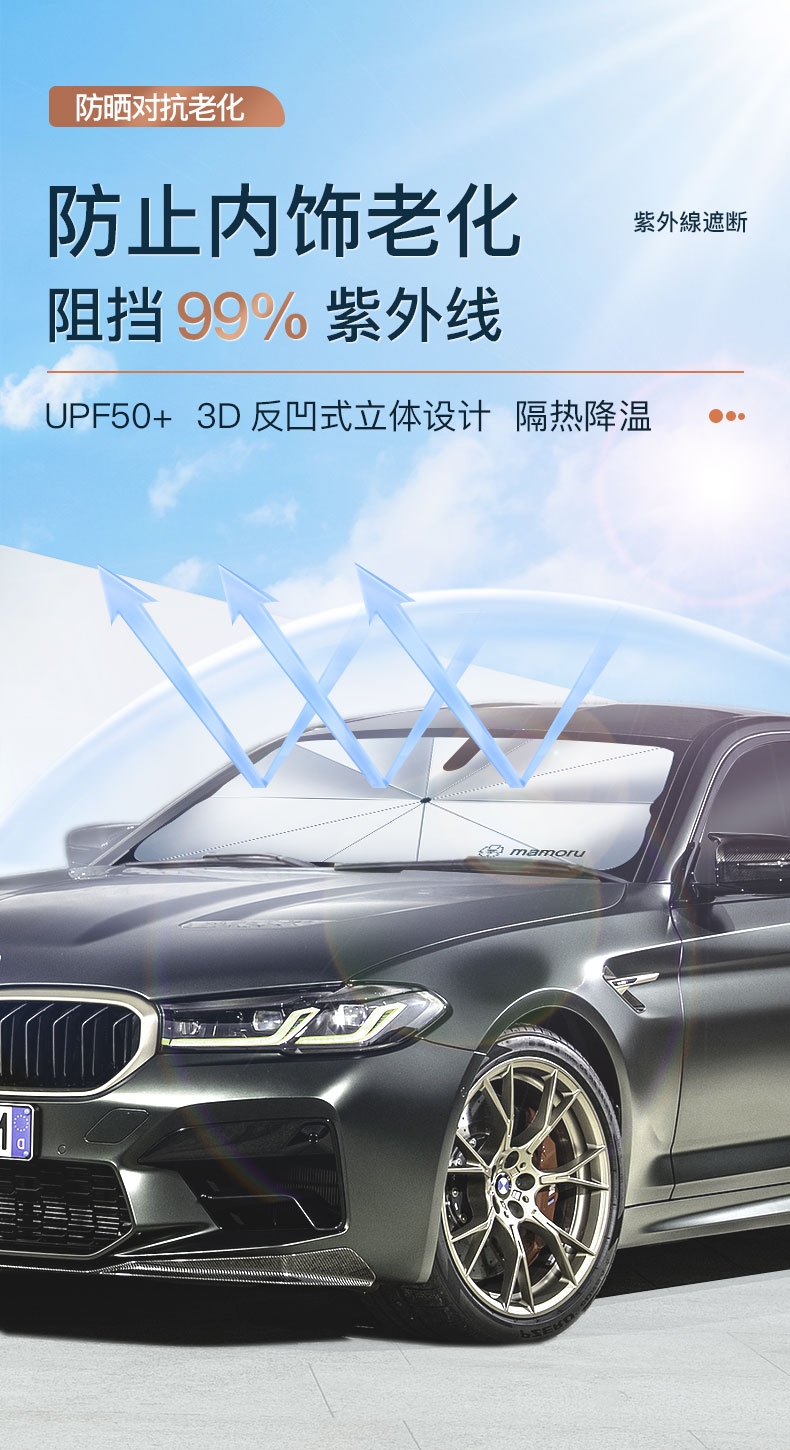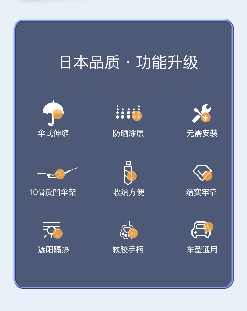 一片式汽车伞通常具备防雨涂层;配备了防紫外线涂层;一片式汽车伞通常设计为大面积的伞盖