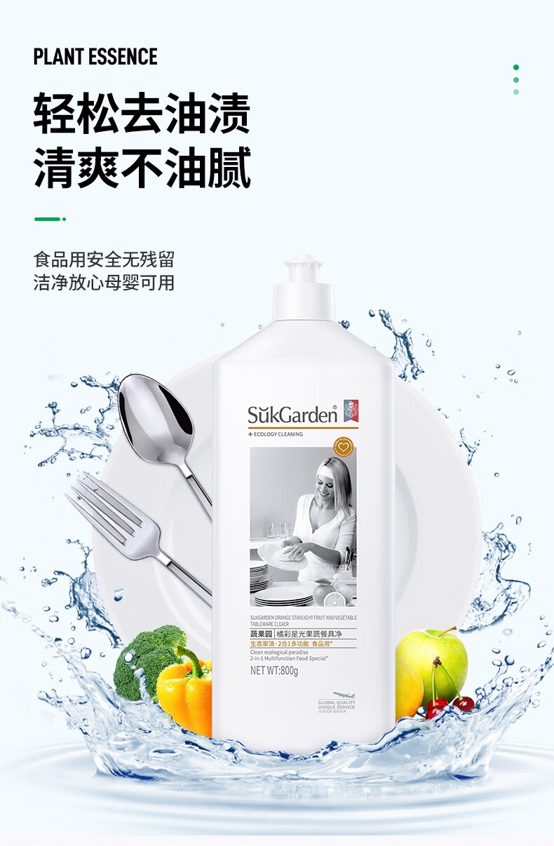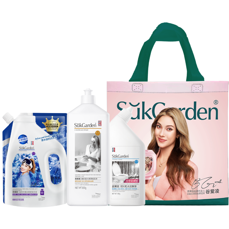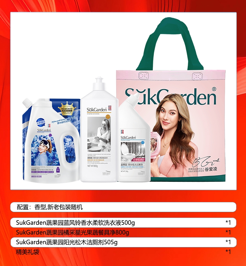 配置清单:配置明细:新老包装随机发货 SukGarden蔬果园蓝风铃香水柔软洗衣液(持久留香)(带嘴) 500g*1 SukGarden蔬果园橘采星光果蔬餐具净(食用级安全无残留)800g*1 SukGarden蔬果园阳光松木洁厕剂(强效去垢型)505g*1 精美礼袋ZS107*1