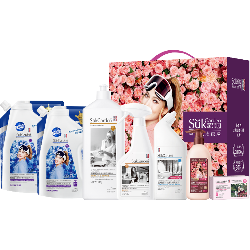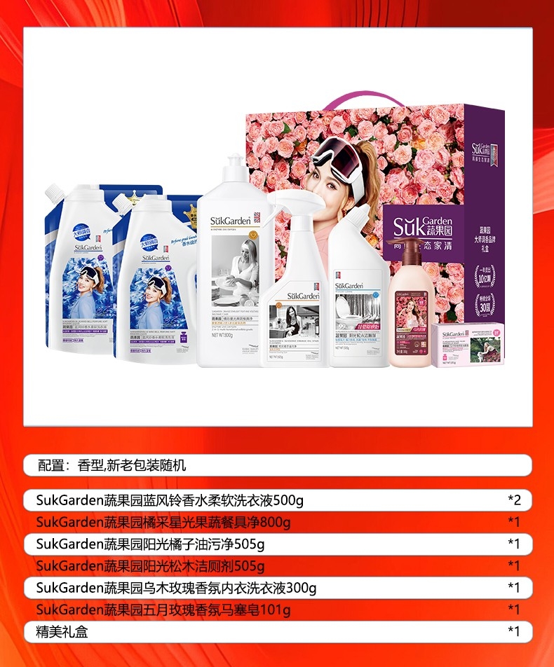 配置清单:配置明细:新老包装随机发货 SukGarden蔬果园蓝风铃香水柔软洗衣液(持久留香)(带嘴) 500g*2 SukGarden蔬果园橘采星光果蔬餐具净(食用级安全无残留)800g*1 SukGarden蔬果园阳光橘子油污净(强效洁净型)505g*1 SukGarden蔬果园阳光松木洁厕剂(强效去垢型)505g*1 SukGarden蔬果园乌木玫瑰香氛内衣洗衣液300g*1 SukGarden蔬果园五月玫瑰香氛马塞皂101g*1 精美礼盒ZS198*1