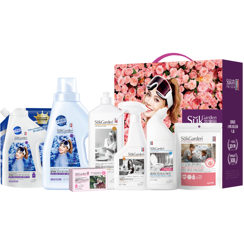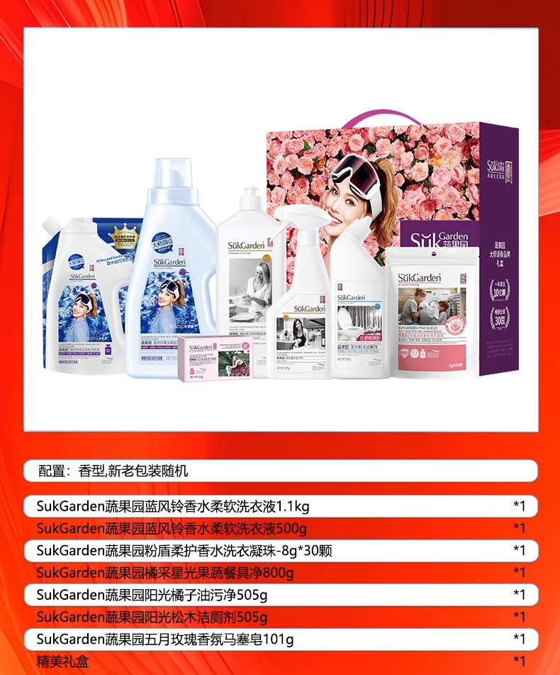 配置清单:配置明细:新老包装随机发货 SukGarden蔬果园蓝风铃香水柔软洗衣液(持久留香)1.1kg*1 SukGarden蔬果园蓝风铃香水柔软洗衣液(持久留香)(带嘴) 500g*1 SukGarden蔬果园粉盾柔护香水洗衣凝珠-8g*30颗(袋装)*1 SukGarden蔬果园橘采星光果蔬餐具净(食用级安全无残留)800g*1 SukGarden蔬果园阳光橘子油污净(强效洁净型)505g*1 SukGarden蔬果园阳光松木洁厕剂(强效去垢型)505g*1 SukGarden蔬果园五月玫瑰香氛马塞皂101g*1 精美礼盒ZS198*1