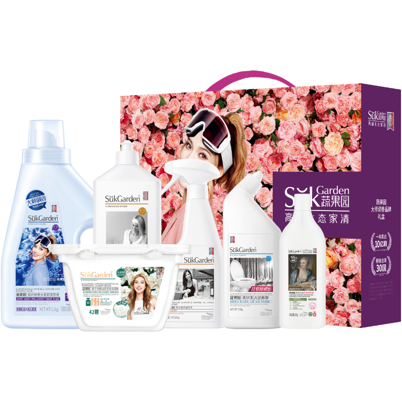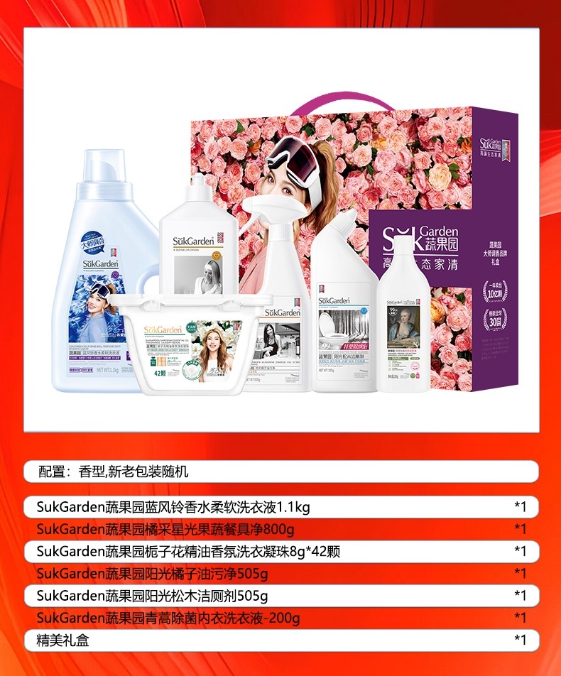 配置清单:配置明细:新老包装随机发货 SukGarden蔬果园蓝风铃香水柔软洗衣液(持久留香)1.1kg*1 SukGarden蔬果园栀子花精油香氛洗衣凝珠8g*42颗*1 SukGarden蔬果园橘采星光果蔬餐具净(食用级安全无残留)800g*1 SukGarden蔬果园阳光橘子油污净(强效洁净型)505g*1 SukGarden蔬果园阳光松木洁厕剂(强效去垢型)505g*1 SukGarden蔬果园青蒿除菌内衣洗衣液-200g*1 精美礼盒ZS199*1