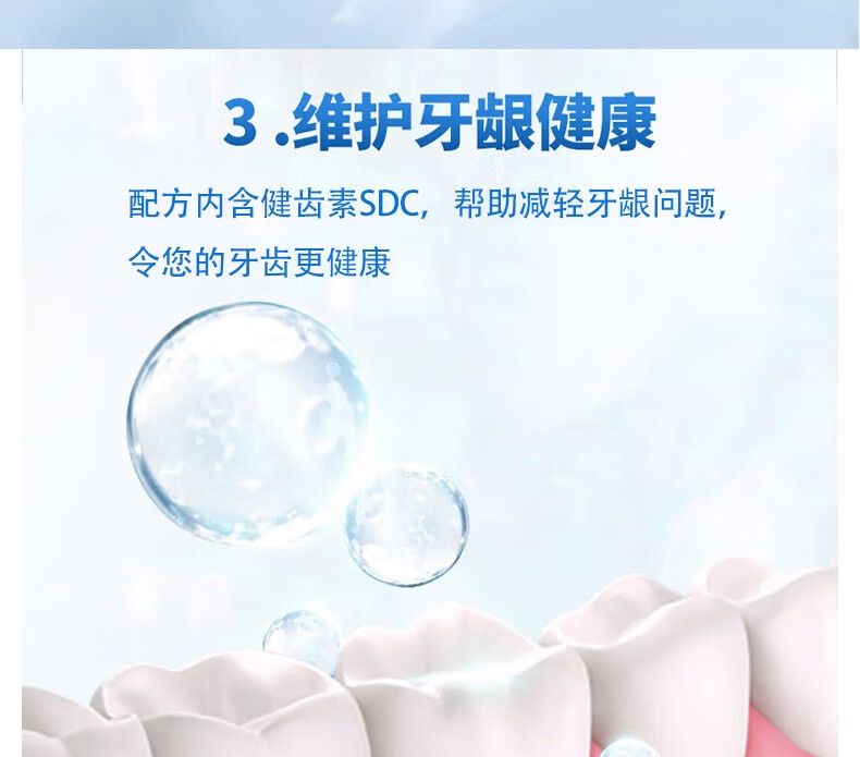 含有抗敏感成分,快速缓解牙齿敏感;配方中添加了护龈成分,有助于牙龈健康;减少牙龈出血和红肿