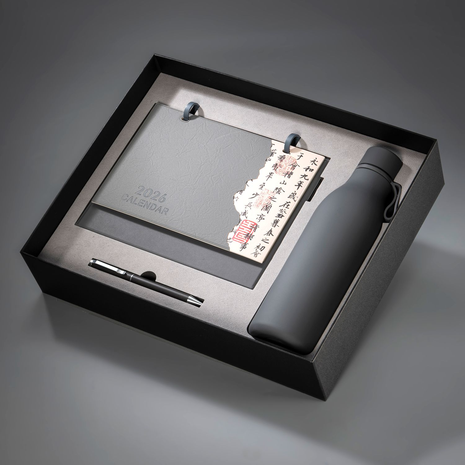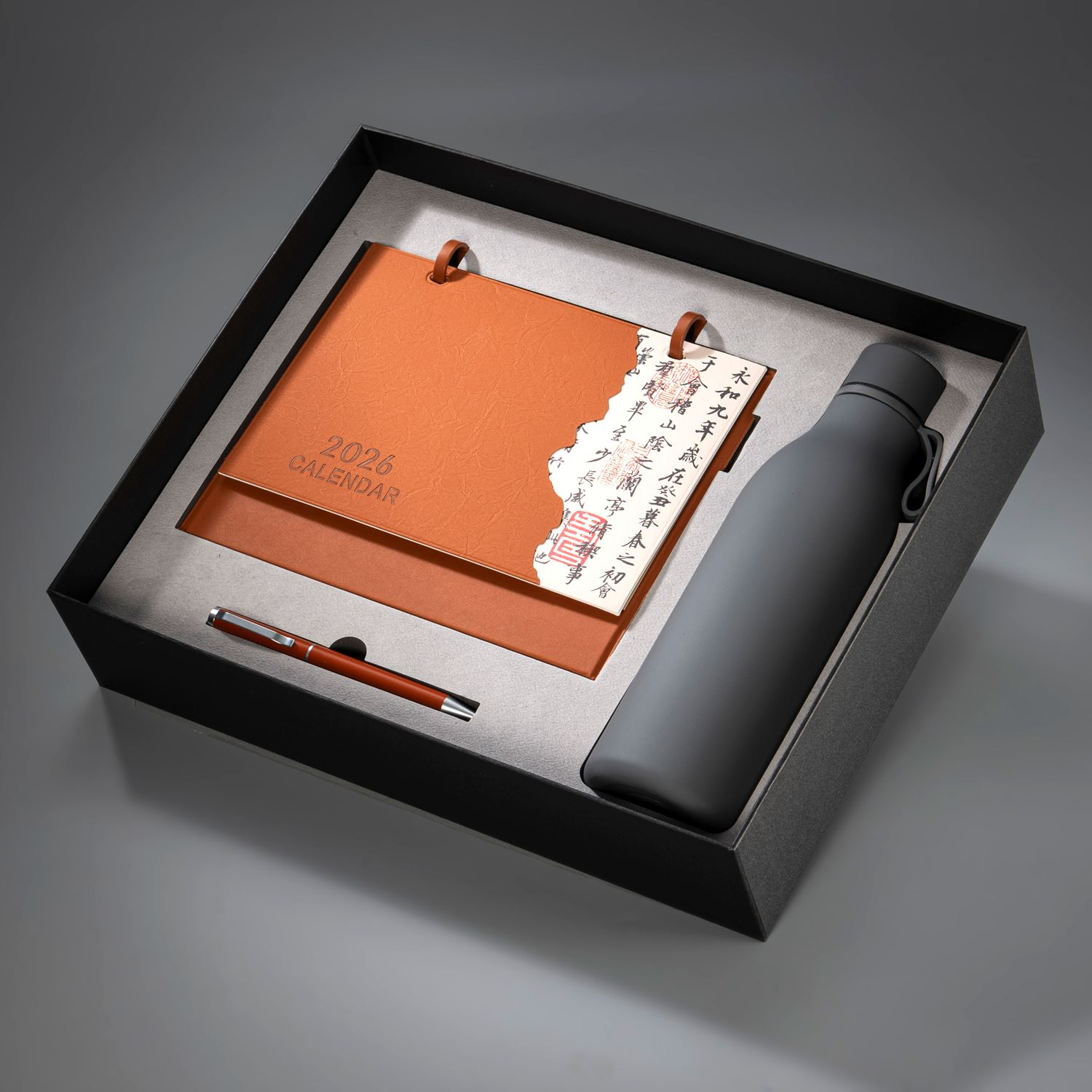 配置清单:配置:金属烤漆台历环、12张内页(内容有可书写记录月计划)、皮质台历架、皮质封面(可按要求定制内容)、金属中性笔、保温杯、天地盖礼盒。