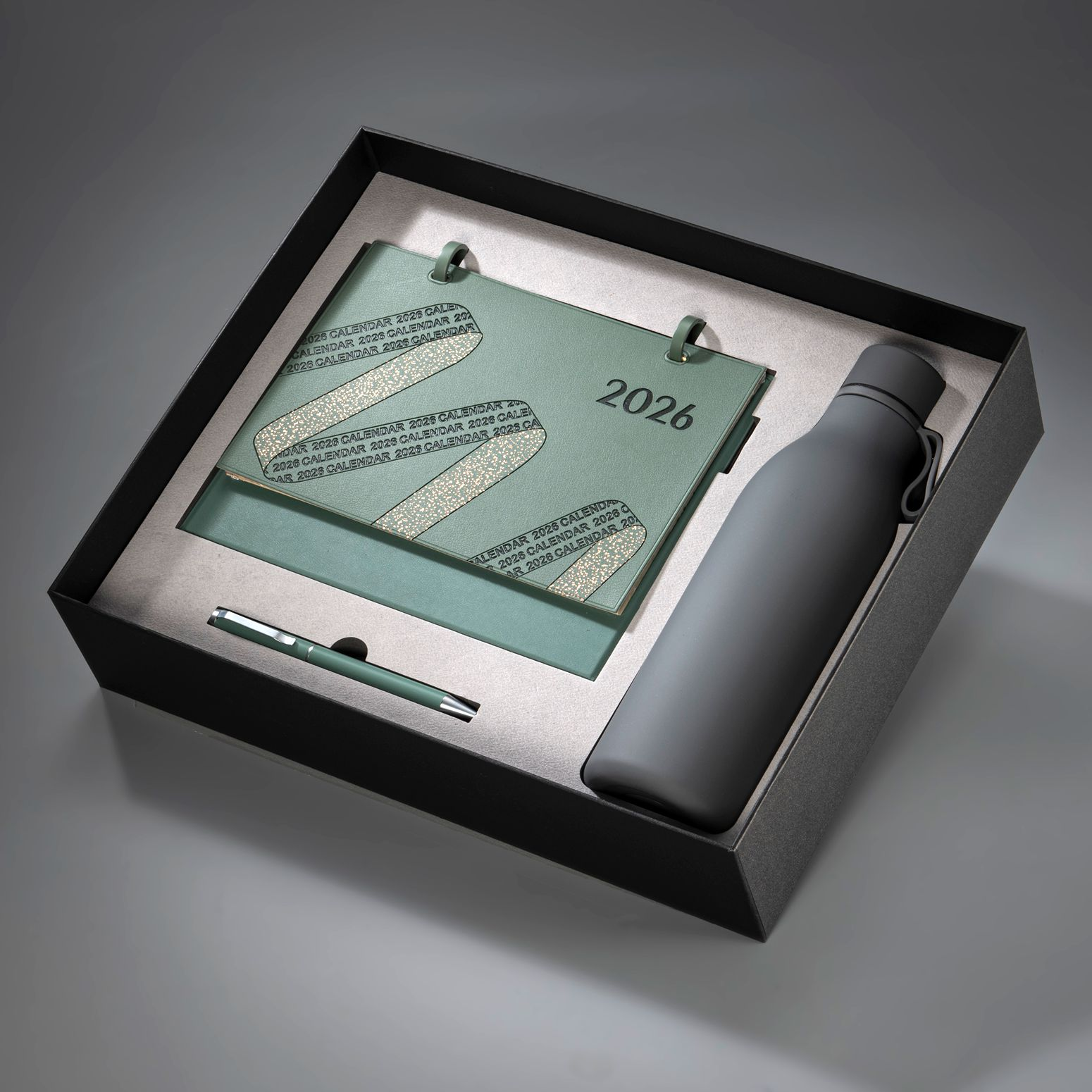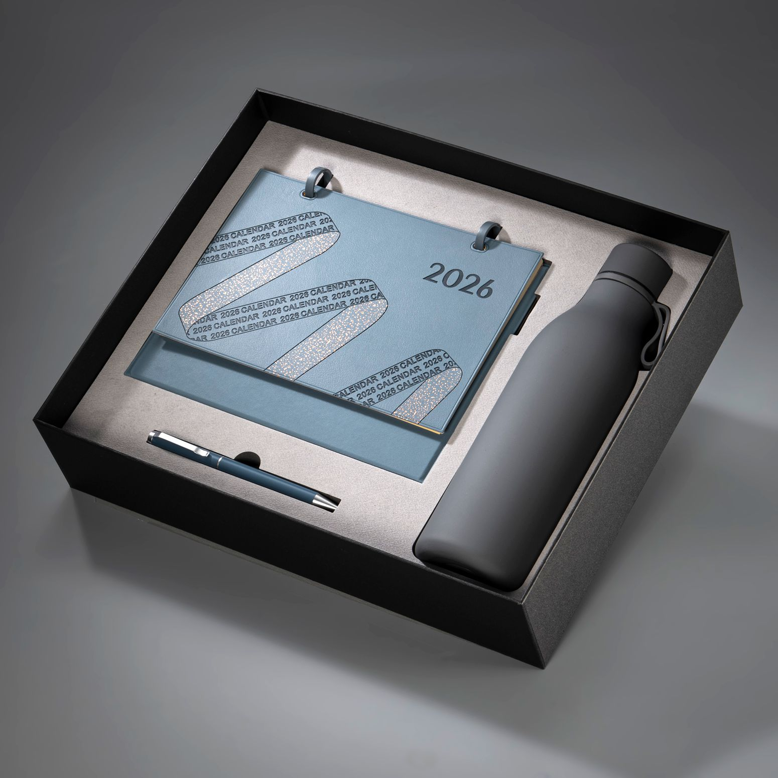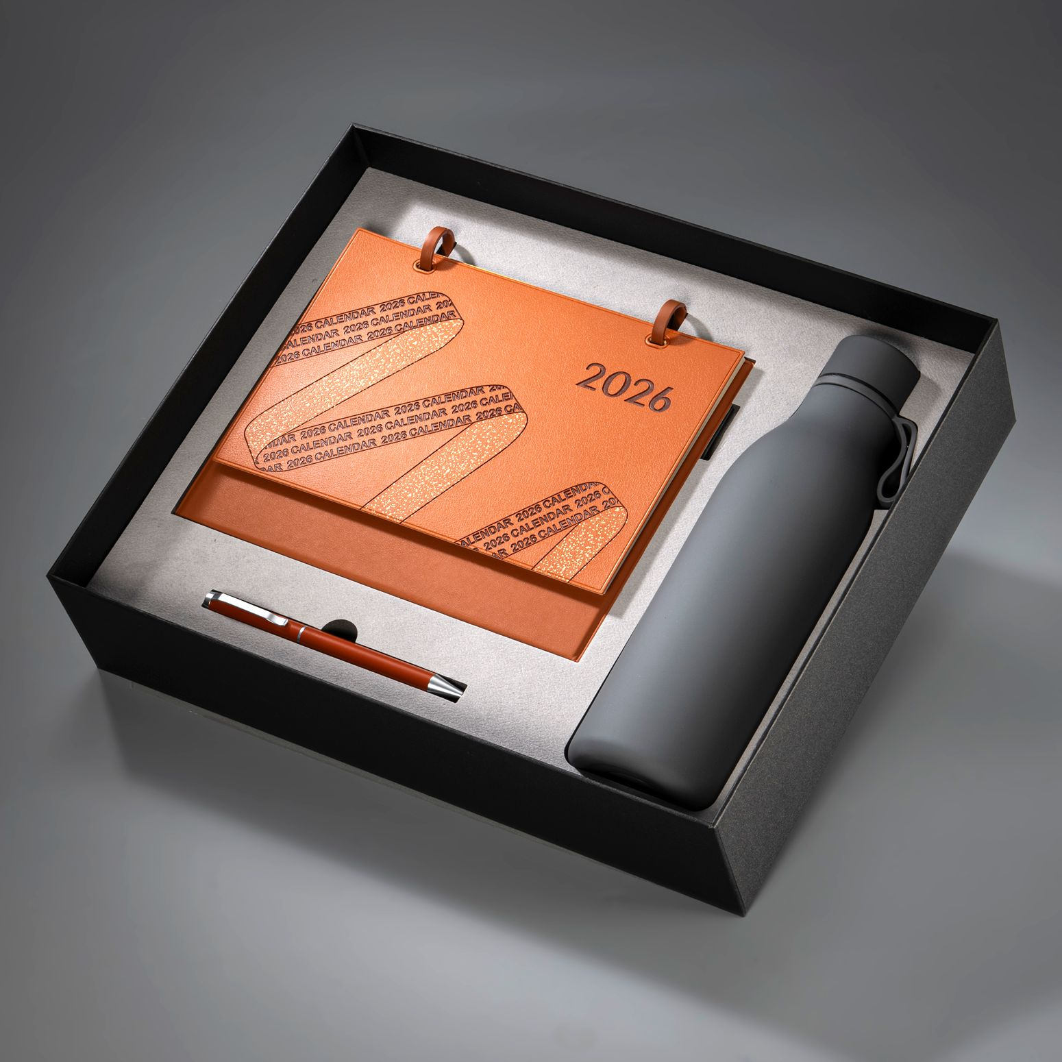 配置清单:金属烤漆台历环、12张内页(内容有可书写记录月计划)、皮质台历架、皮质封面(可按要求定制内容)、金属中性笔、保温杯、天地盖礼盒。