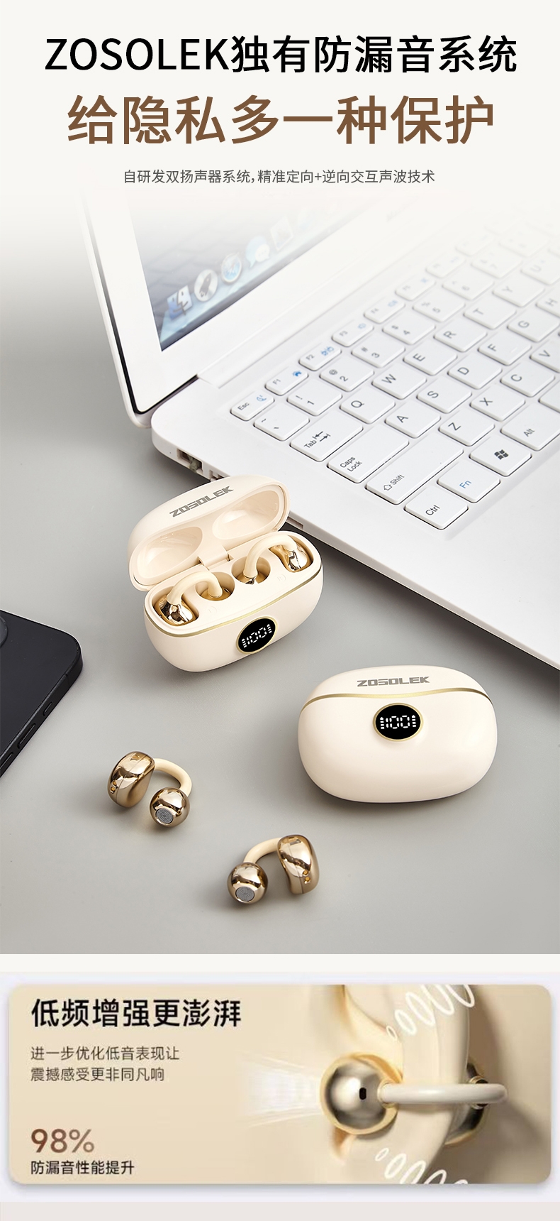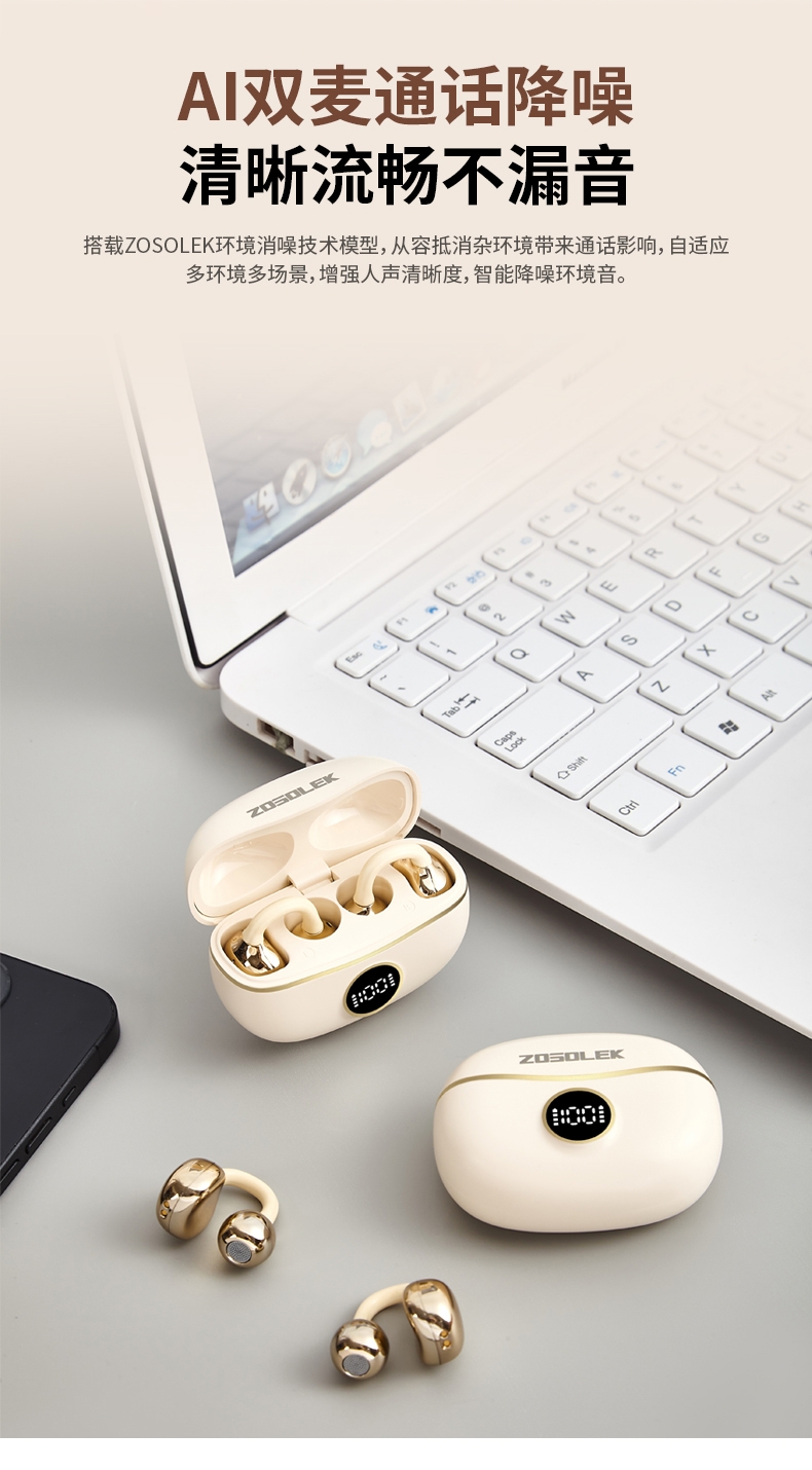 不入耳夹耳设计,亲肤贴合耳部,不挑耳型,云感佩戴;自研发双扬声系统,TD定向传音不漏音,保护隐私;AI数字消噪,ENC通话降噪,双重抗风噪,实现高清