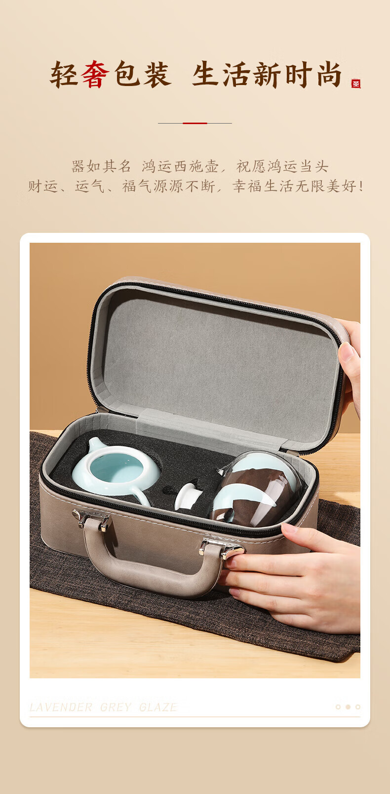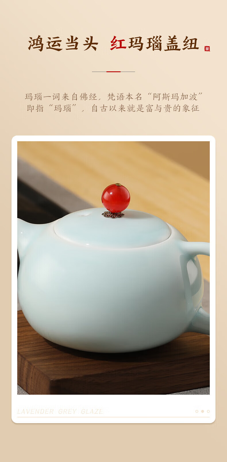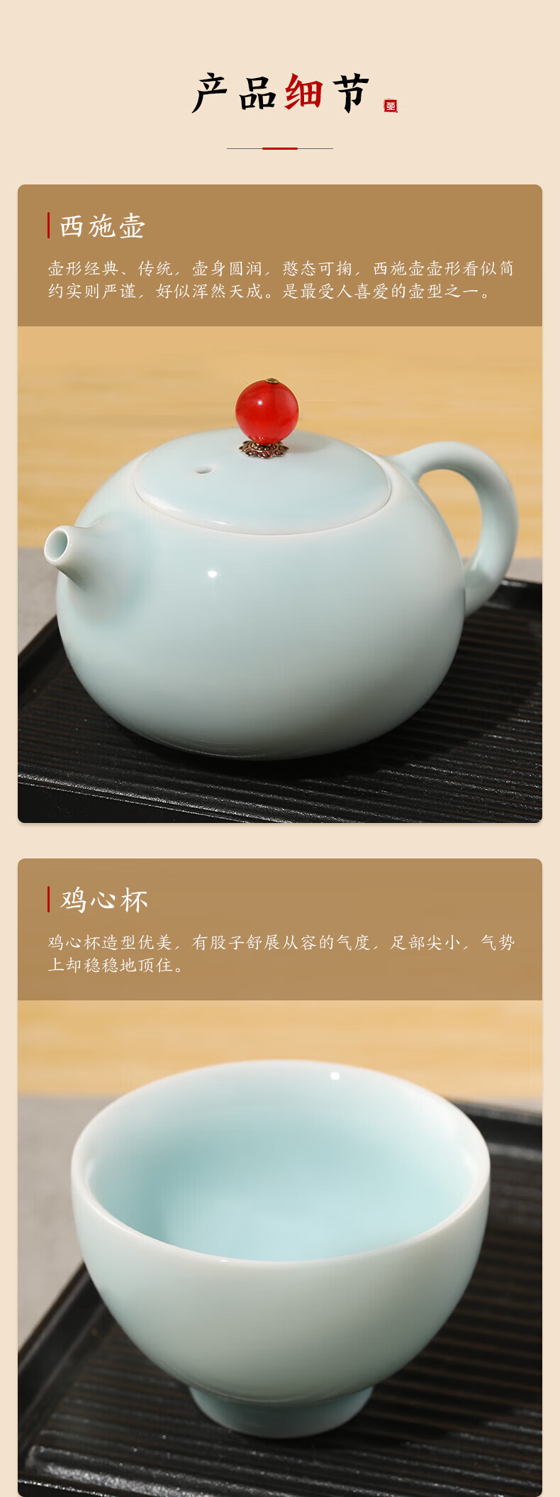 随身便携的茶艺小套装,一套多件,满足日常泡茶需求;传统的粉青釉色,淡雅莹润,如凝厚深沉的玉质美感;鸿运当头,红玛瑙盖纽,有富贵的象征,器如其名