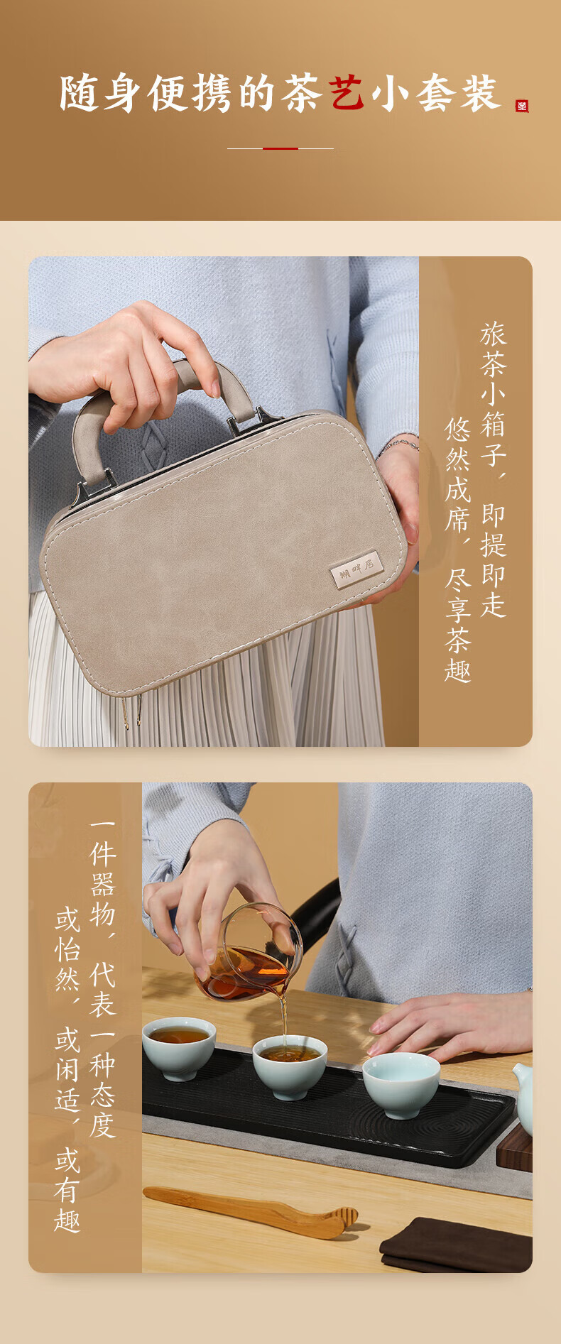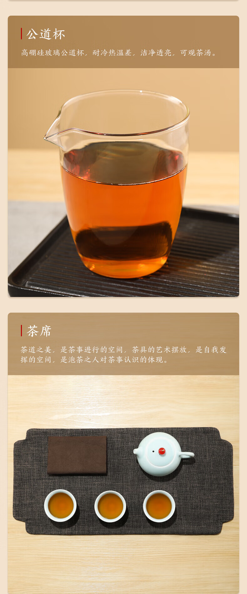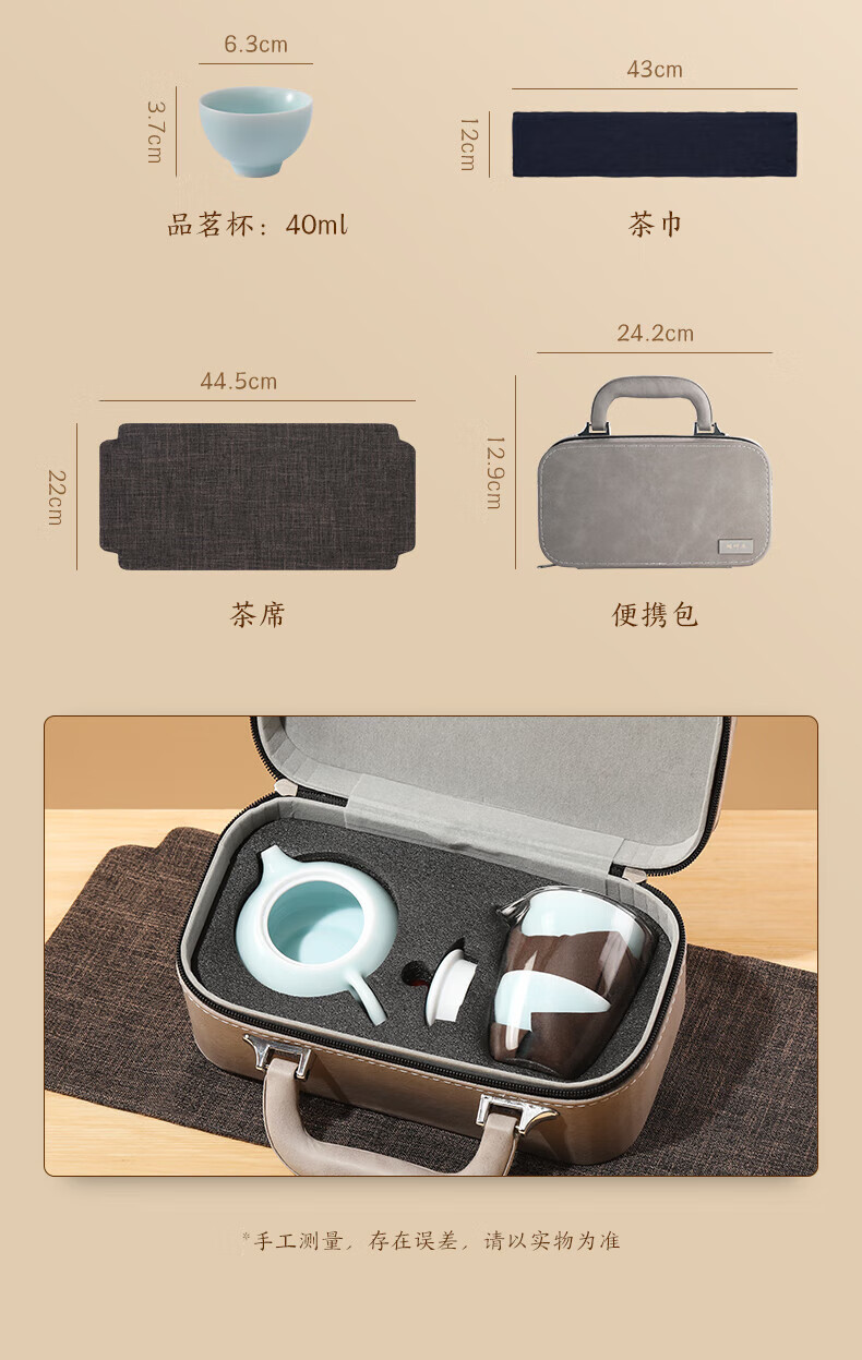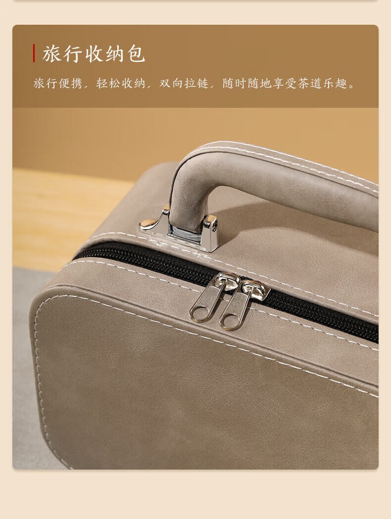 配置:茶壶 * 1(200ml) 公道杯 * 1(200ml) 小杯*3(40ml) 灰色PU包*1 茶巾*1