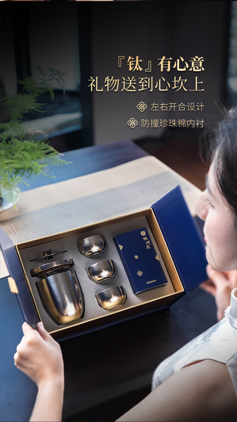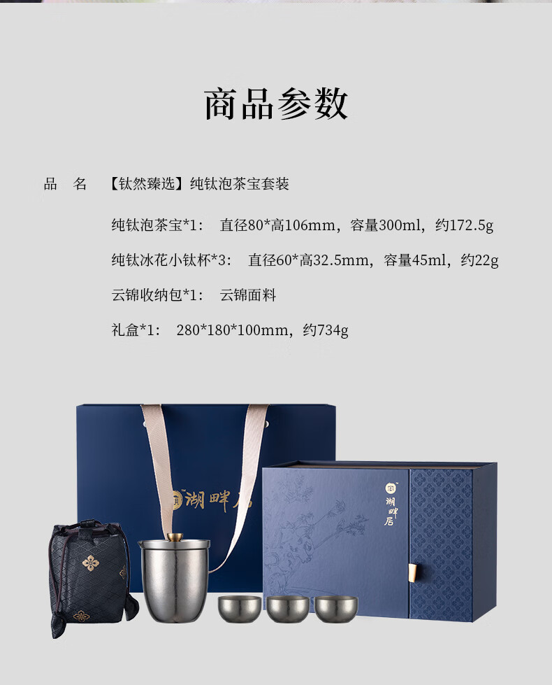 配置:纯钛泡茶宝*1(300ml)、小钛杯*3(45ml), 云锦收纳包*1