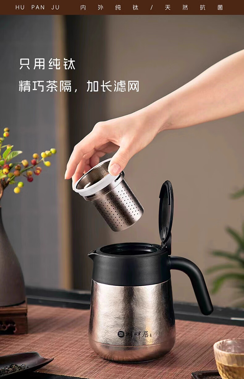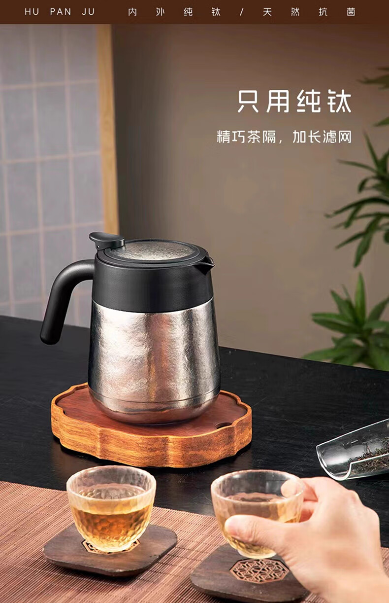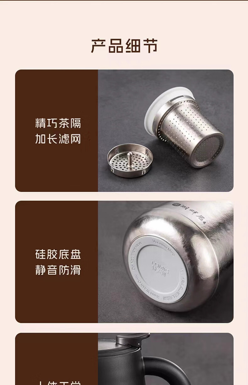 内外纯钛,天然抗菌,健康护航;精巧茶隔,加长滤网,只用纯钛;硅胶底盘,静音防滑